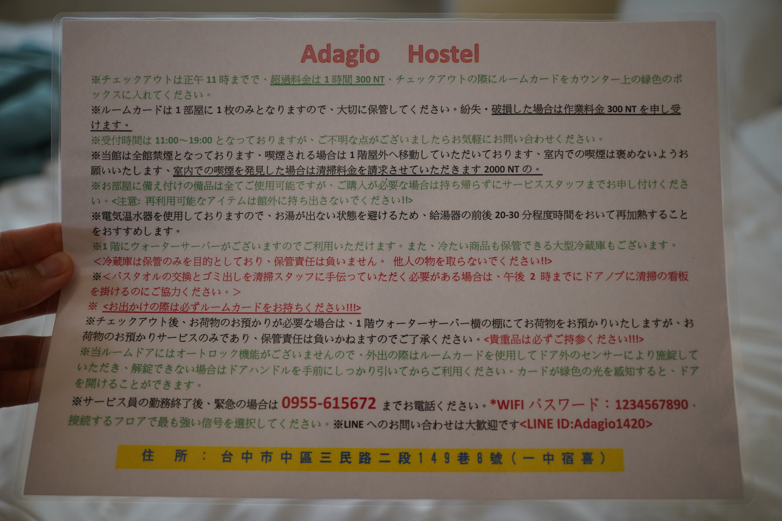 台中で3泊したのは台中鉄道駅から近いAdagio Hostelという宿だった。このホテルは格安だったのにめちゃくちゃ質がよくて、自分はホテル選びが上手だと心の中で自画自賛してしまった。料金は食事なしの個室3泊で2094台湾ドルだから11000円くらい。