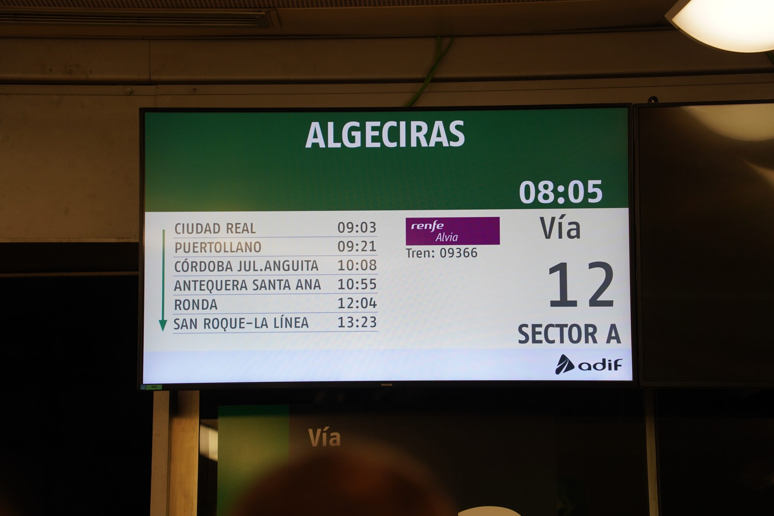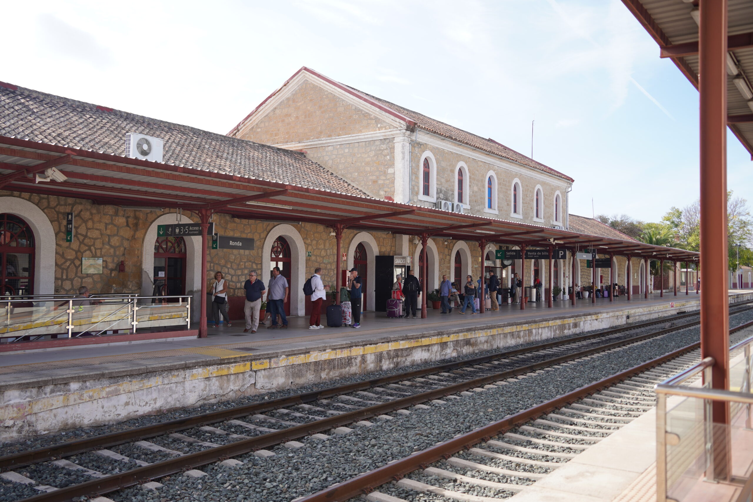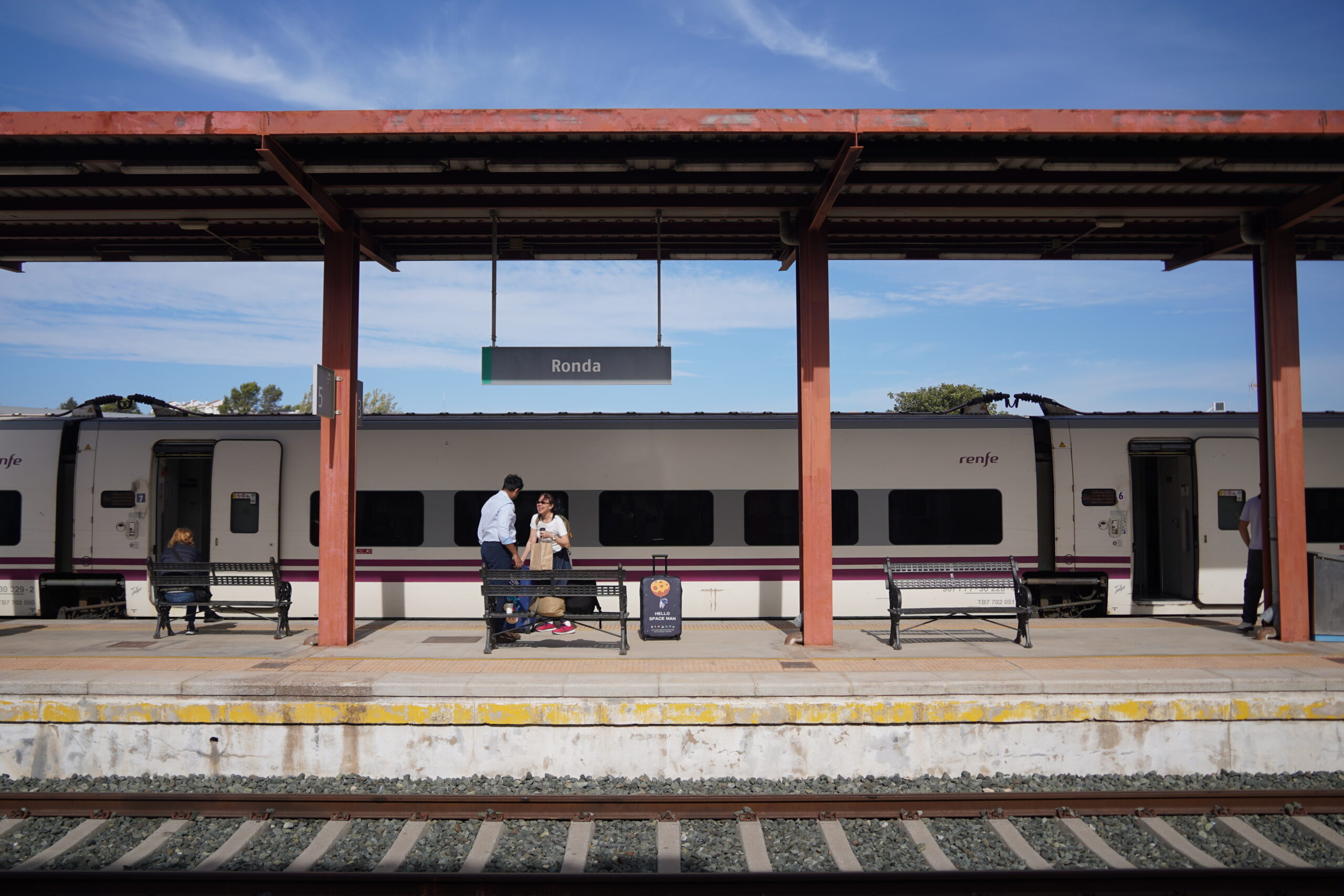 急いで地下1階まで下がって何とかゲートを見付け、係員にこの場所で合っていることを確認してから中へ入った。中へ入ってもいくつものホームへの入り口があり、電車が出る直前まで電車に乗れない仕組みになっていたので、自分が本当に正確なホームで待っているのか最後まで不安だった。電子掲示板に自分の時刻の電車のホーム番号が出るが、それも直前まで出なくてさらに心配な気持ちになった。結局正確な場所で待っていたので電車出発の直前に電車に入ることができ、無事アトーチャ駅を出発することができた。そこからは遅延もなく、時刻通りにロンダへと到着した。