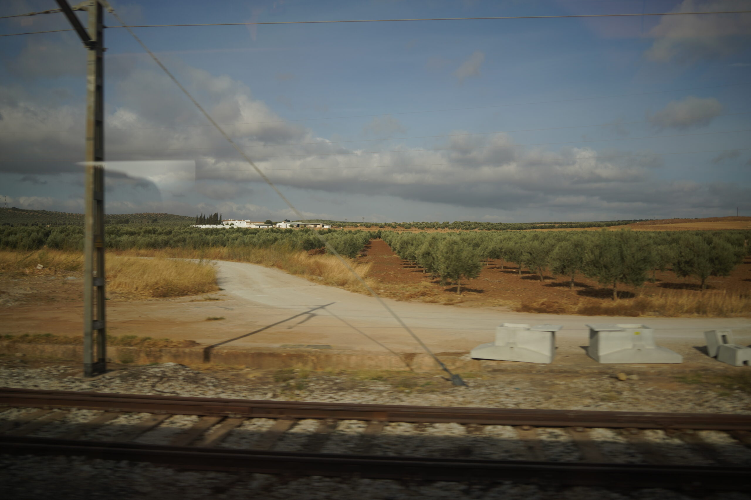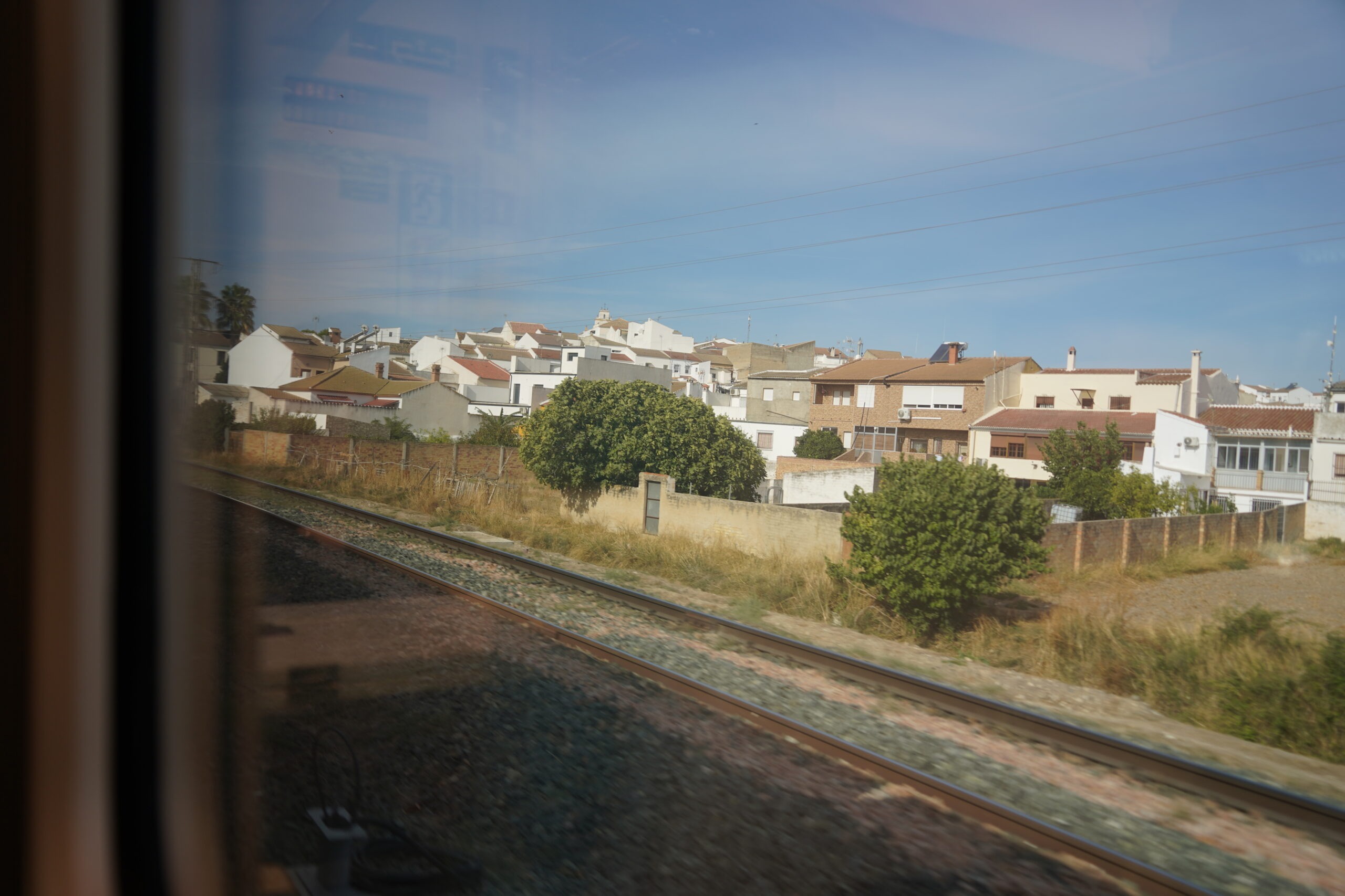 マドリードからアンダルシアのロンダまでの車窓の風景。日本から持ってきていたたけのこの里を食べて空腹を癒した。座席は隣の人もいなくてかなり空いていて快適、白い家が立ち並んでいる風景はまさにアンダルシアにやって来たという気分が高まった。