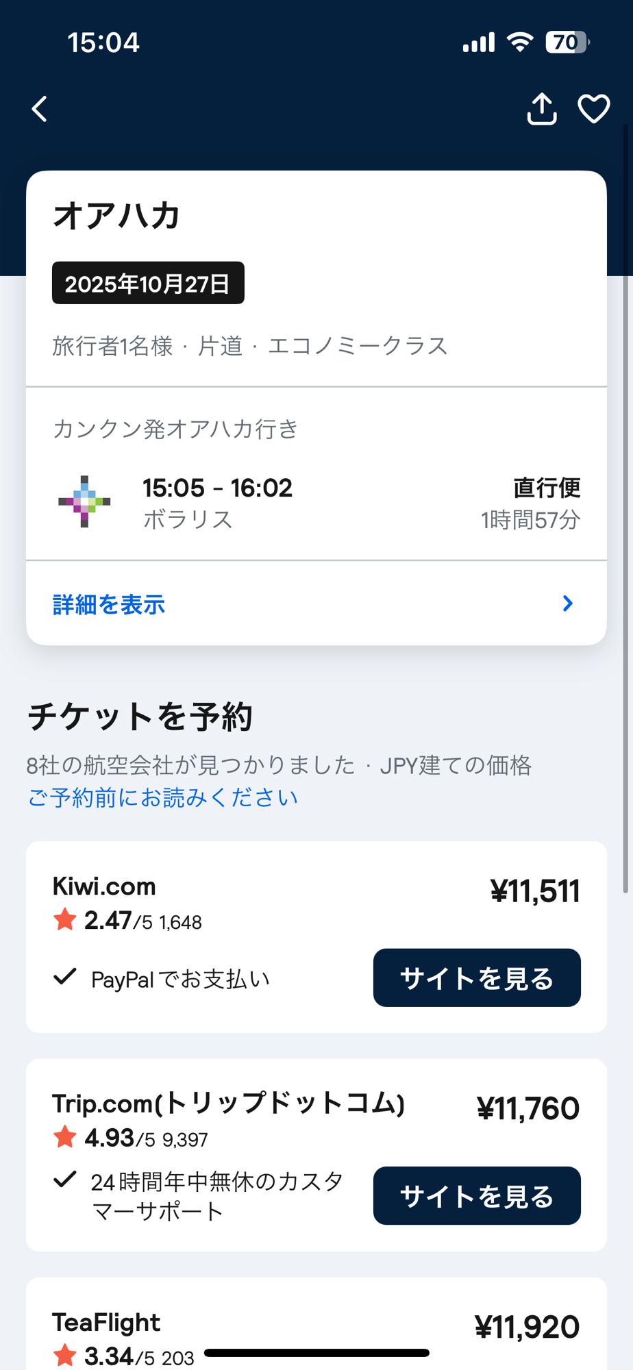 本当にこの値段で取れるのか半信半疑ながらも、この絶好の機会を絶対に逃してはいけないと即座に行動したぼくは、Skyscannerから安定と信頼のTrip.comまで飛び、本当に11000円(手荷物を入れて17760円)でメキシコのLCCであるボラリスの直行便を予約することに成功した!そして無事に発券された。