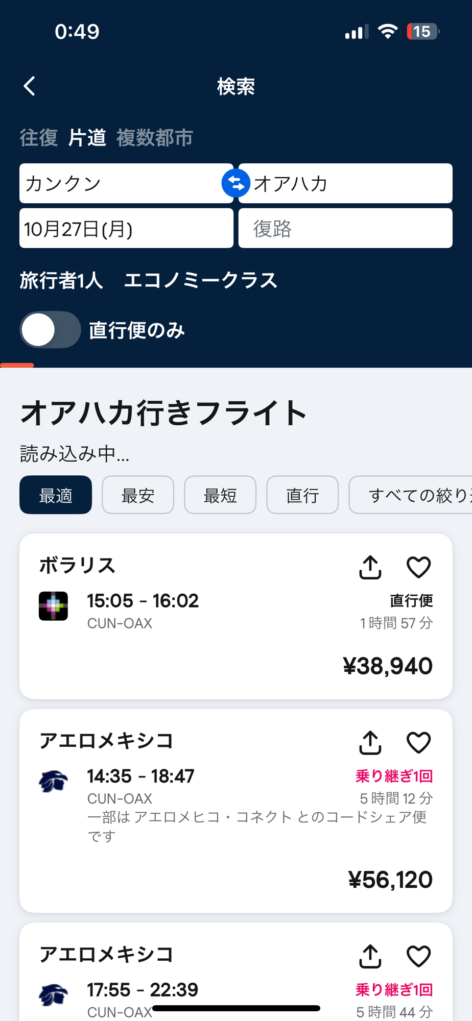 そんな時に奇跡が起きた!何と普段は38000円(荷物抜き)する10月27日のカンクンからオアハカへの直行LCCチケットが、何かの弾み(バグ?)でその時だけ11000円に値下がりしていたのだ!え!そんなことある?!一体なぜ?これ絶対壊れてるよね?