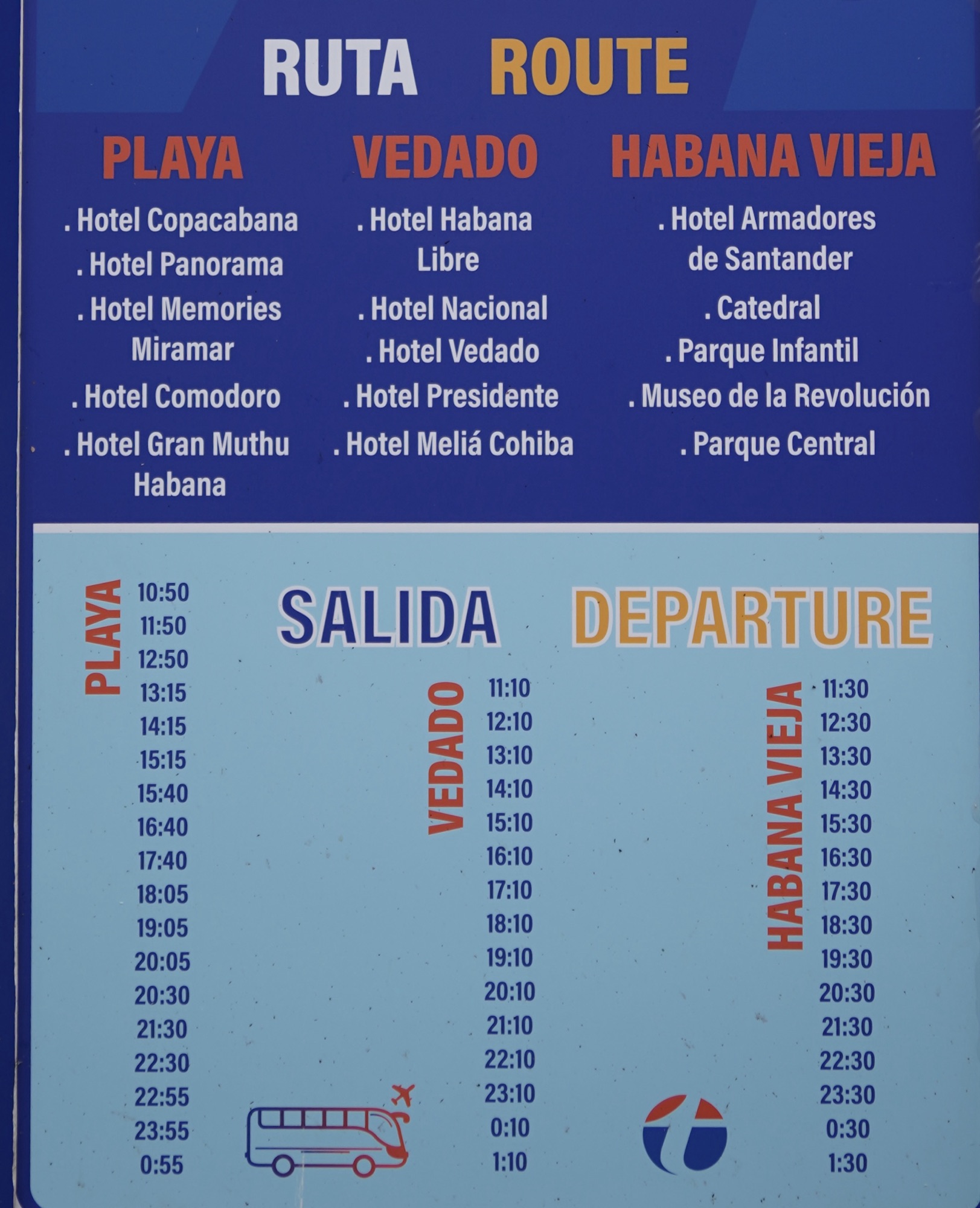 空港から市内までの5ドルバスには「PLAYA」「VEDADO」「HABANA VIEJA」という3つのルートがあった。それぞれのルートの具体的停車場所と時刻表は以下の通りだ。ぼくは事前に下調べをしていたので、この3つのルートのうち「HABANA VIEJA」の路線に乗って宿泊場所から近い「Hotel Armadores」で降車すればいいと心得ていた。