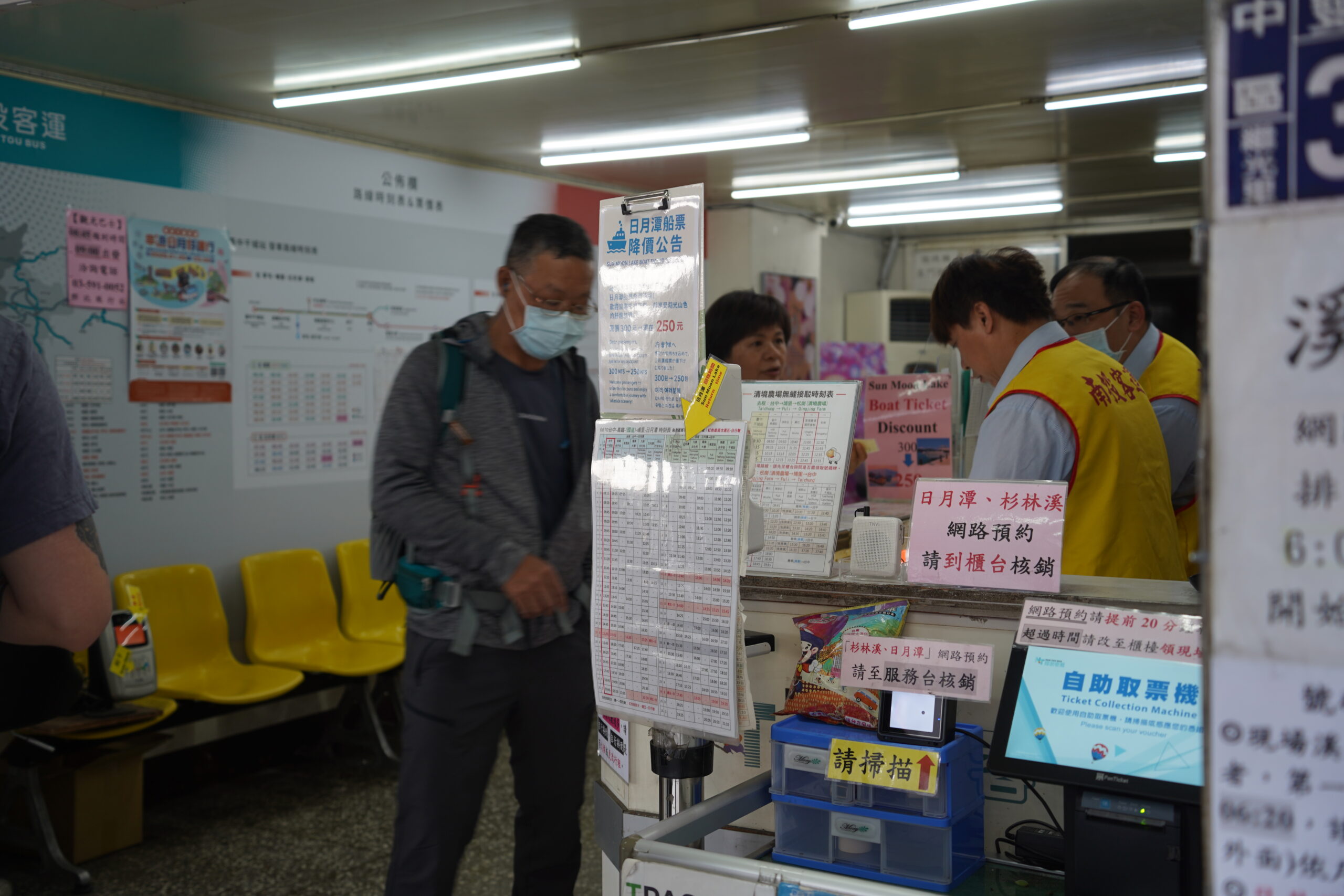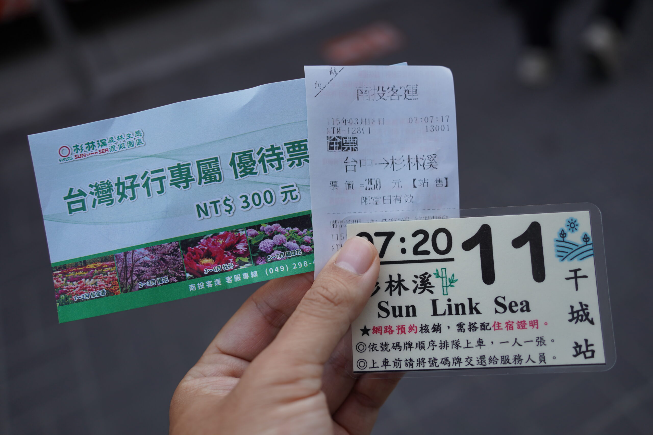 杉林渓行きのバスには悠遊カード(日本のSuicaみたいなカード)が使えるが、事前にチャージしておこう。片道220台湾ドルだったので往復440ドルは必要。さらにこれに加えてまず南投客運のカウンターで杉林渓の区域内へ入場するためのチケット300台湾ドルも支払わなければならなかった。しかしこれは南投客運の優しさで、本来なら現地で350ドルするところを南投客運で買うと優待として300ドルに値下げしてくれる仕組みだったらしい。これは絶対に事前に南投客運のカウンターで買っておいた方がお得!