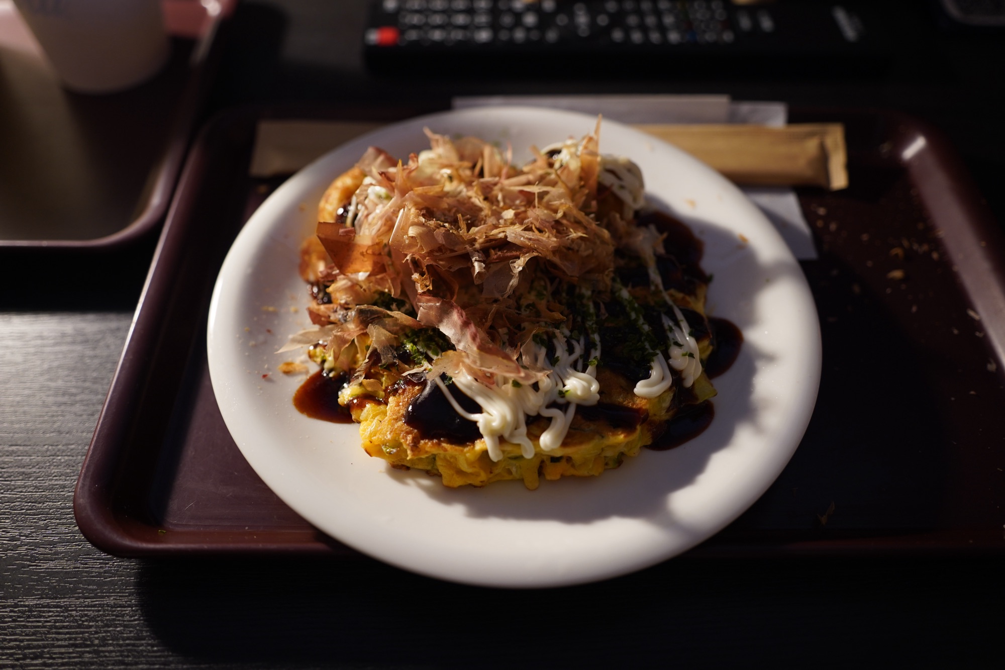 プライオリティ・パス利用者は(A)食事1つ(B)缶ビール2つ(C)シャワーの3つの選択肢のうちから2つ選ぶことができたが、ぼくは食事のみにした。食事もカレーやピラフなど様々なメニューから選ぶことができたが、ぼくは大阪らしいお好み焼きとたこ焼きのセットにした。