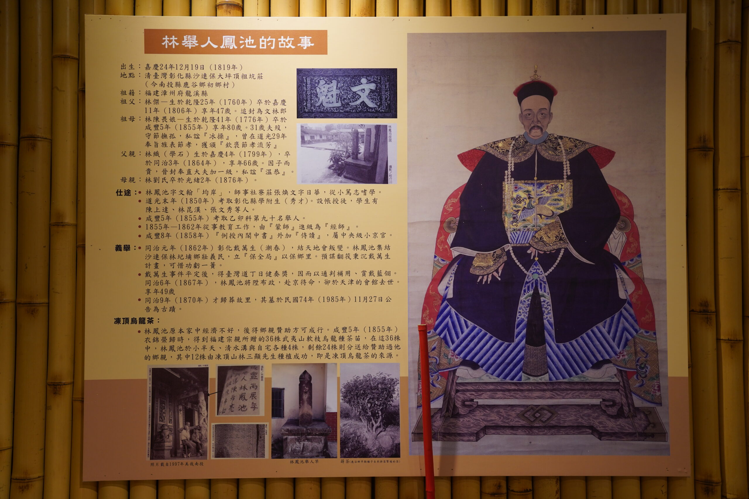 特に興味深かったのは凍頂烏龍茶の歴史で、ここ鹿谷で凍頂烏龍茶が作られるようになったのは「林鳳池」という人物の功績によるものだという。清朝時代から鹿谷には野生の茶樹が存在し、種子から自然に繁殖していた。1855年鹿谷の住民であった林鳳池は科挙を受けるために中国本土へと渡り、合格を果たした。そして村人たちへの恩返しとして、彼は武夷山から「青心烏龍茶」の苗木36本を持ち帰った。そのうち12本が凍頂山に植えられ、これが凍頂烏龍茶の起源となった。1980年以降、日本政府は鹿谷で茶樹の更新と植栽奨励事業を実施し、この地域の茶樹の数を増やしたという。