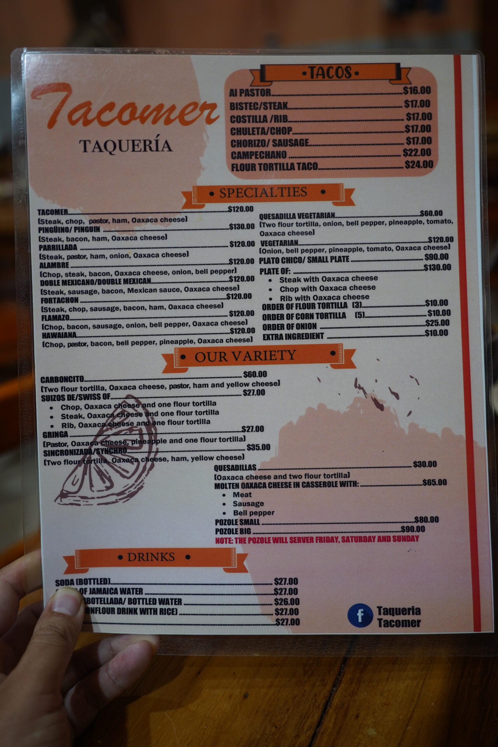 Taquería Tacomerのメニューはこんな感じ。タコスは16〜17ユーロと激安!どれが美味しいのかわからないので安いし上から順番に注文していった。