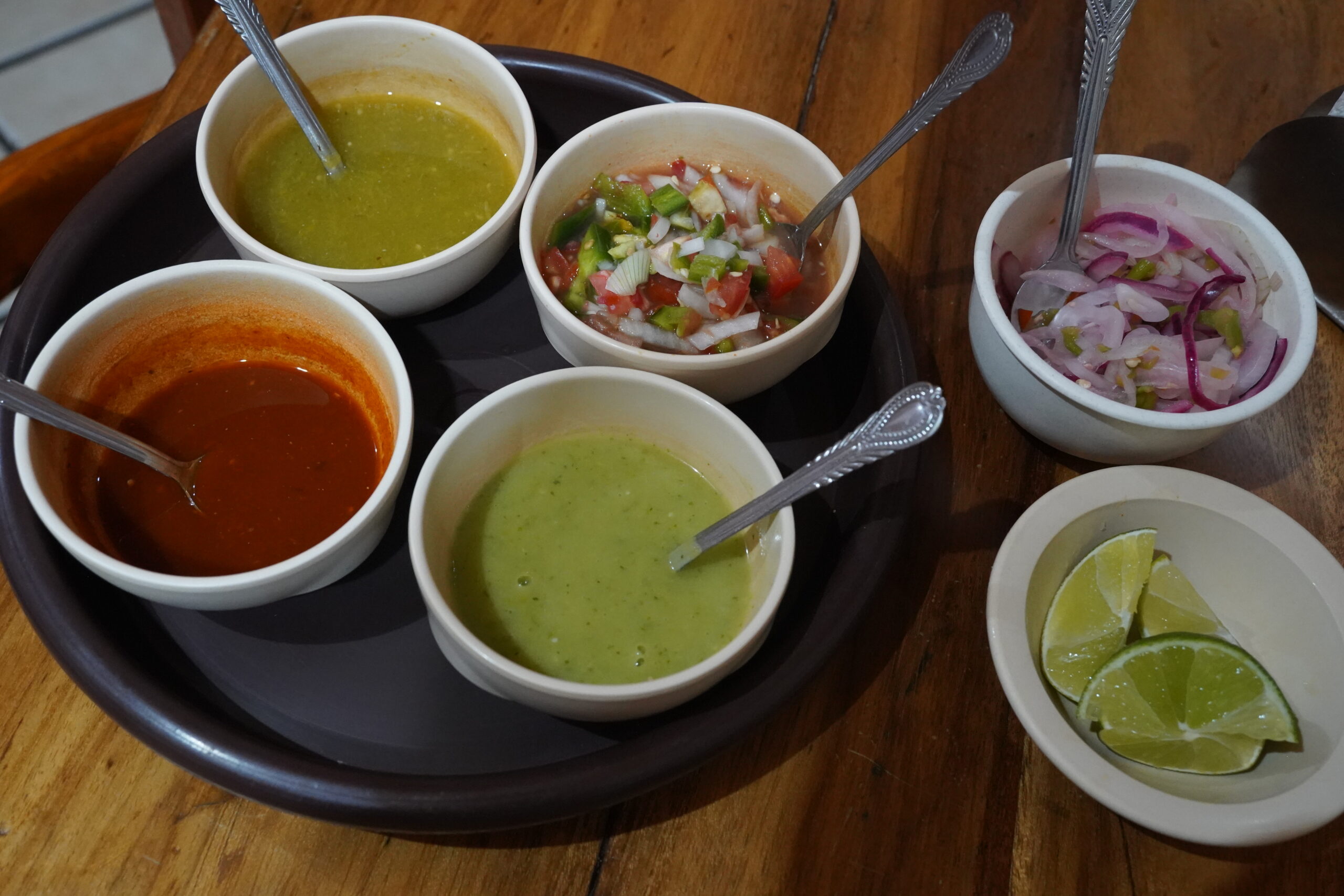 メキシコでタコスを注文すると必ず出てくるカラフルなスパイス達、これを自分好みの味になるように加えるとさらに美味しさがさらに際立つ。こういう経験は、タコスというメキシコの食文化に直に触れているような感覚になって楽しい。ぼくは辛いのが苦手だがこのシステムだとほんのちょっとだけ自分好みの量のスパイスをかけたりして美味しくできるので満足感が高かった。