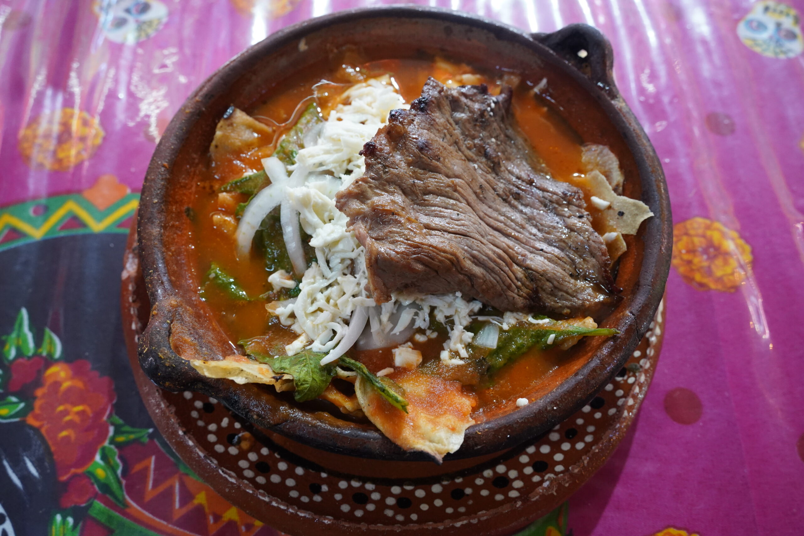 まずぼくが街外れのメルセー市場で最初に食べたのはSopa de Tortillaというスープで、日本語にするとトルティーヤのスープ。トマトベースのスープに揚げたトルティーヤが浮かんでおり、ぼくは牛肉もトッピングしてみた。トルティーヤとはメキシコ料理で最も有名なタコスを包んでいる皮の生地で、とうもろこしや小麦で作られている。オアハカらしくオアハカチーズも乗っていて、見た目が華やかですごく美味しそう!