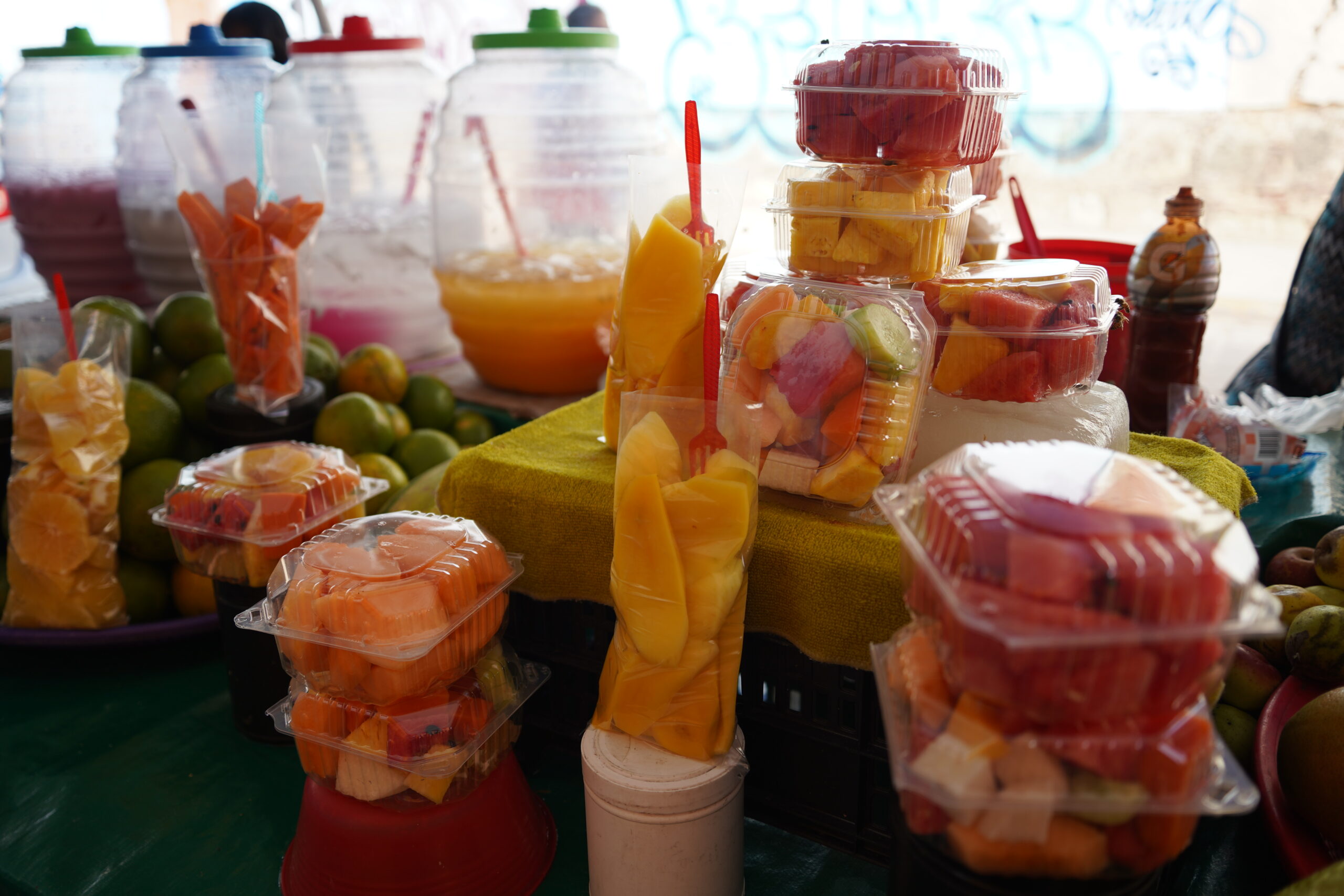 メキシコの郷土料理は基本的に塩辛く、ピリ辛で、クセが強いことがわかってきたが、そんな中でもオアハカでシンプルで美味しい食べ物を見つけることもできた。ぼくが毎日買って食べていたのは路上のフルーツ!皮を剥いてくれているので食べやすく、フルールだから世界中どこでも味は同じで新鮮で美味しい!このパックひとつが35ペソ(300円くらい)だったので、びっくりするほど安いわけではないがリーズナブルだった。