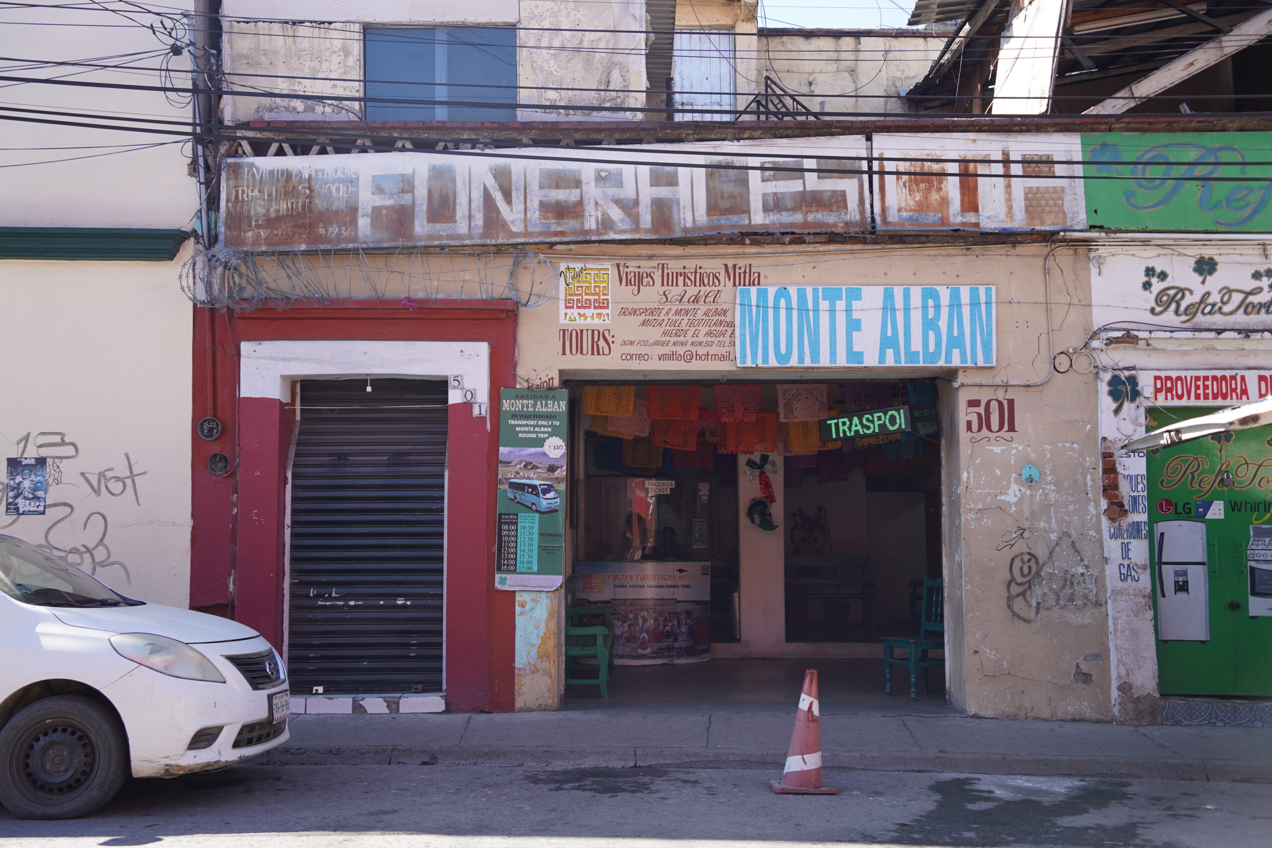 モンテ・アルバンはオアハカの街中からローカルバスを使ってとても簡単に行くことができた。まずはモンテ・アルバン行きのバスが出るTransportaciones Turísticas Mitlaへ向かおう。モンテ・アルバンは有名で代表的な観光地なのでバスが日中のほぼ1時間毎に出ており、チケット売りのおばちゃんも多少の英語を話してくれる。位置情報はグーグルマップで以下の通り。