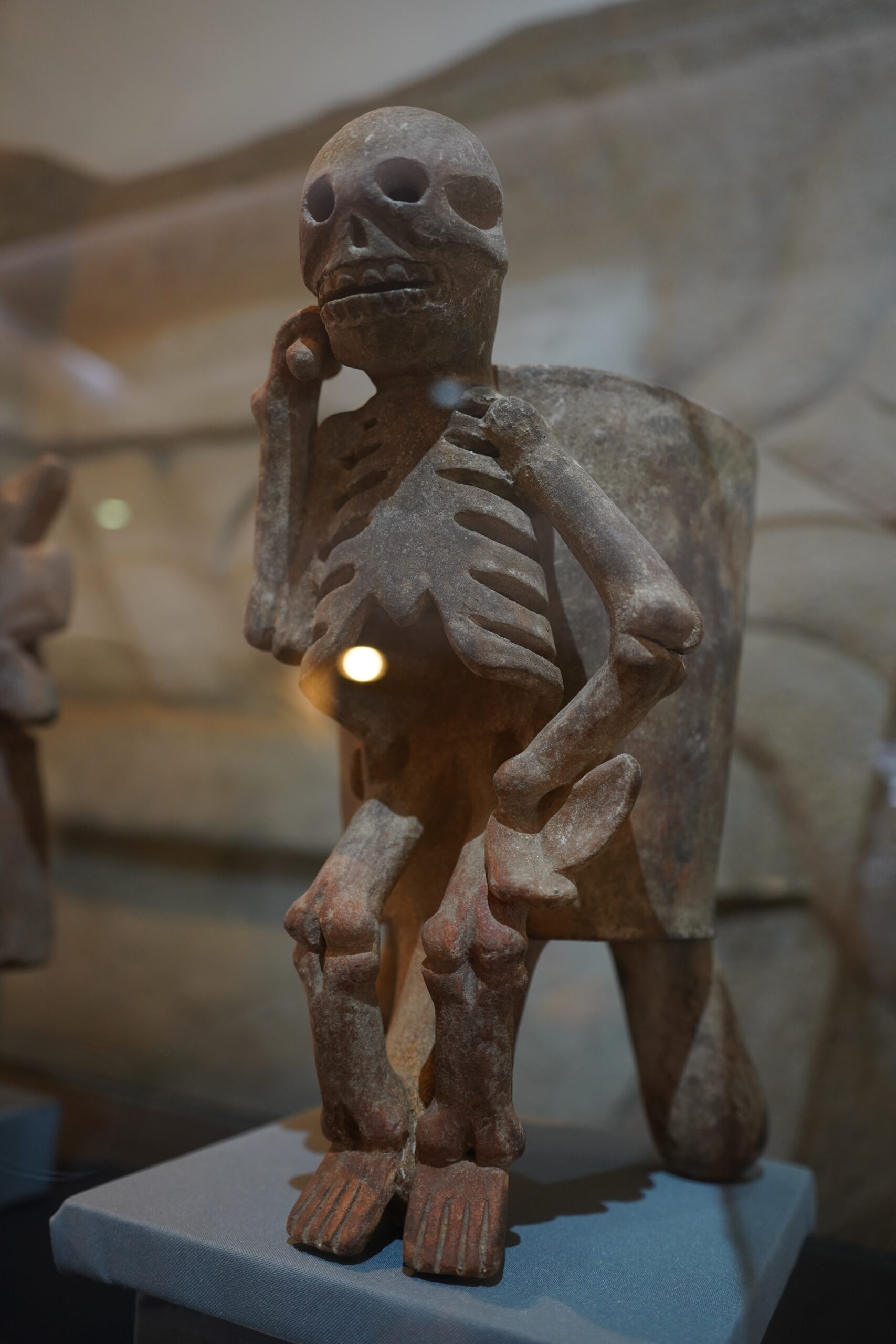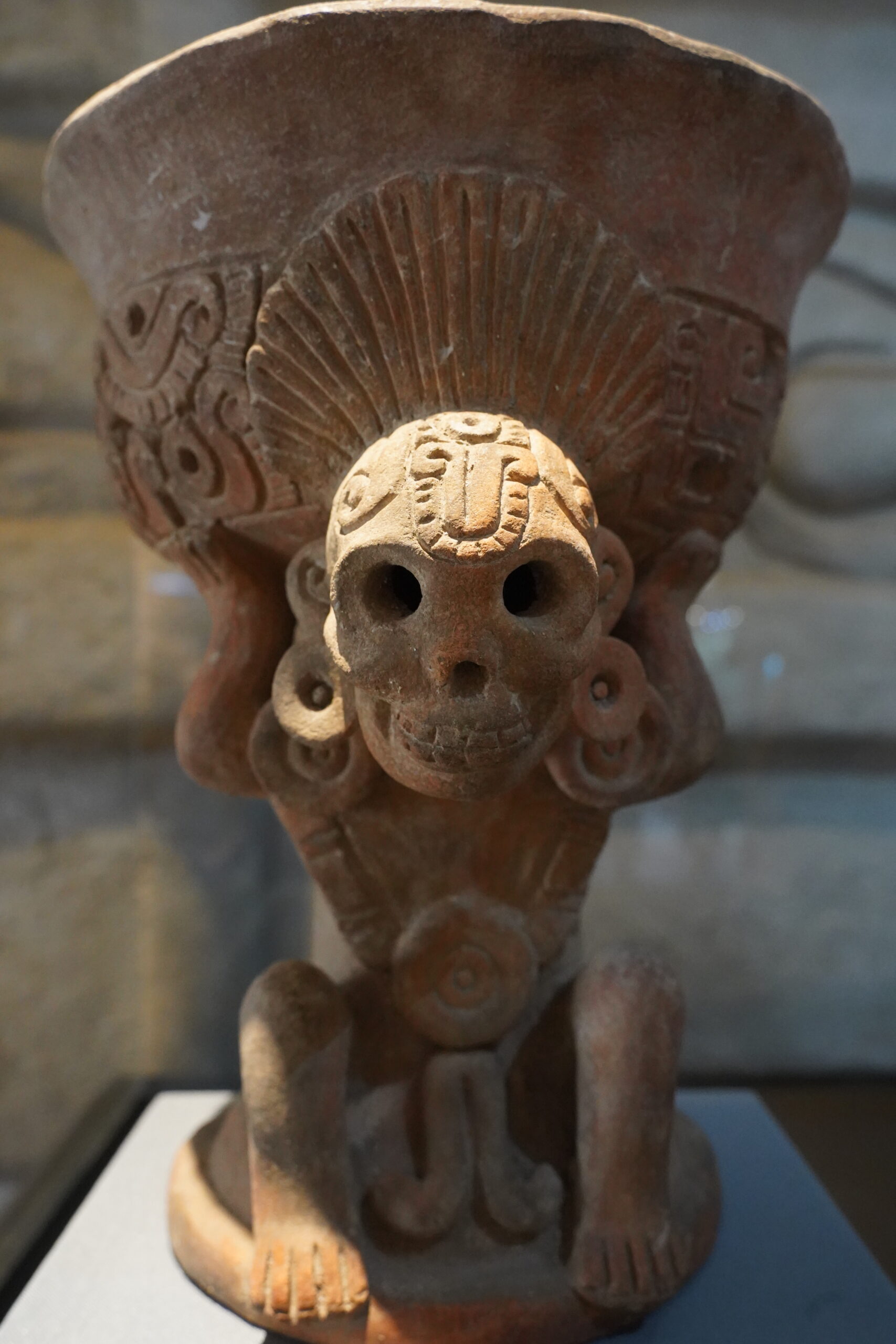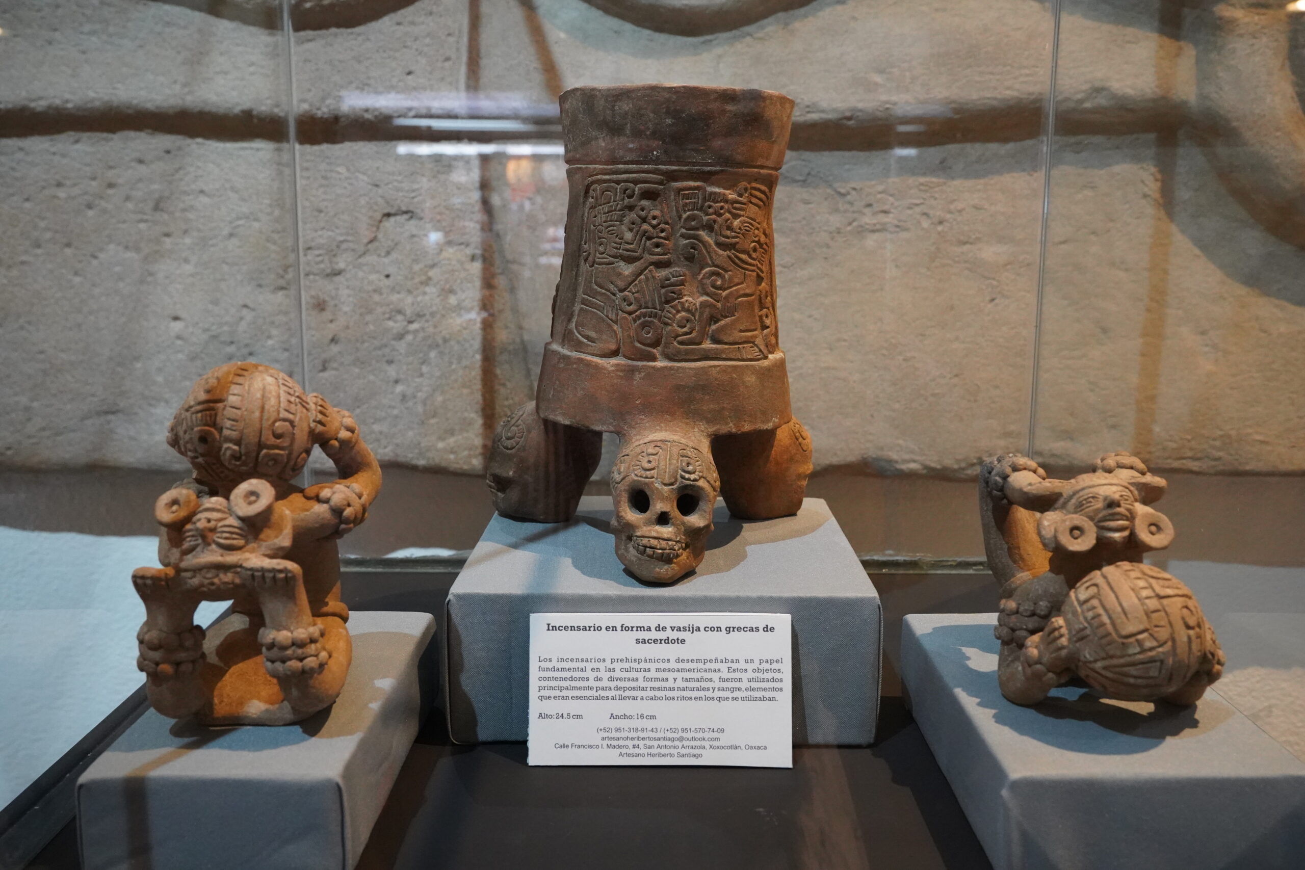 この博物館で感心したのは、古代モンテ・アルバンの作品にはドクロモチーフのものが数多くあったということだ。メキシコと言えばカラフルなドクロのお土産が定番だが、それは有名な「死者の日」にちなんで最近のメキシコ人たちが観光のために無理矢理作り上げた流行だと思っていた。しかし実際には紀元前の古代メキシコの時代からこの大地では人々がドクロに思いを馳せていたのだと思うと、メキシコのドクロのお土産は歴史の深いありがたいものに感じられるのだった。