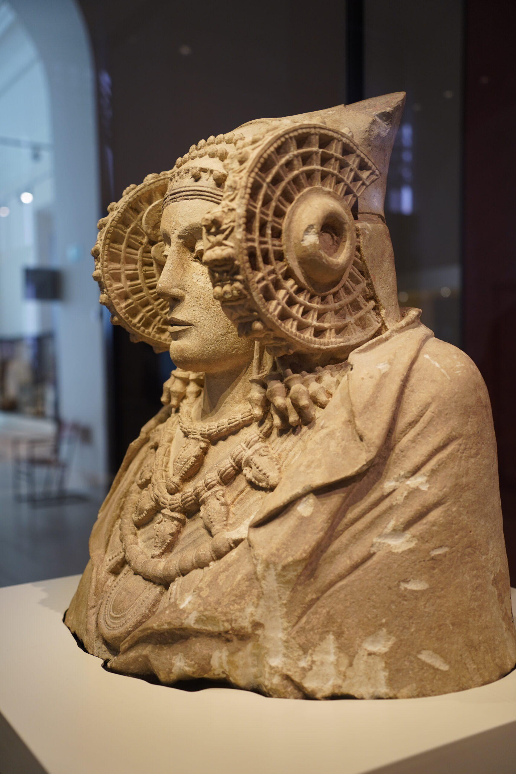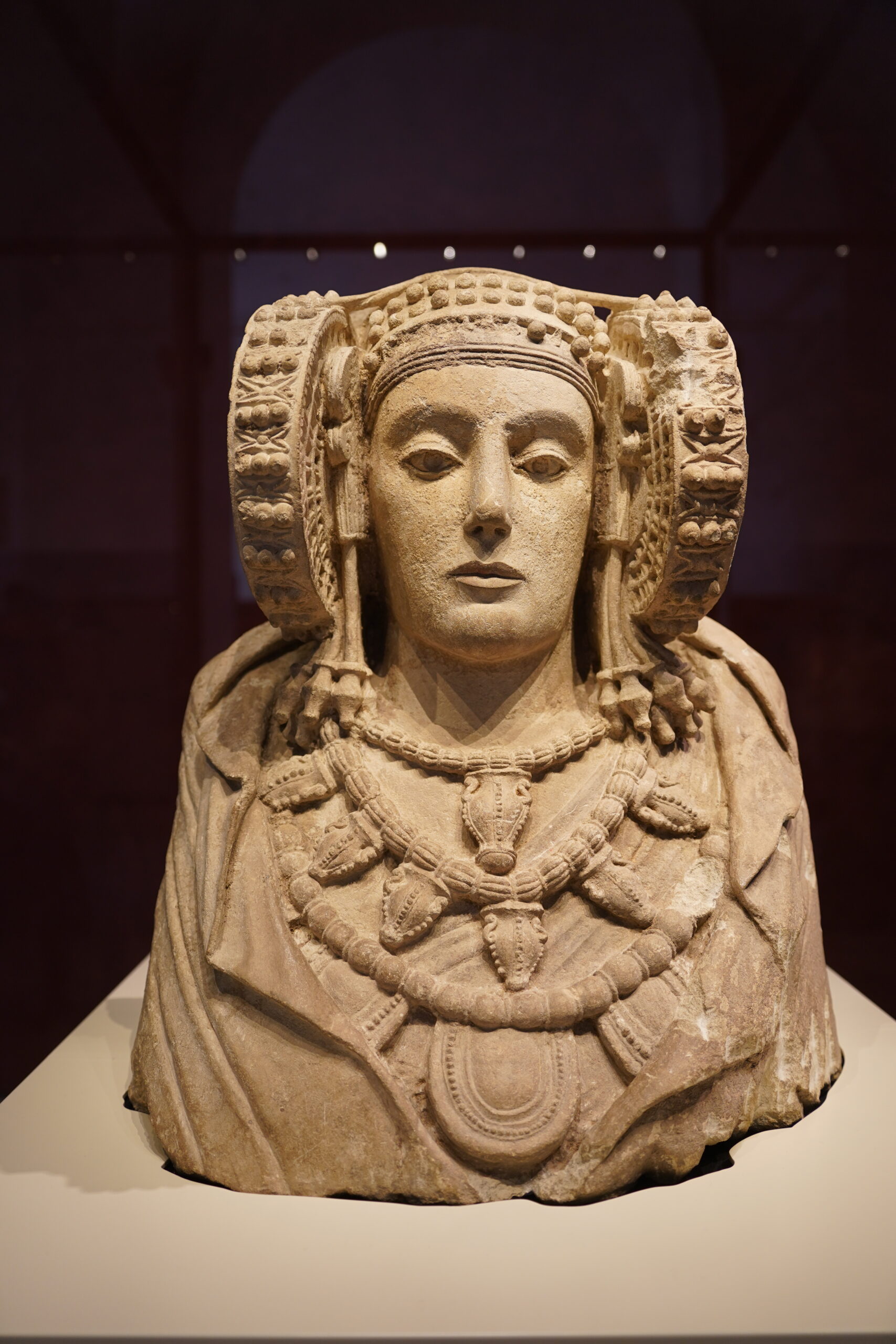 スペインのエルチェ近郊の古代遺跡「ラ・アルクディア」から1897年に偶然発見された石灰岩製の胸像。紀元前4世紀のイベリアの工芸品であり、強いヘレニズムの影響を示唆している。この胸像は元々彩色されており、精巧な頭飾りと顔の両側に大きな車輪のようなコイル(ロデテスと呼ばれる)をつけた女性を描いている。彫刻の後ろの開口部から、埋葬用の壷として使用されていた可能性があるという。