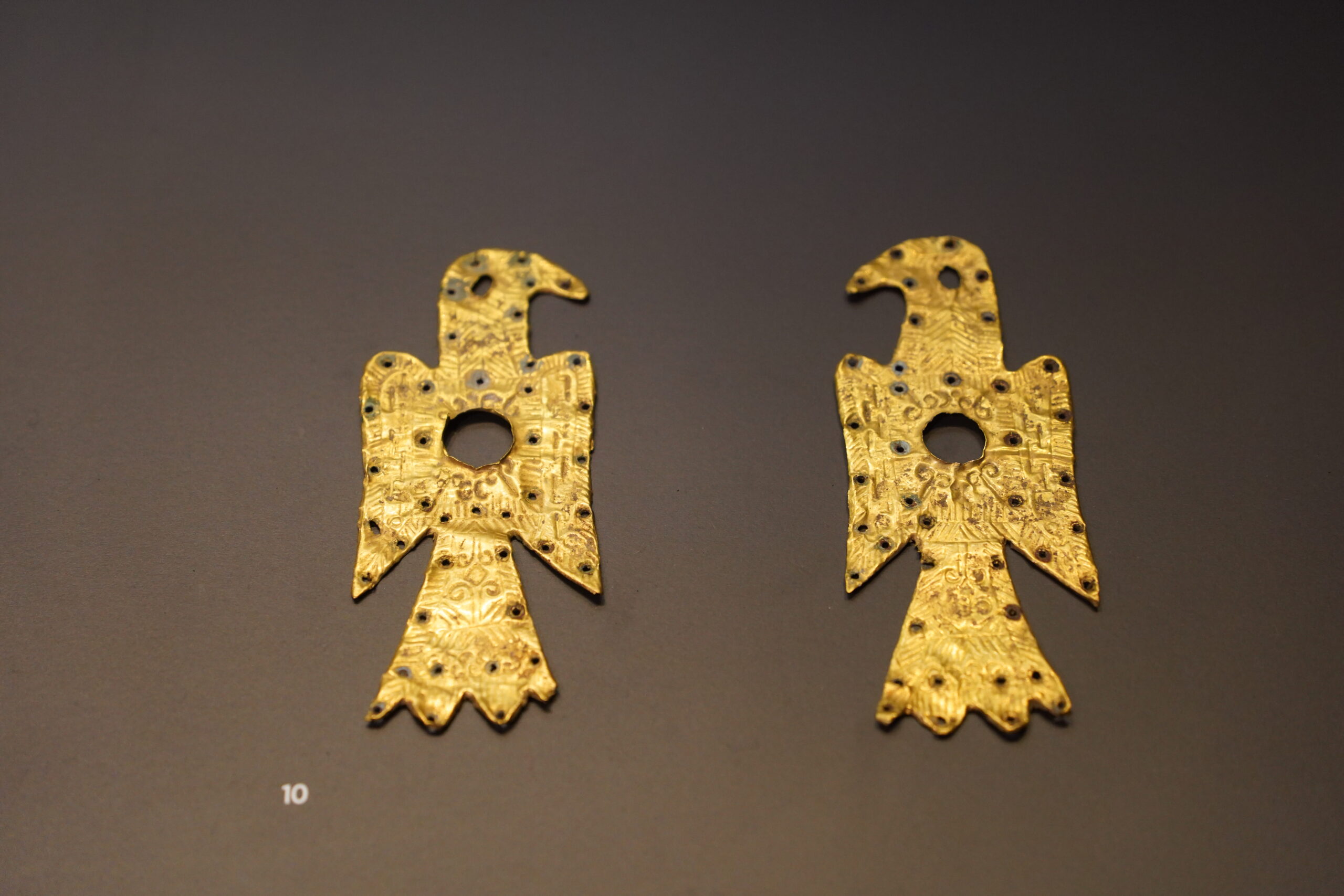 西ゴート時代に人気だった2匹の鷲のブローチ。6世紀頃の金・真鍮製の鷲型のブローチがスペイン各地の墓から出土している。鷲は力・高貴さ・権威・最高存在を象徴する動物として、ゲルマン系を含む古代・中世世界で広く使われており、西ゴートでもこの伝統的な象徴性が利用されていたと考えられる。