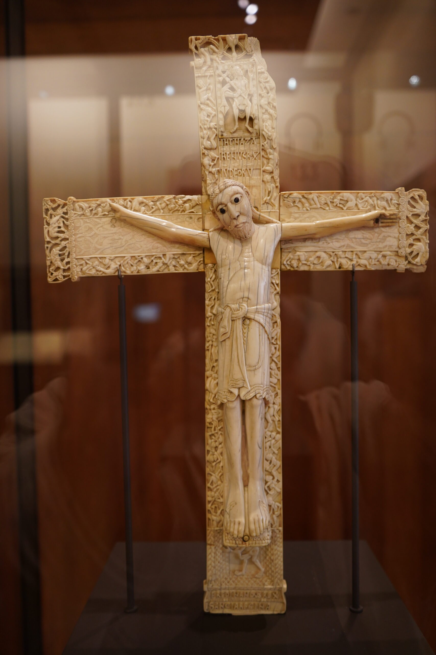フェルナンドとサンチャの十字架像は、1063年頃の象牙彫刻。スペインでキリストの体を描いた十字架像としては、知られている限りでは最古である。十字架の表面には、植物や動物、そして天国へ昇る人間と地獄へ降りる人間が織り交ぜられた絵が描かれている。十字架の上には「IHSNAZA RENUSREX IUDEORU(=ナザレのイエス、ユダヤ人の王)」と刻まれており、四福音書によれば十字架にかけられた銘文である。象牙の碑文の上には、復活したキリストが十字架を背負っている姿が描かれている。