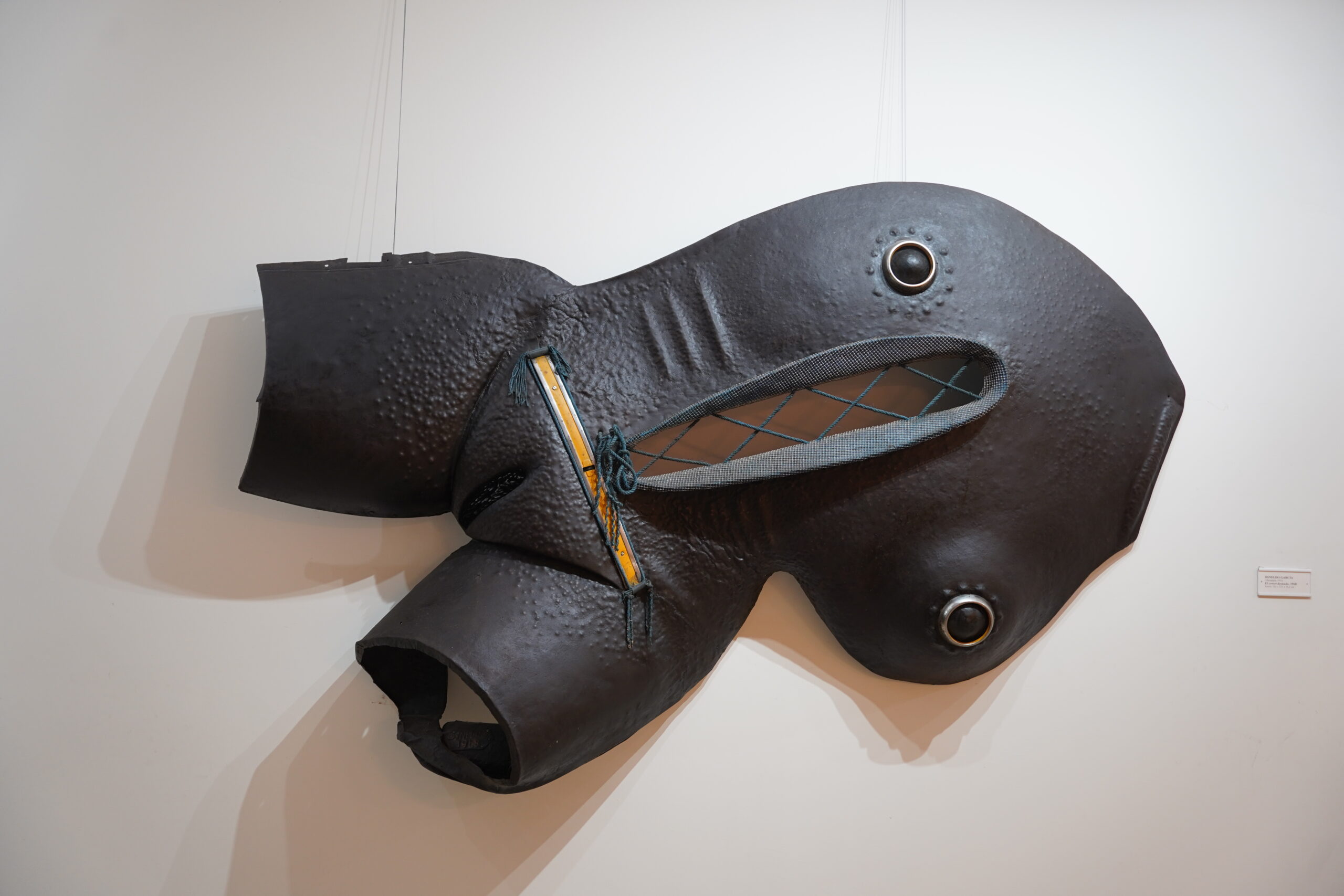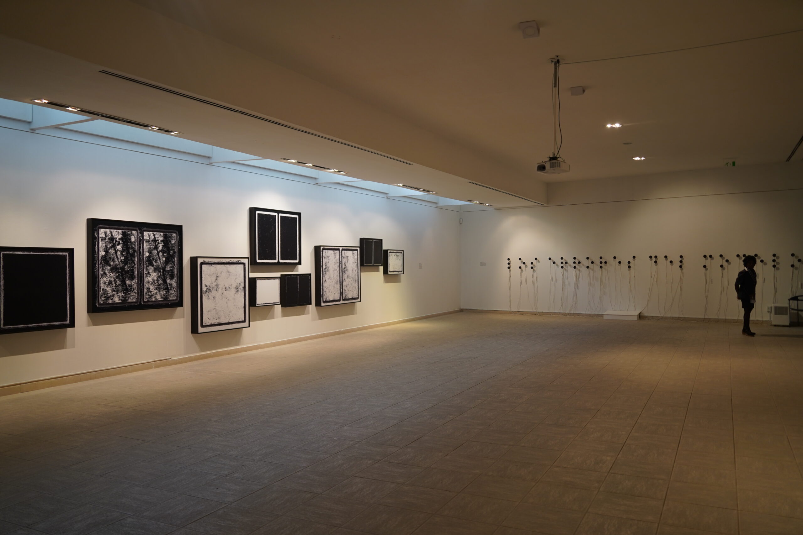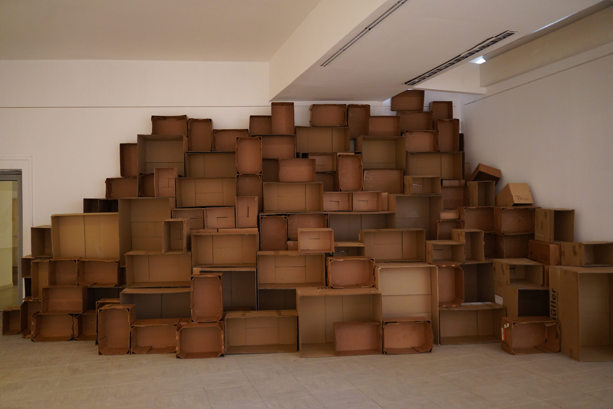 段ボールを並べたアート。壁に設置されたスピーカーから音が流れていて、視覚的な絵画や彫刻だけではなく聴覚的な芸術作品に挑戦しているような空間だった。