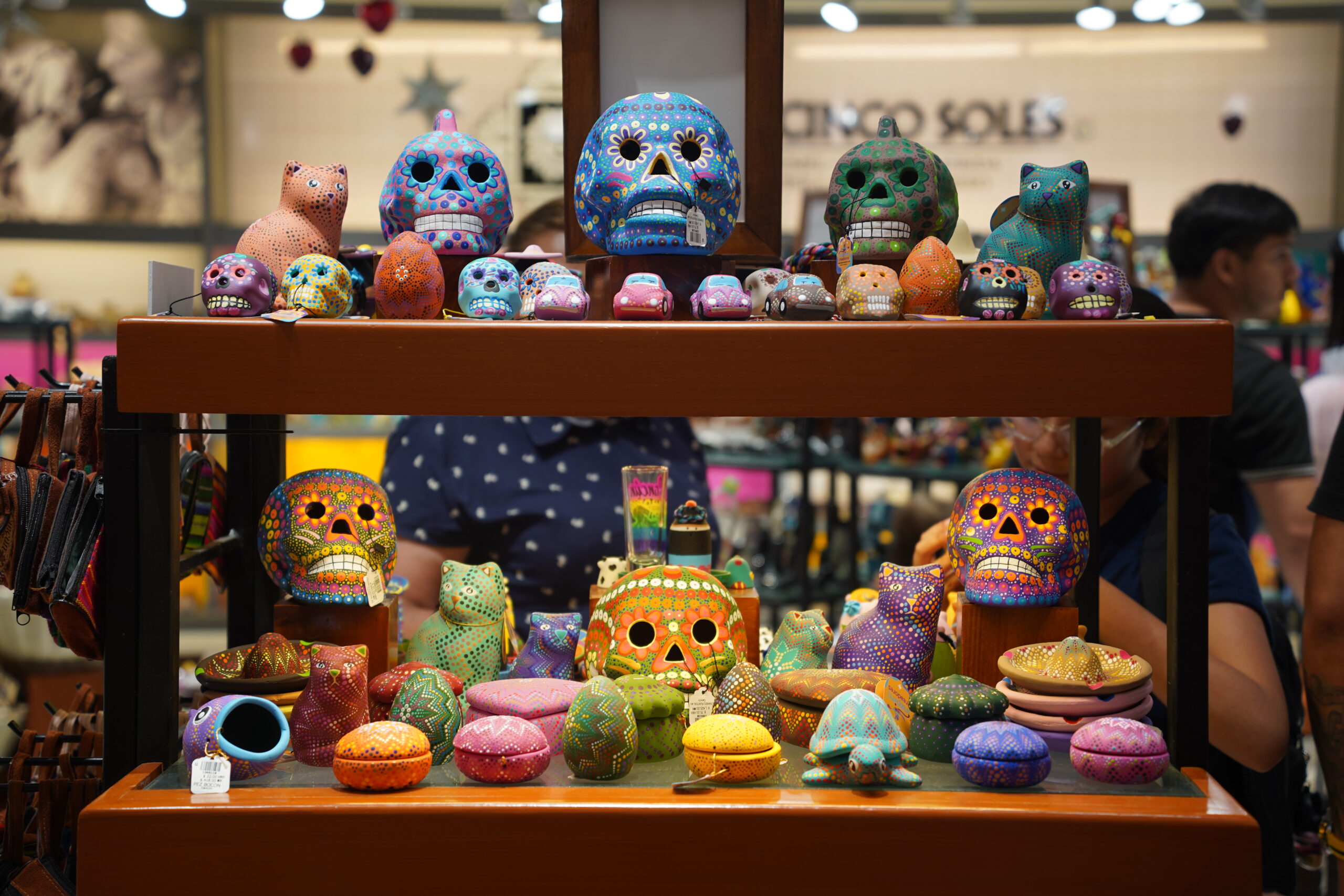まさにドクロはメキシコの「死者の日」を象徴する存在と言えるだろう。日本だと死を想起させるドクロとかシャレコウベと言うとものすごくおどろおどろしい怪談めいた雰囲気で使われることが多いが、メキシコではカラフルなドクロのお土産がそこら中で売られていてとても親しみを覚える存在となった。もはやメキシコ=ドクロと言っても過言ではないくらいに、メキシコではドクロのお土産品が盛んだった。