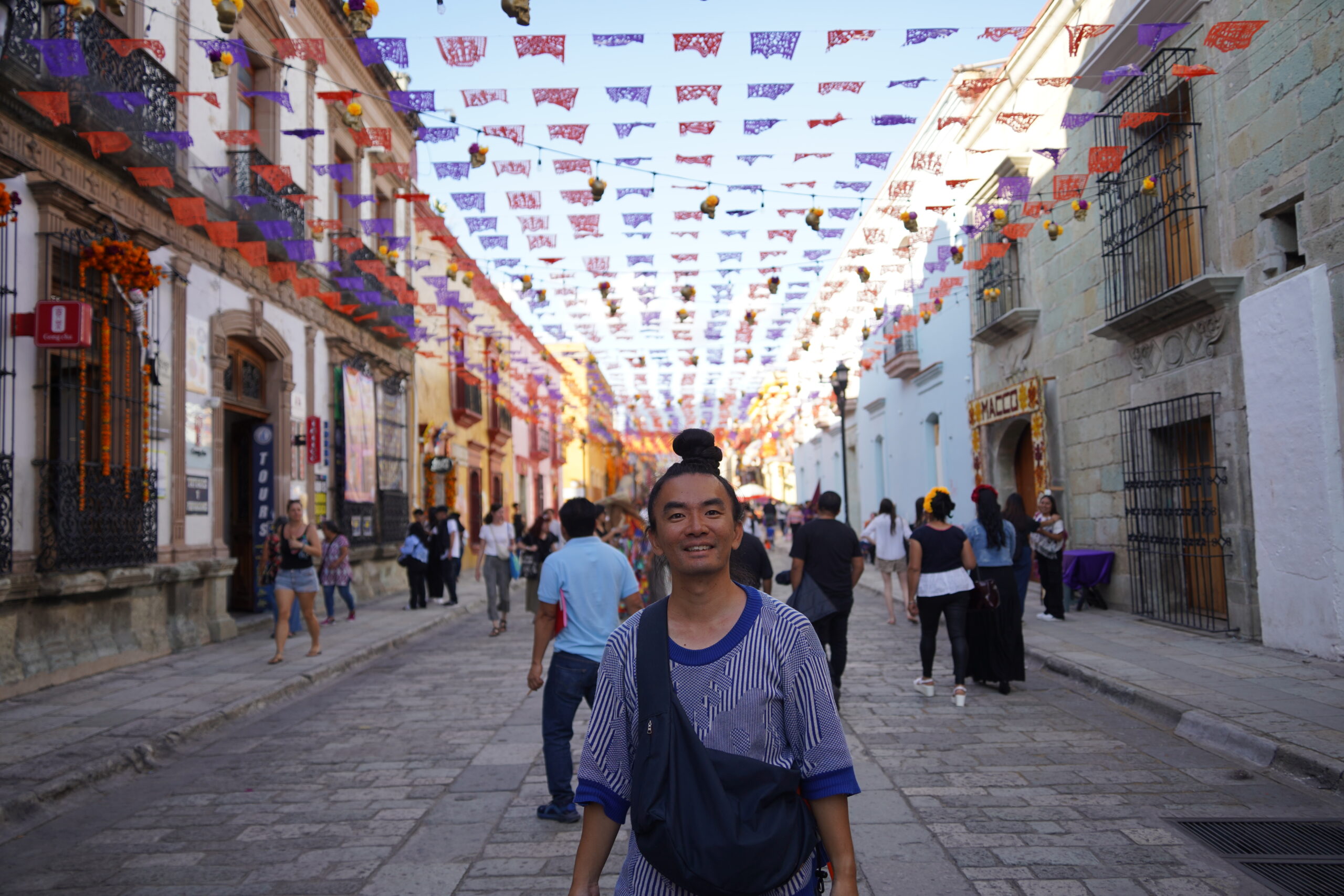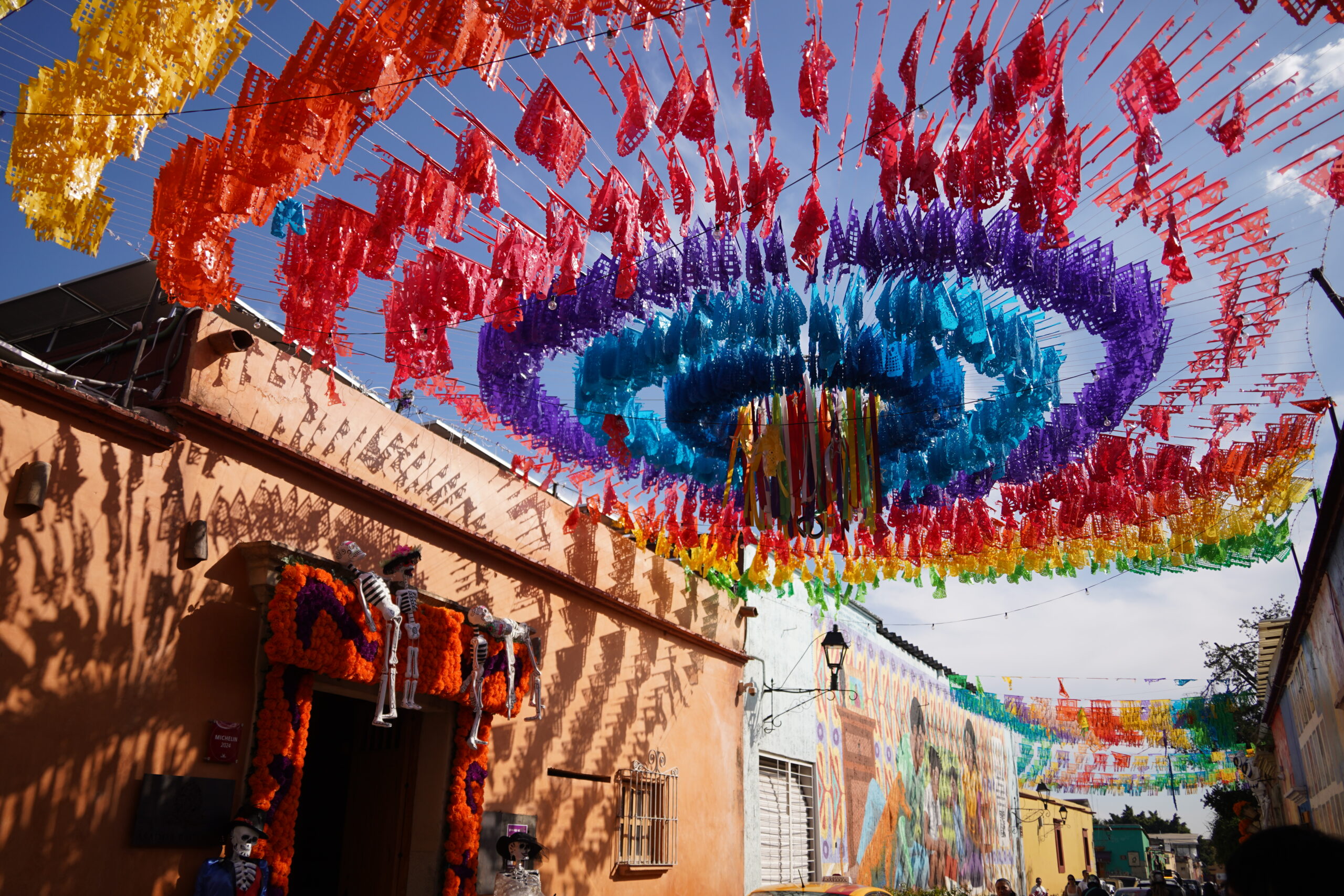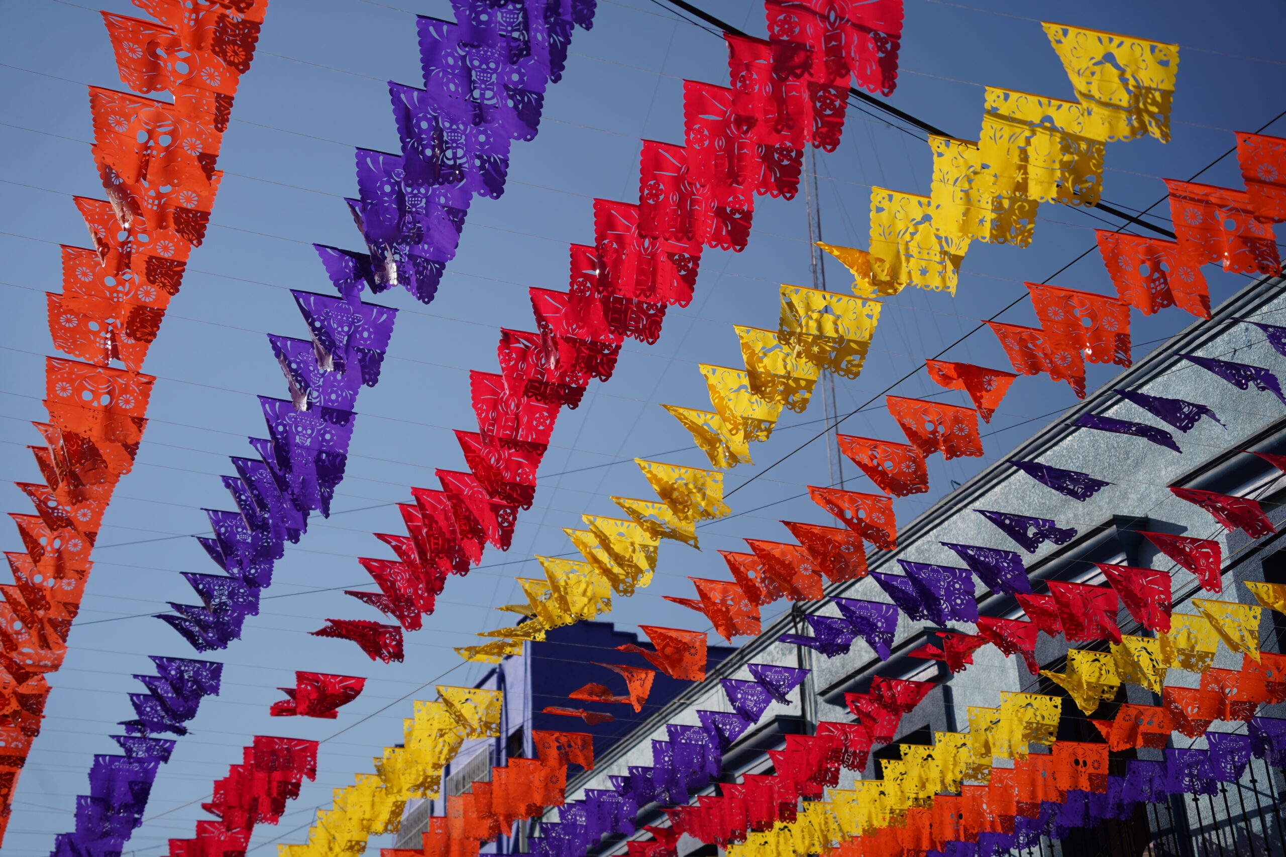 「死者の日」のオアハカでは上を見上げると無数のカラフルな旗が風になびいていて美しかった。それはパペルピカドと呼ばれる「死者の日」のための旗で、よく見ると切り絵細工のようになっていて見応えがあった。