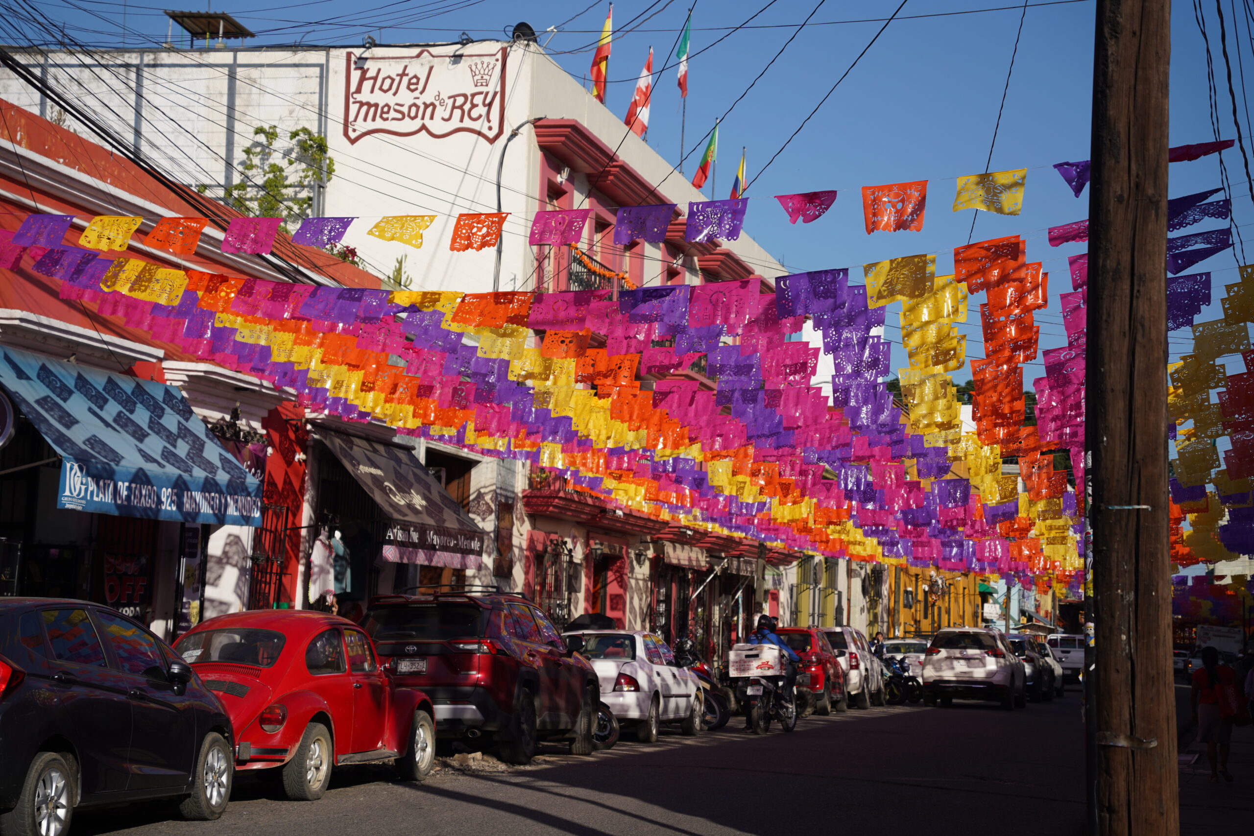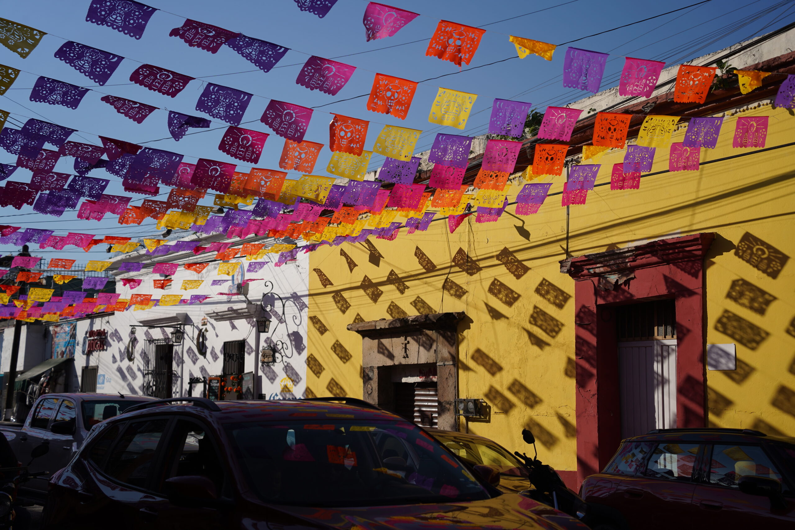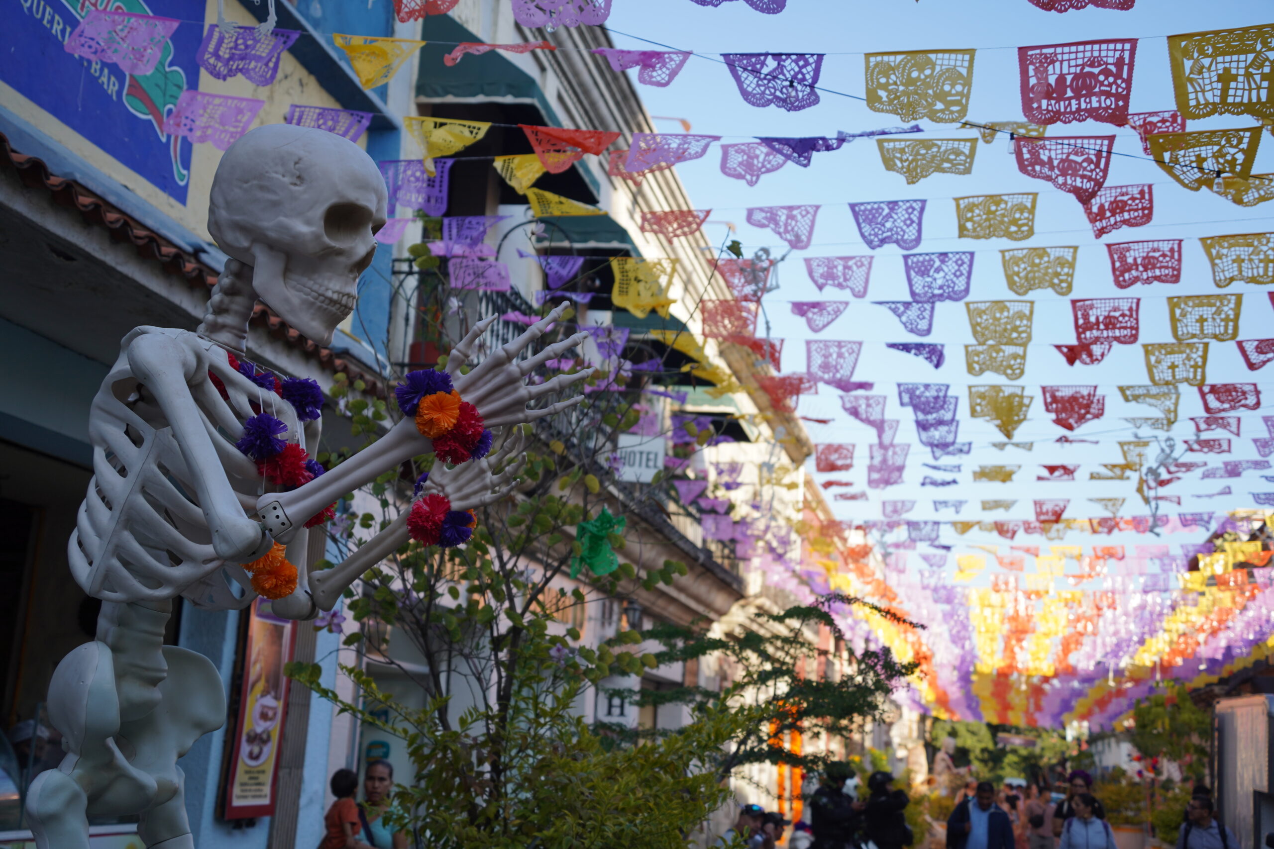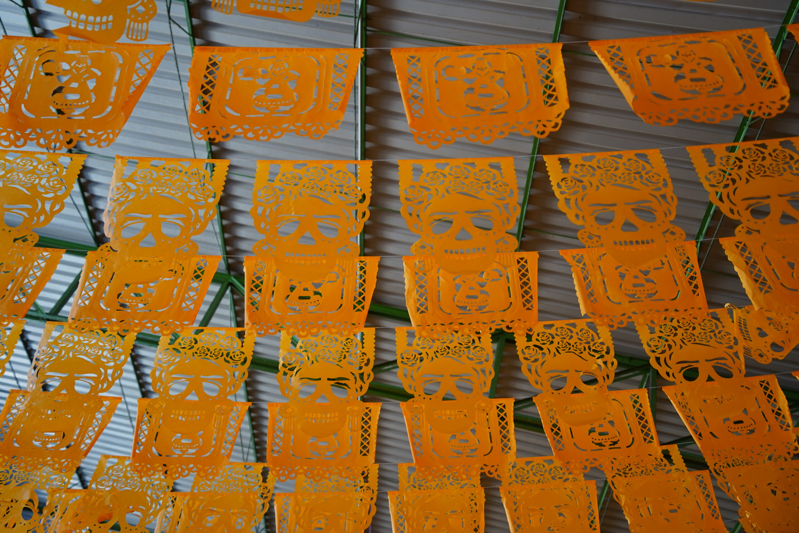 「死者の日」のオアハカでは上を見上げると無数のカラフルな旗が風になびいていて美しかった。それはパペルピカドと呼ばれる「死者の日」のための旗で、よく見ると切り絵細工のようになっていて見応えがあった。
