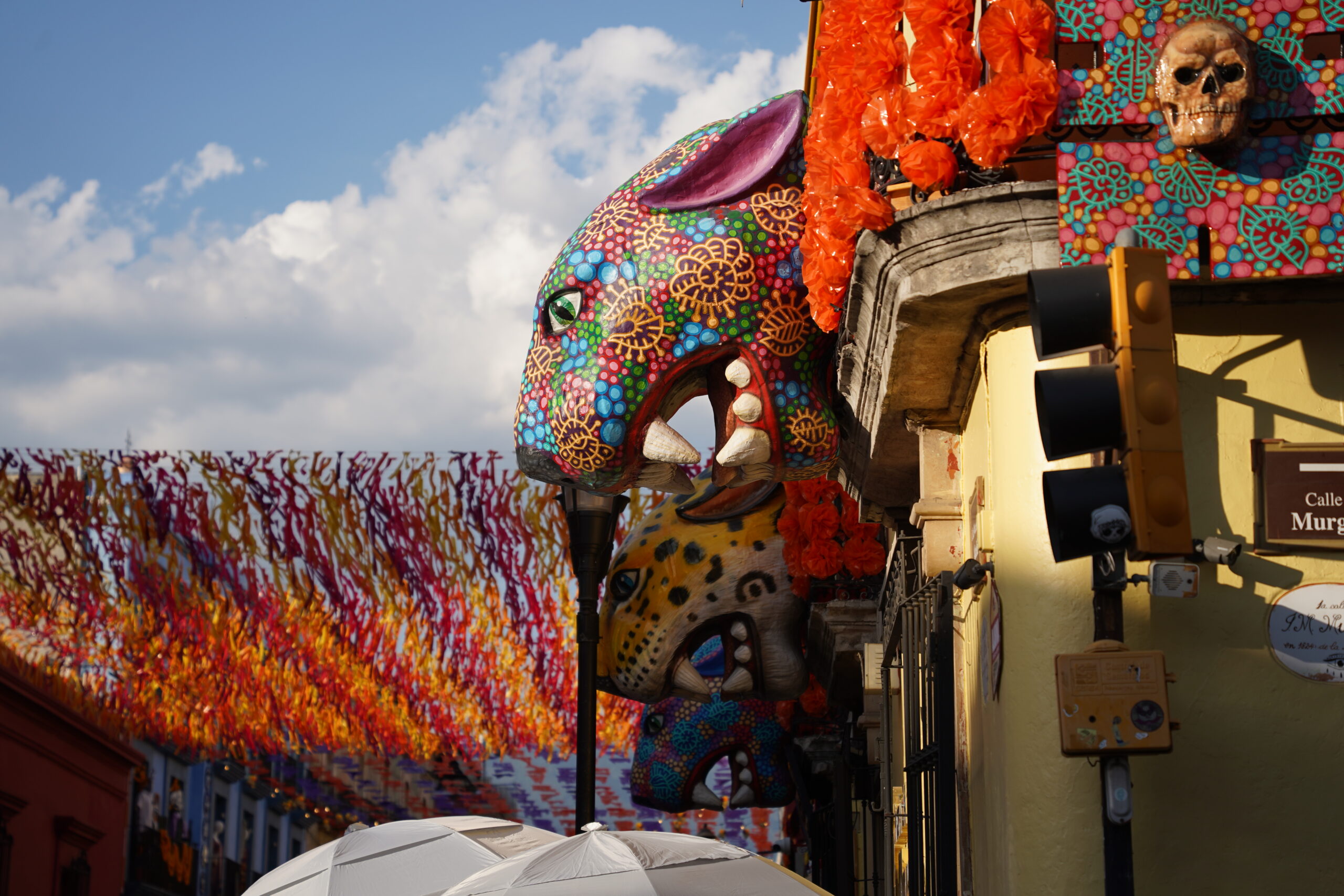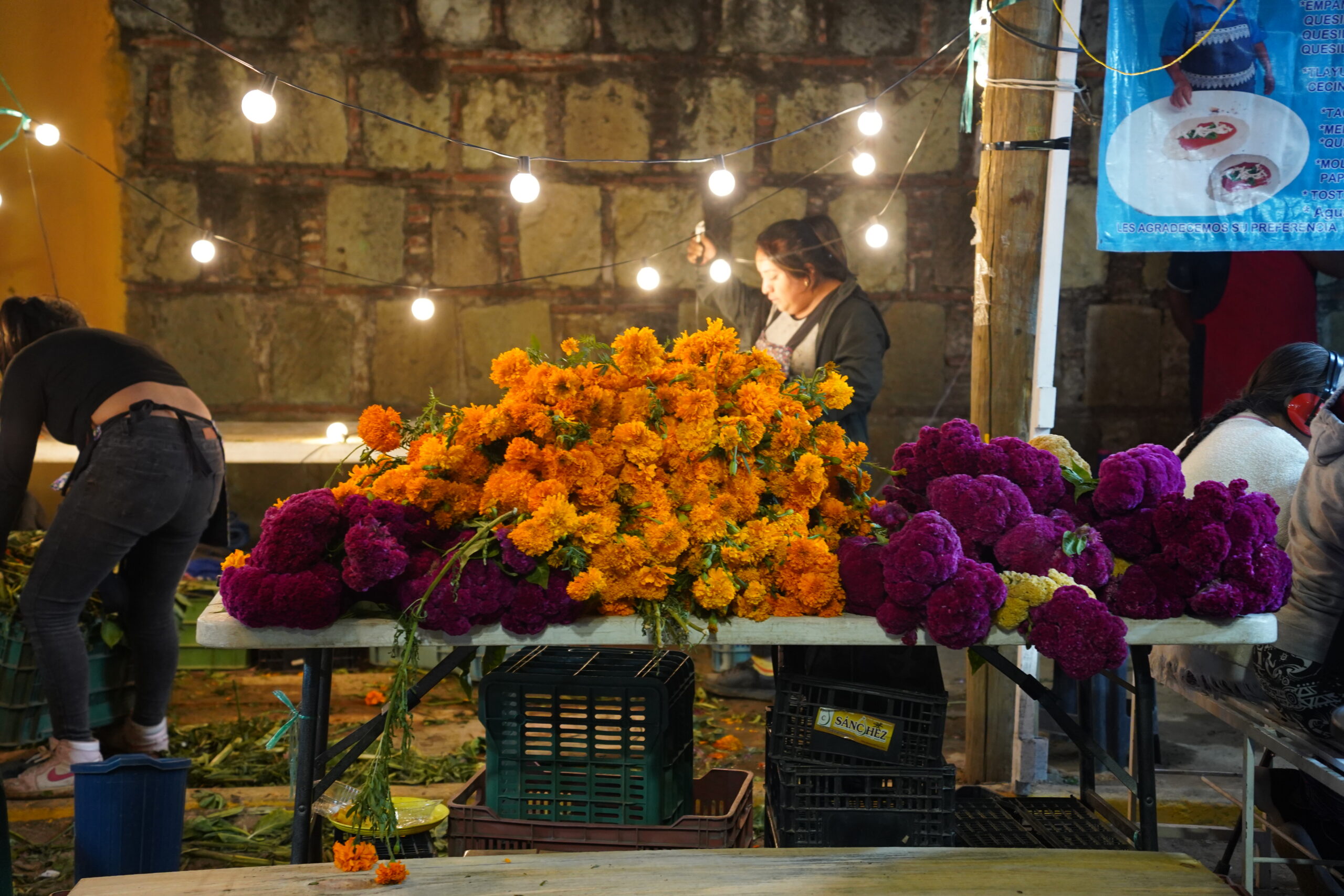 この旅最大の目的は、何と言ってもオアハカの「死者の日」のお祭りに参加することだ。メキシコでは11月1日、2日にかけて亡くなった先祖の魂があの世から帰ってくる「死者の日」という祝日があり、街中にドクロの像や絵が溢れていたり、人々がドクロ様のお化粧をしていたり、黄色いマリーゴールドの花が敷き詰められた祭壇が設置されたりして非常に盛り上がっている。