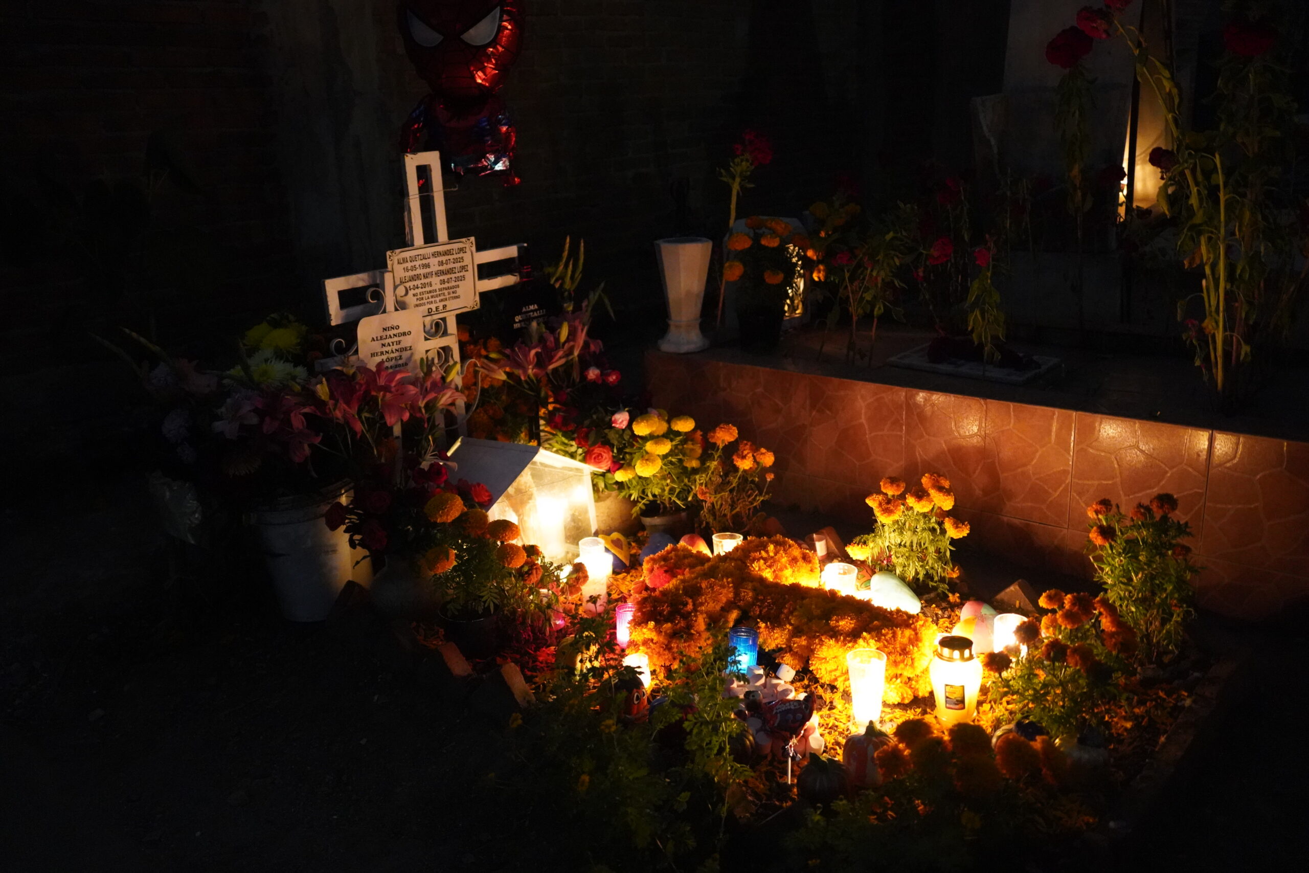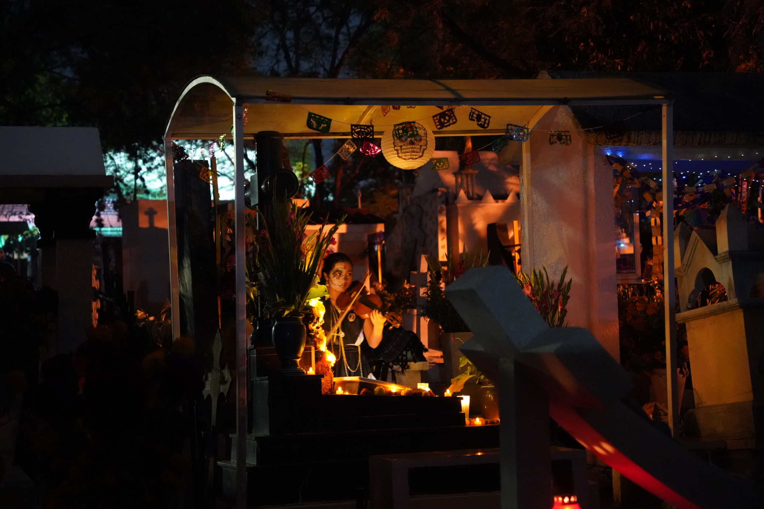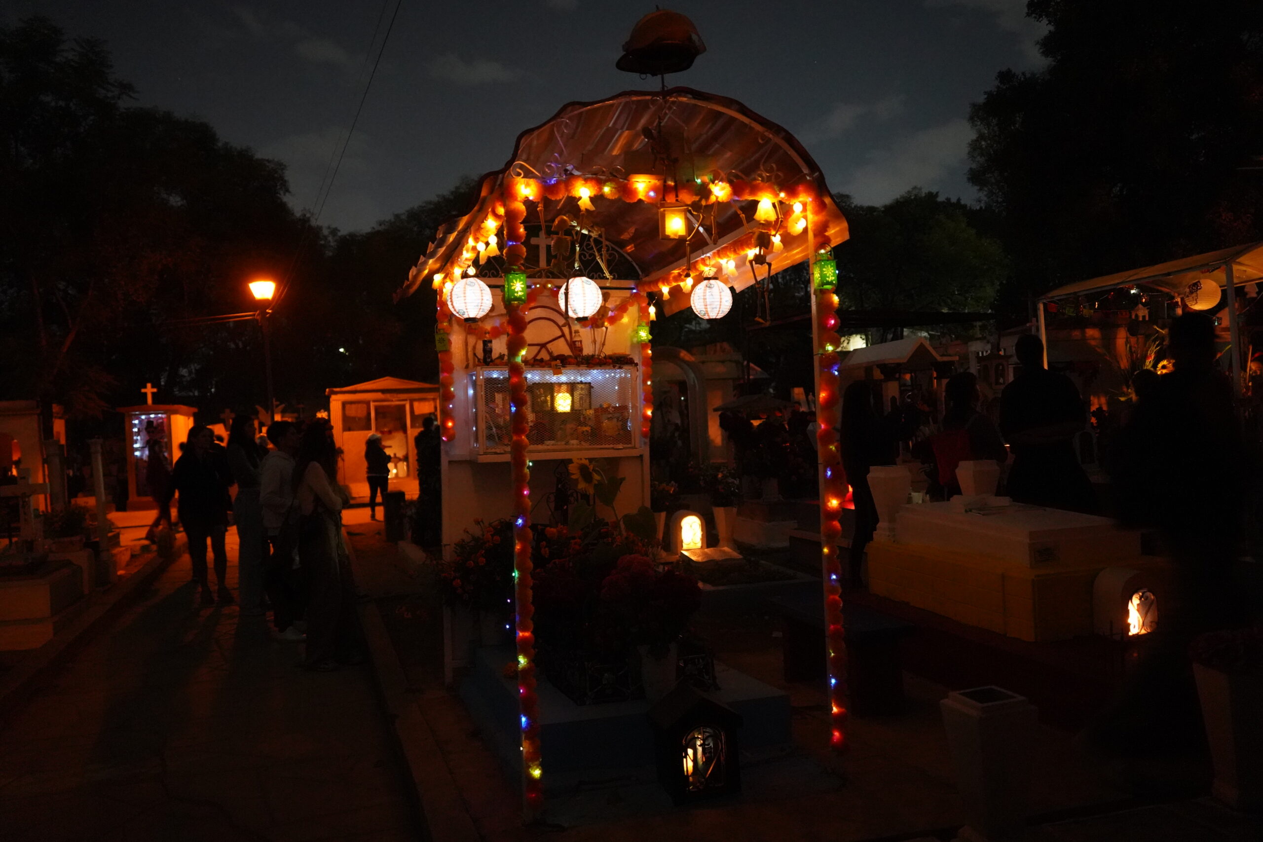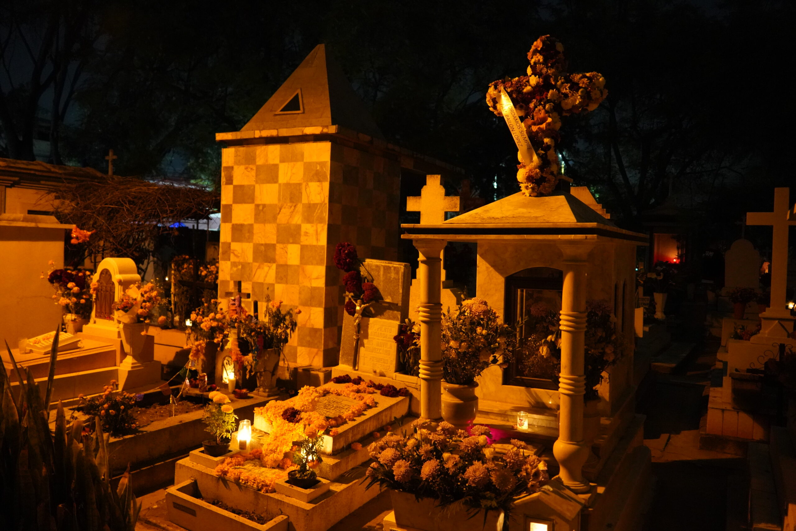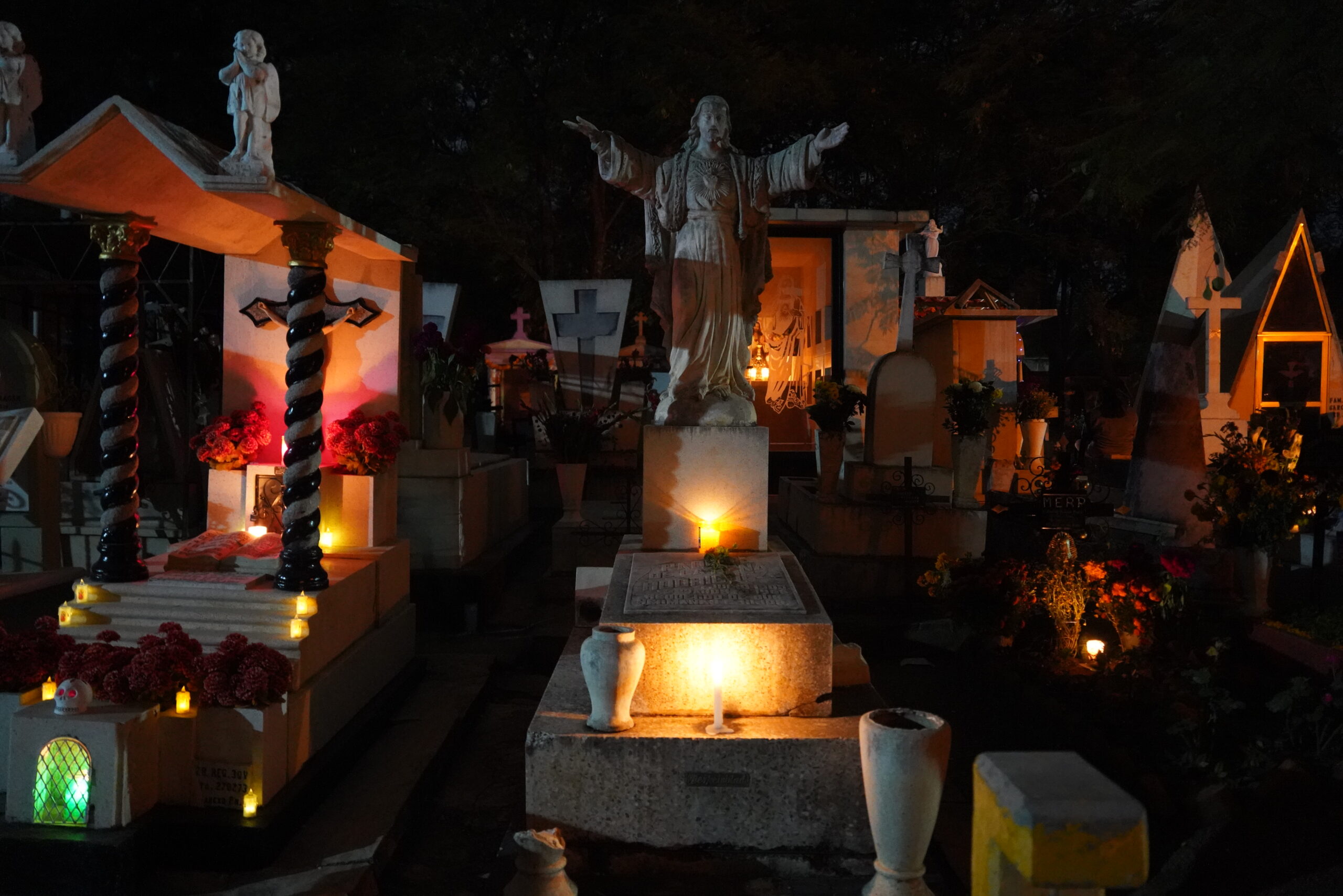 そして肝心の墓地へ入ると、驚くべきことに真っ暗で何も見えないほどであり、「死者の日」らしい幻想的な装飾はひとつも施されておらず、ただただ夜中の墓地を徘徊する虚しい旅人になってしまった。しかしぼくのように「Panteón General」で「死者の日」らしい風景を見たいと思ってやって来た外国人は多いらしく、墓地内を歩く人々は沢山いたものの皆「期待ハズレ」という雰囲気を醸し出していた。上の写真はそんな中でも何とか「死者の日」らしい風景を無理矢理頑張って見つけ出して撮影したもの。