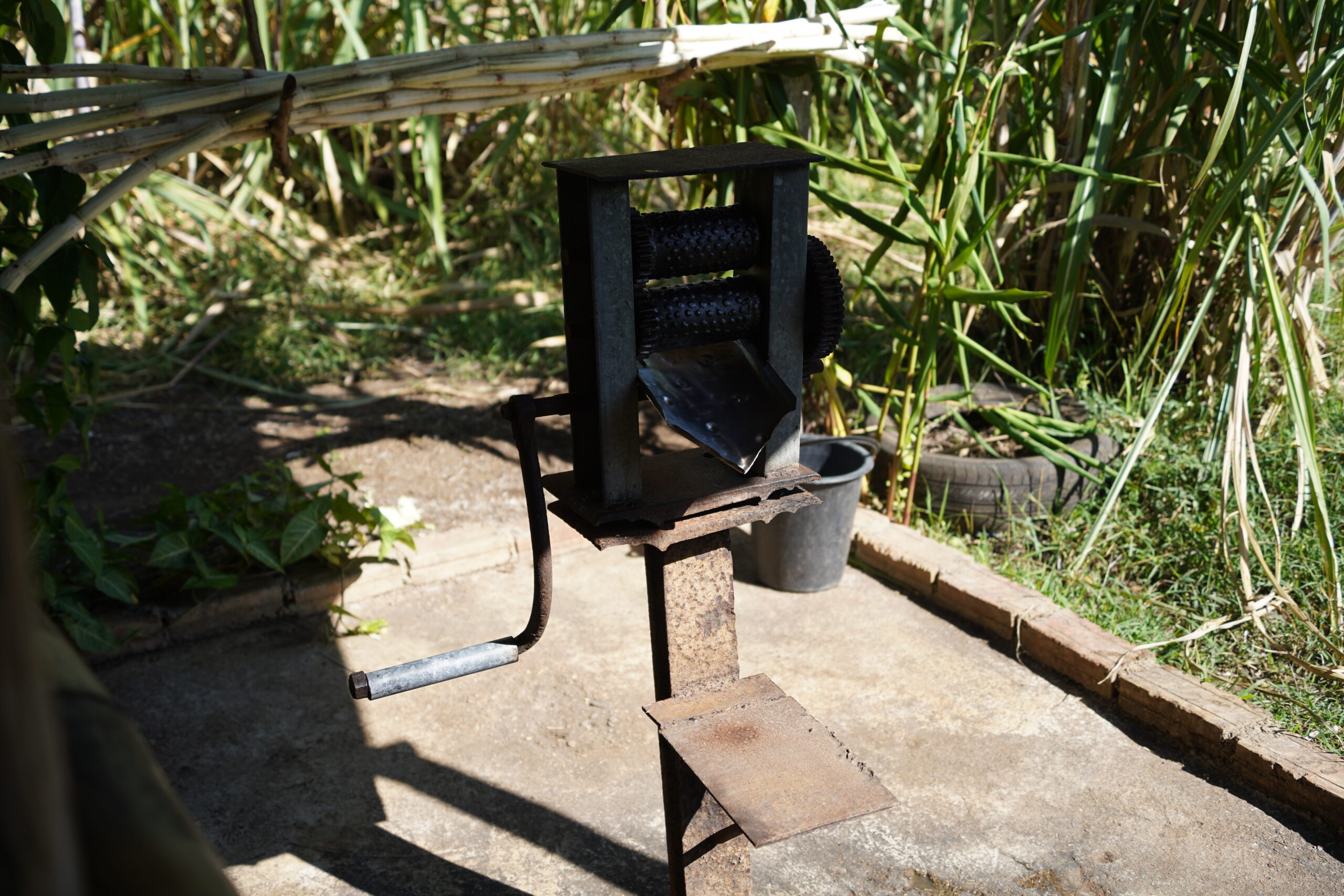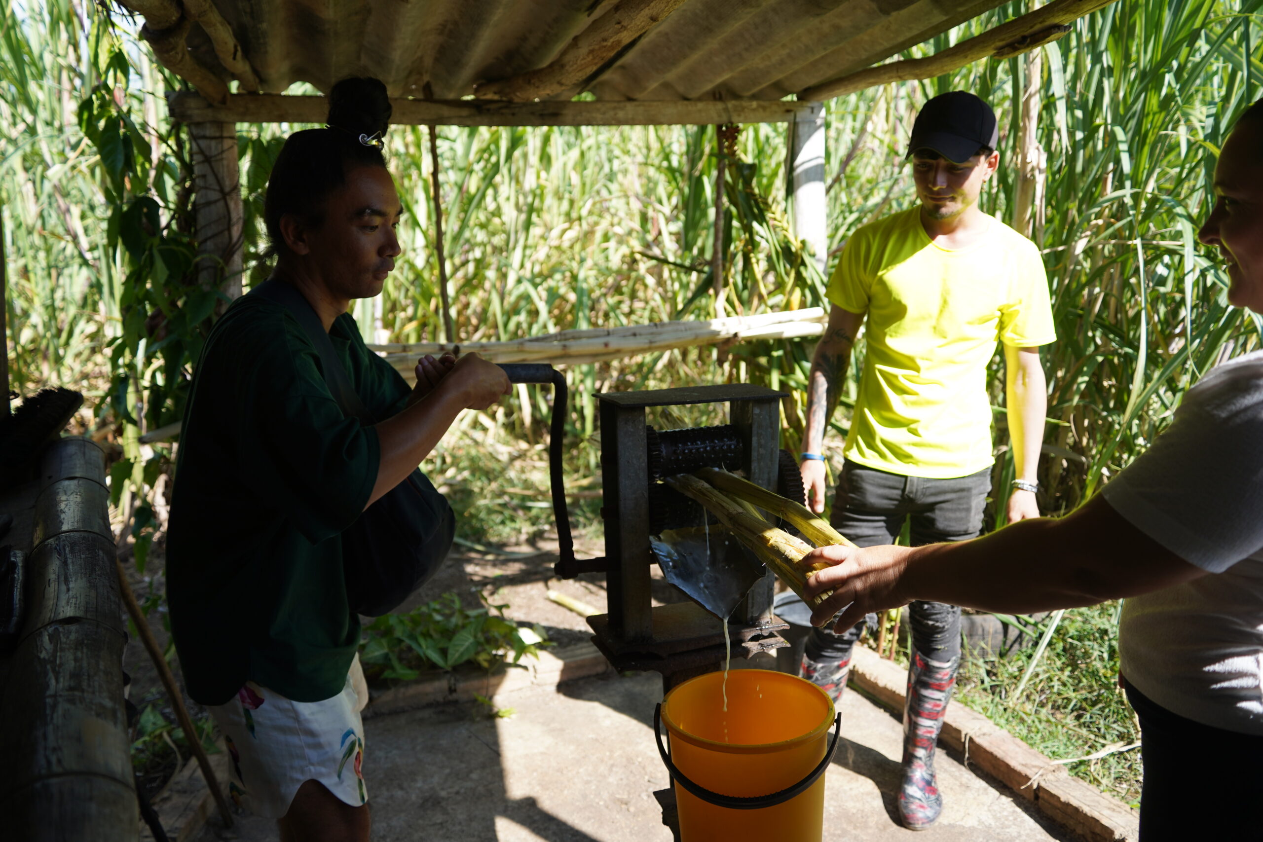 ・サトウキビ農場兼レストランで新鮮なサトウキビジュースを搾り出した