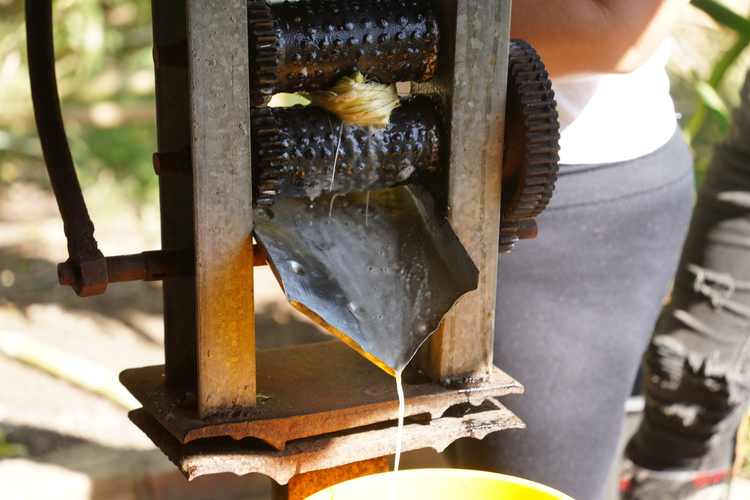 サトウキビを搾る専用の機械をクルクル回してサトウキビの汁を搾り出す。この新鮮なサトウキビジュースがめちゃくちゃ絶品ですごく美味しかった!沖縄に10年住んでいたけれど、出来立てのサトウキビジュースなんて飲んだことがなかった。