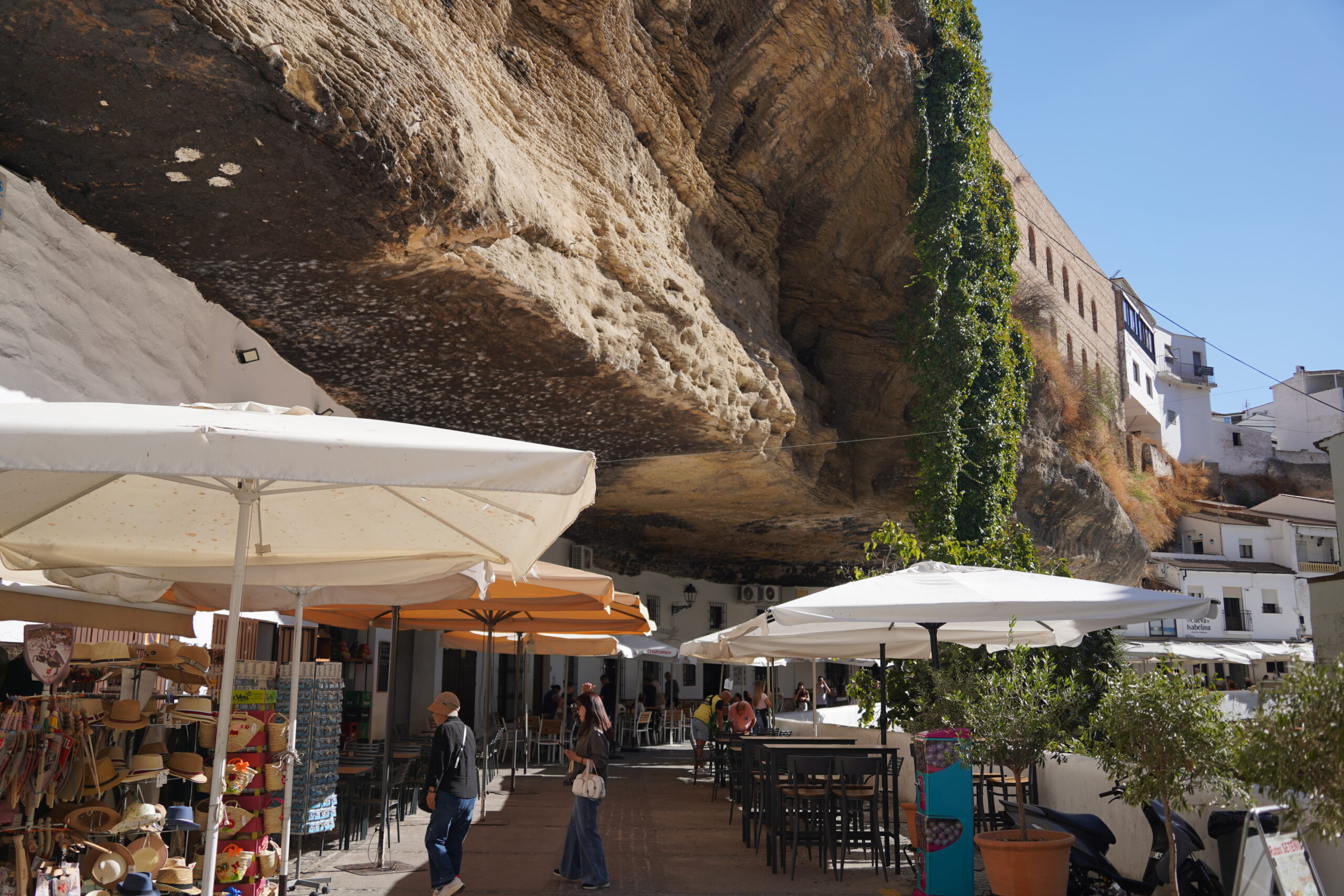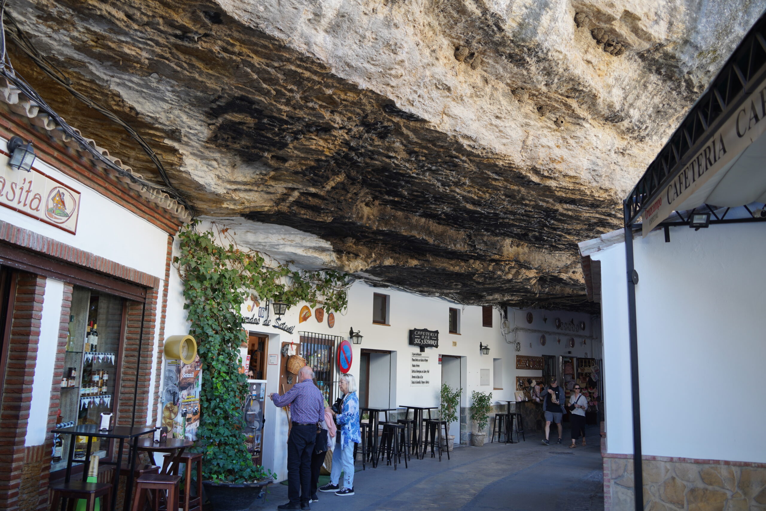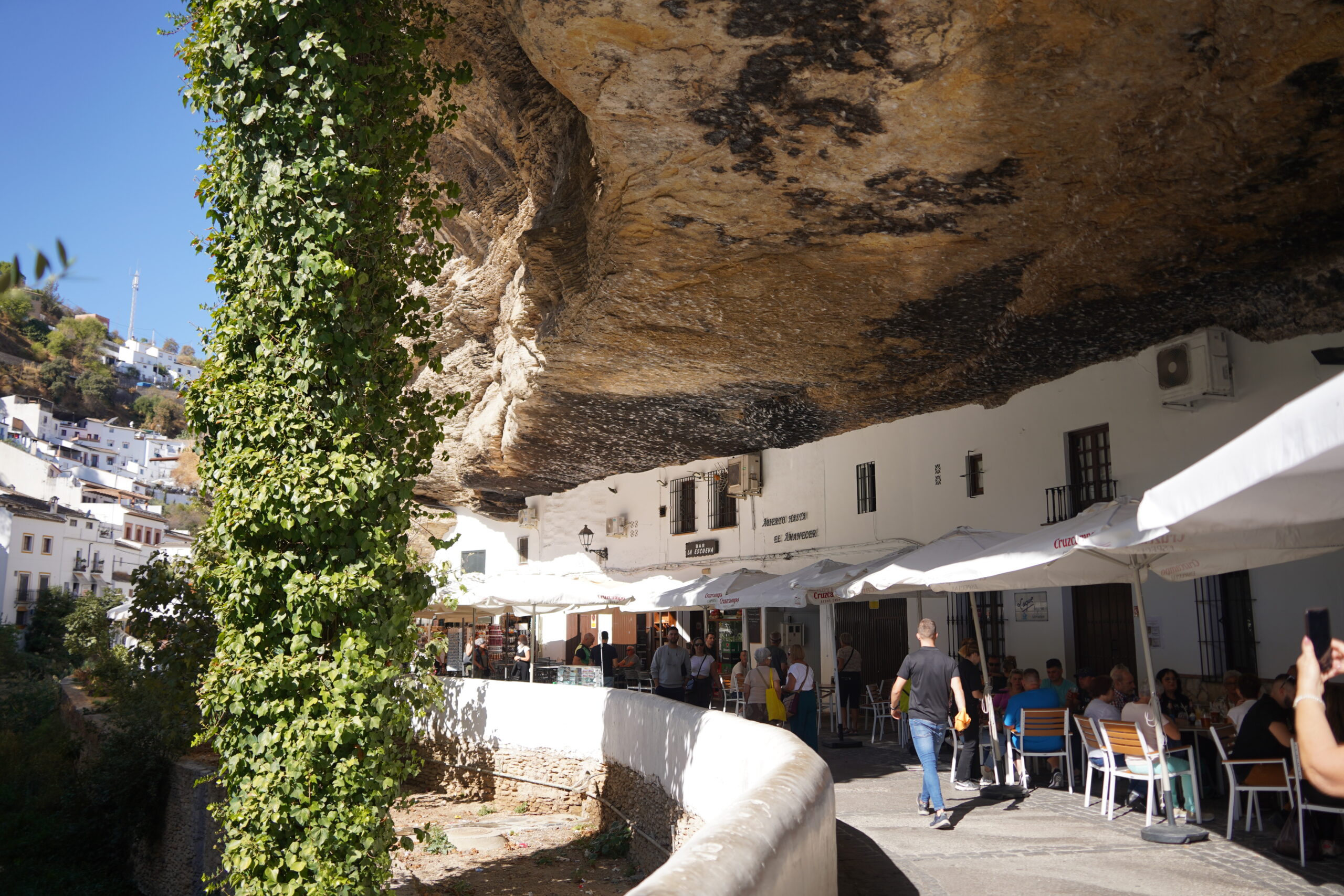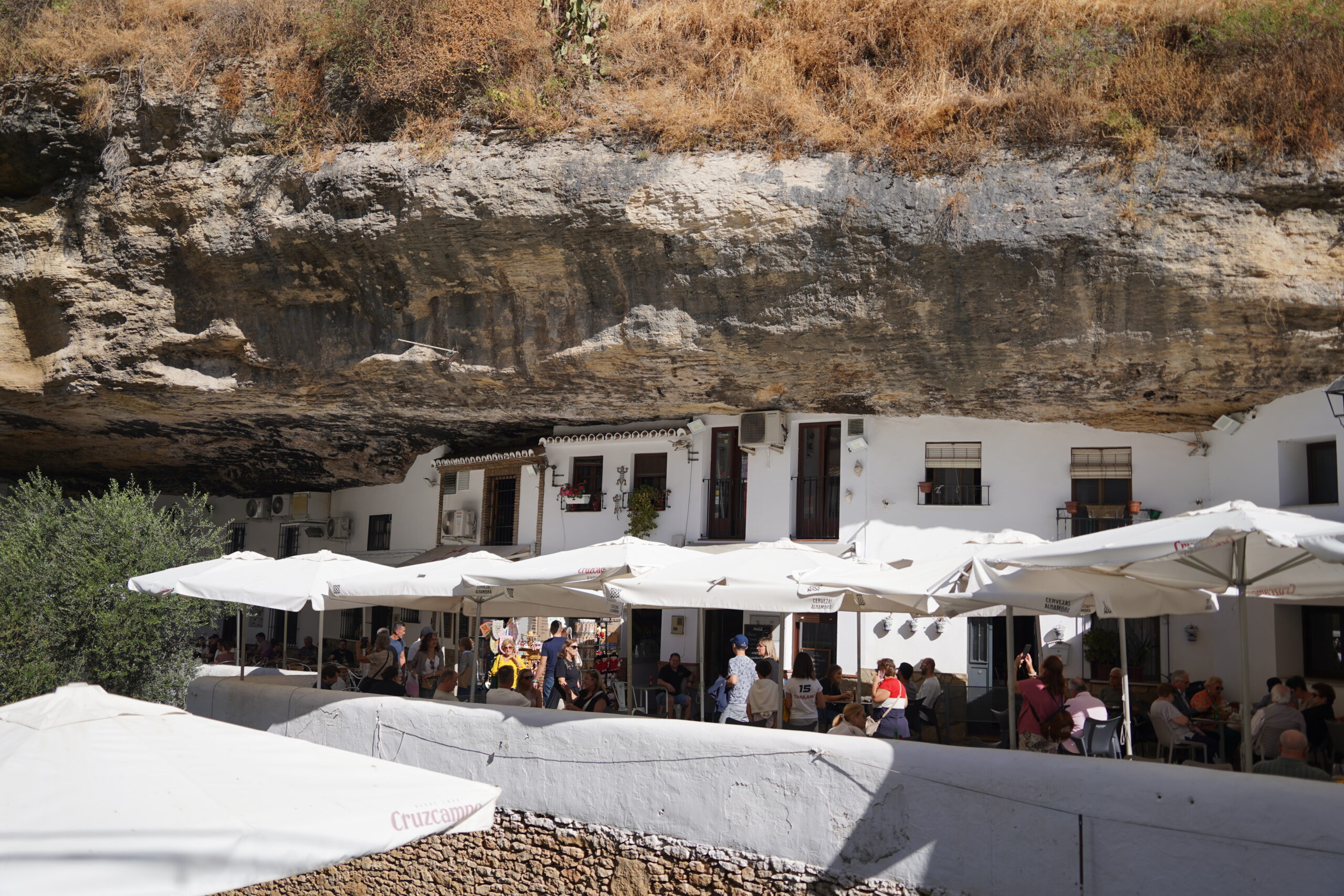 巨大な奇岩のトンネルをくぐり抜けて歩き続け、橋を渡ると川の対岸にも、さっきよりもさらに巨大な岩石に押しつぶされそうになって建てられている大迫力のレストラン街があった!こんな不思議な絶景、絶対にここでしか見られないよね。巨大な奇岩はレストラン街の屋根のようになっており、その下を歩いていると快晴続きのアンダルシアでは涼しくて快適だった。レストランは多くの人で賑わい、ここが一大観光地であることを思い知らされた。