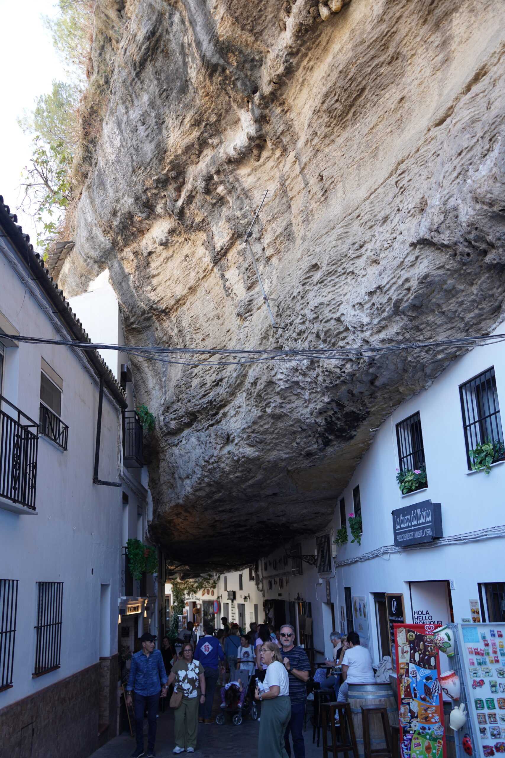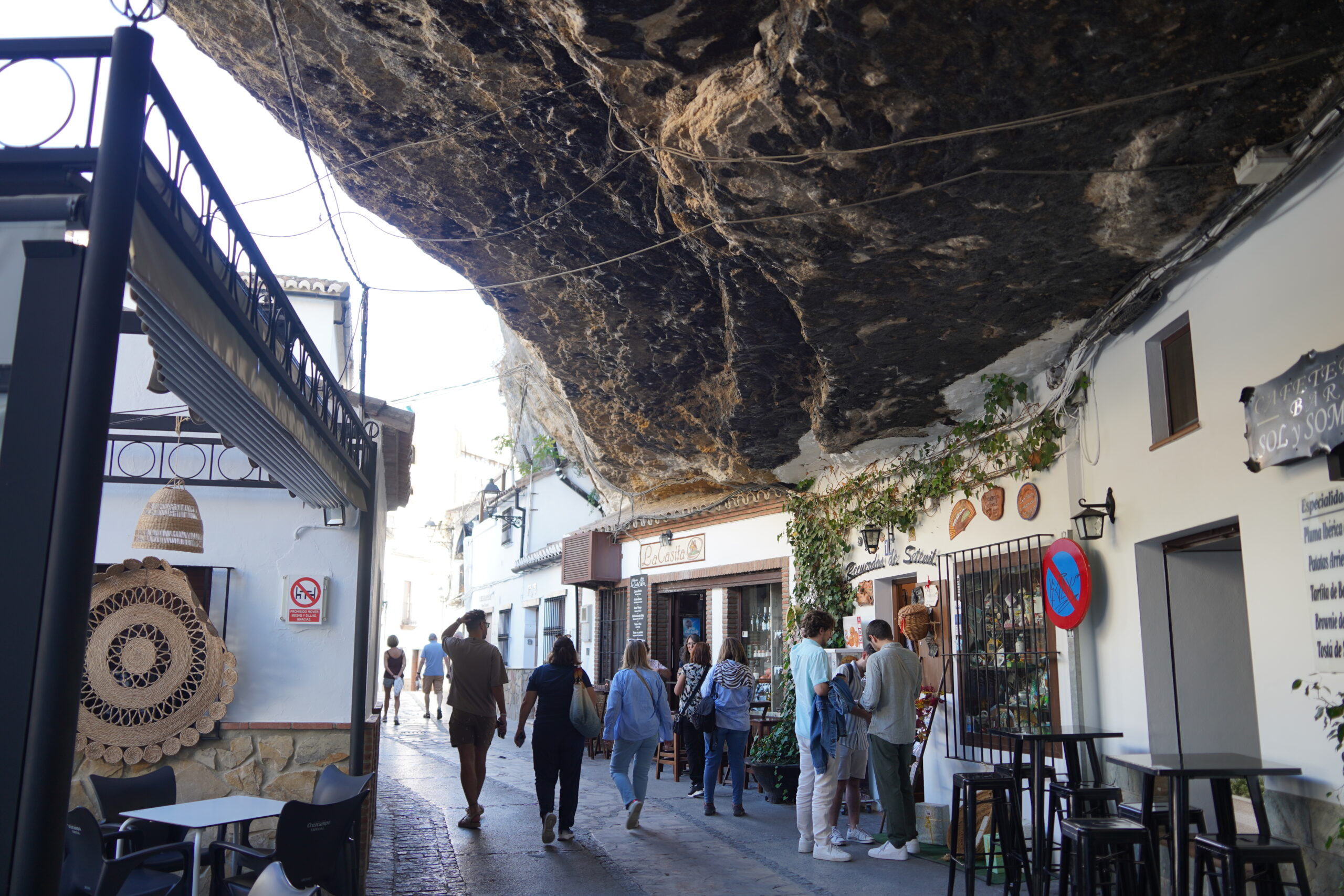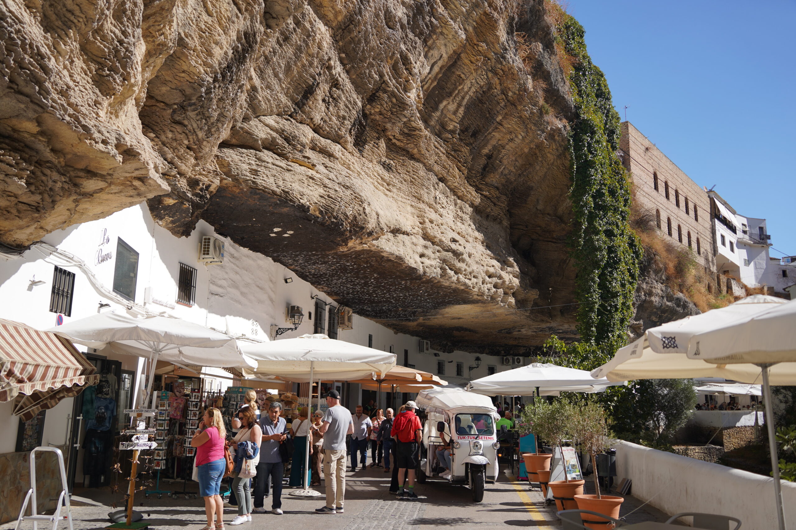 巨大な奇岩のトンネルをくぐり抜けて歩き続け、橋を渡ると川の対岸にも、さっきよりもさらに巨大な岩石に押しつぶされそうになって建てられている大迫力のレストラン街があった!こんな不思議な絶景、絶対にここでしか見られないよね。巨大な奇岩はレストラン街の屋根のようになっており、その下を歩いていると快晴続きのアンダルシアでは涼しくて快適だった。レストランは多くの人で賑わい、ここが一大観光地であることを思い知らされた。