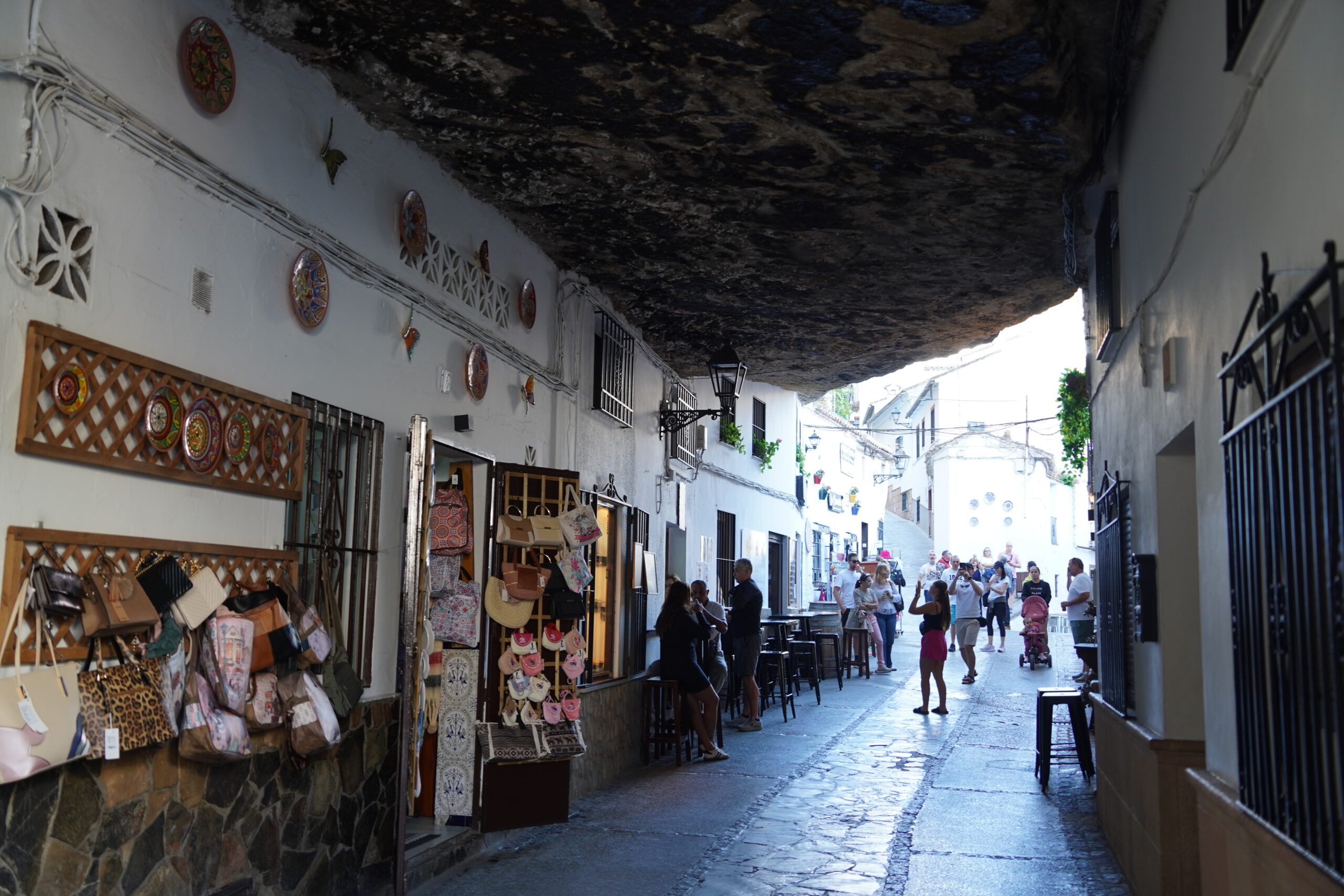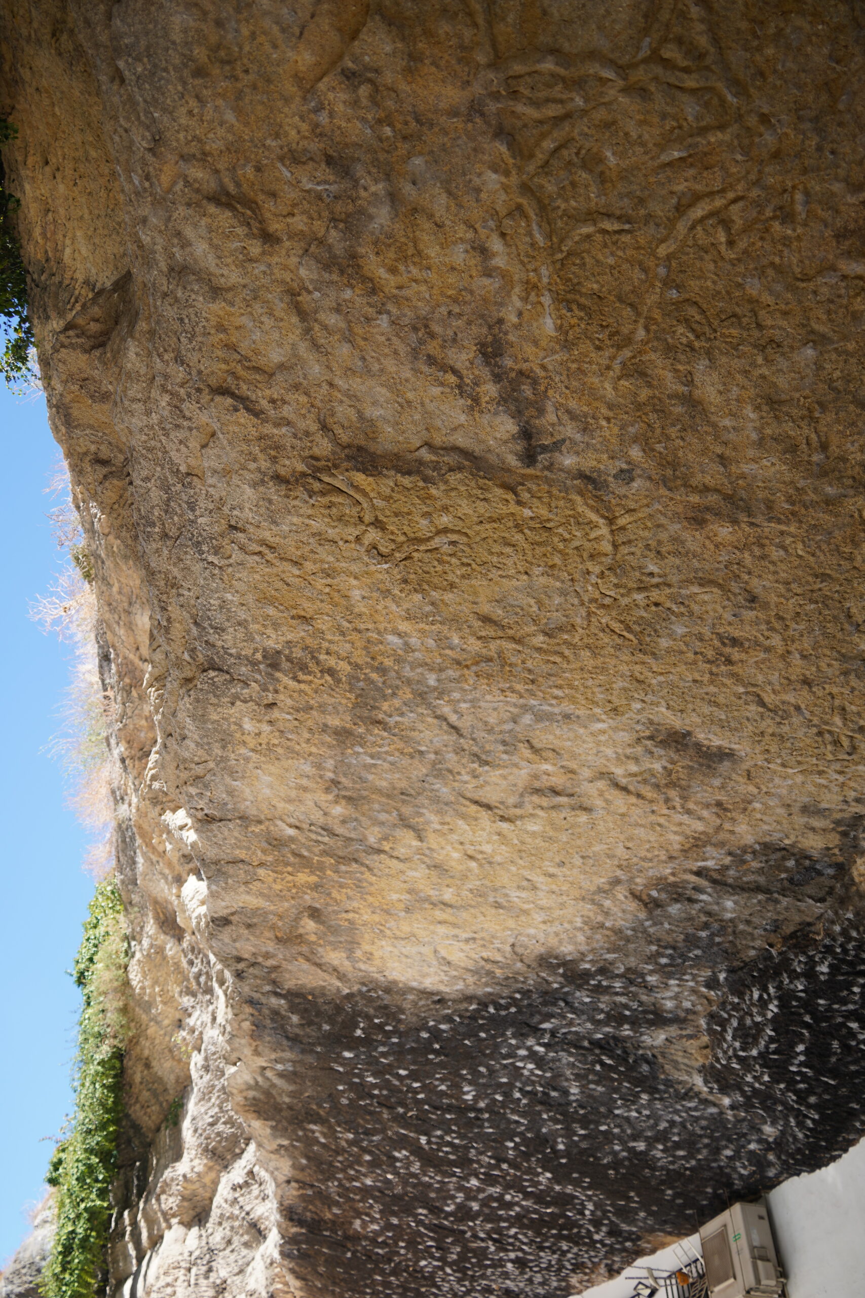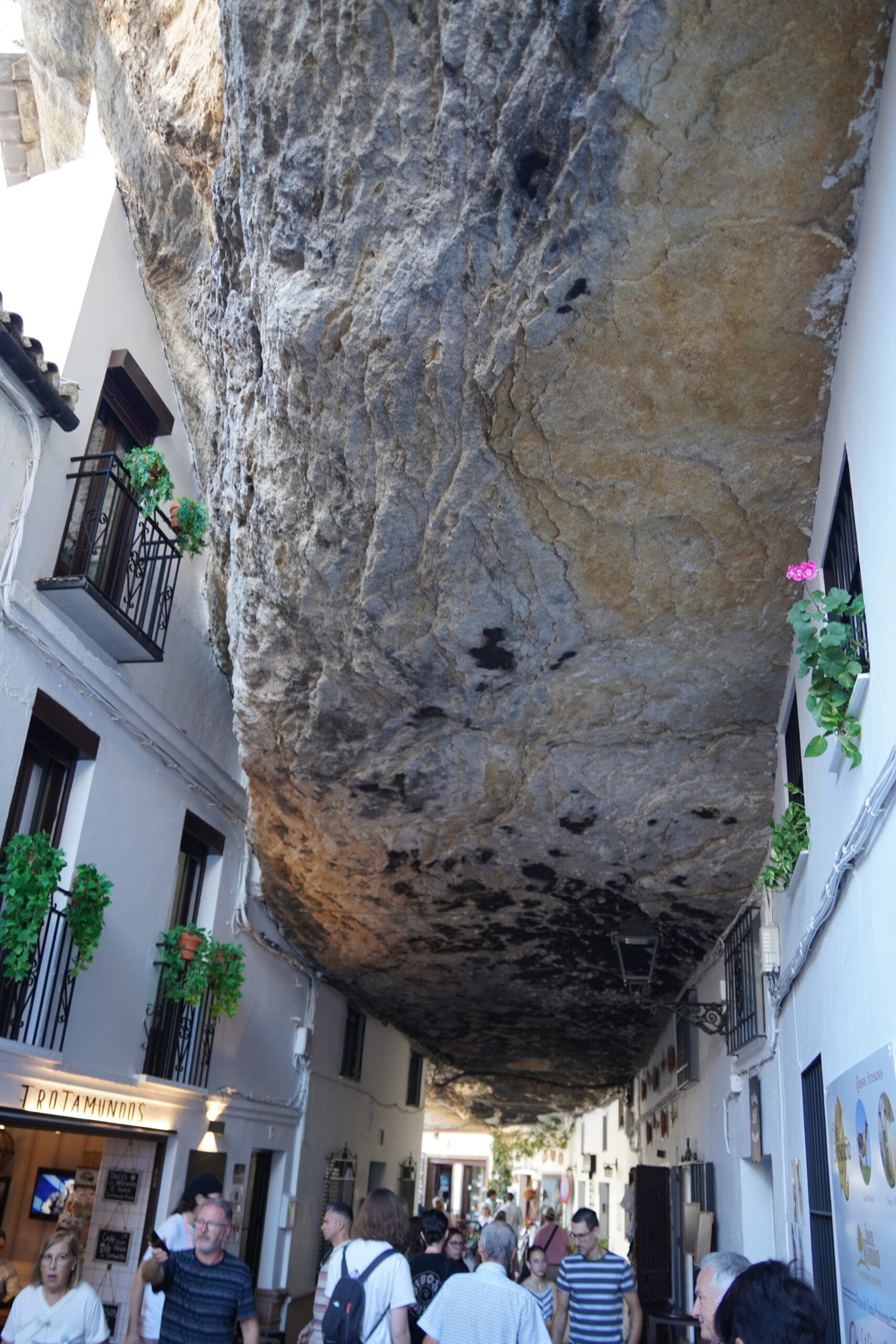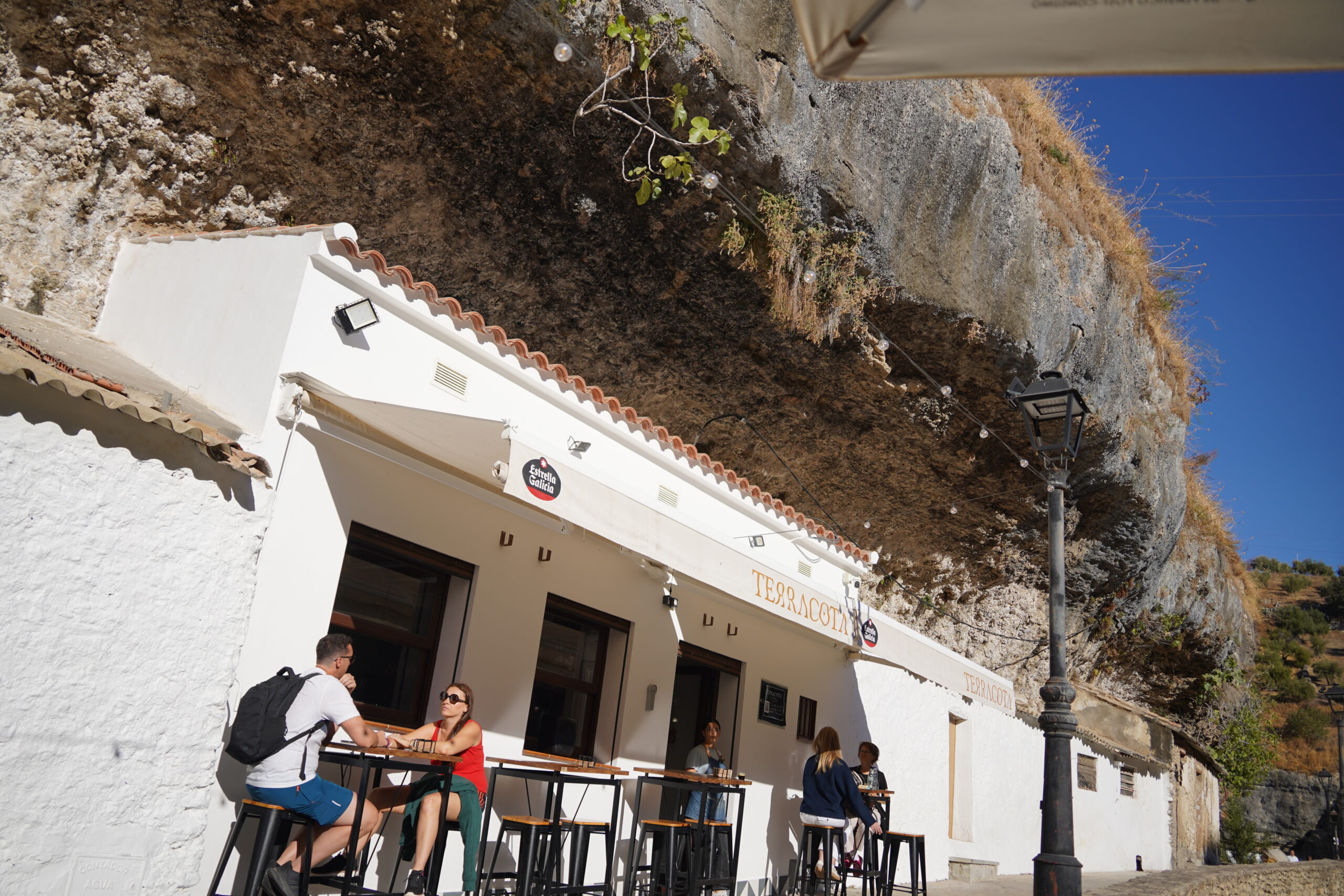 巨大な奇岩のトンネルをくぐり抜けて歩き続け、橋を渡ると川の対岸にも、さっきよりもさらに巨大な岩石に押しつぶされそうになって建てられている大迫力のレストラン街があった!こんな不思議な絶景、絶対にここでしか見られないよね。巨大な奇岩はレストラン街の屋根のようになっており、その下を歩いていると快晴続きのアンダルシアでは涼しくて快適だった。レストランは多くの人で賑わい、ここが一大観光地であることを思い知らされた。