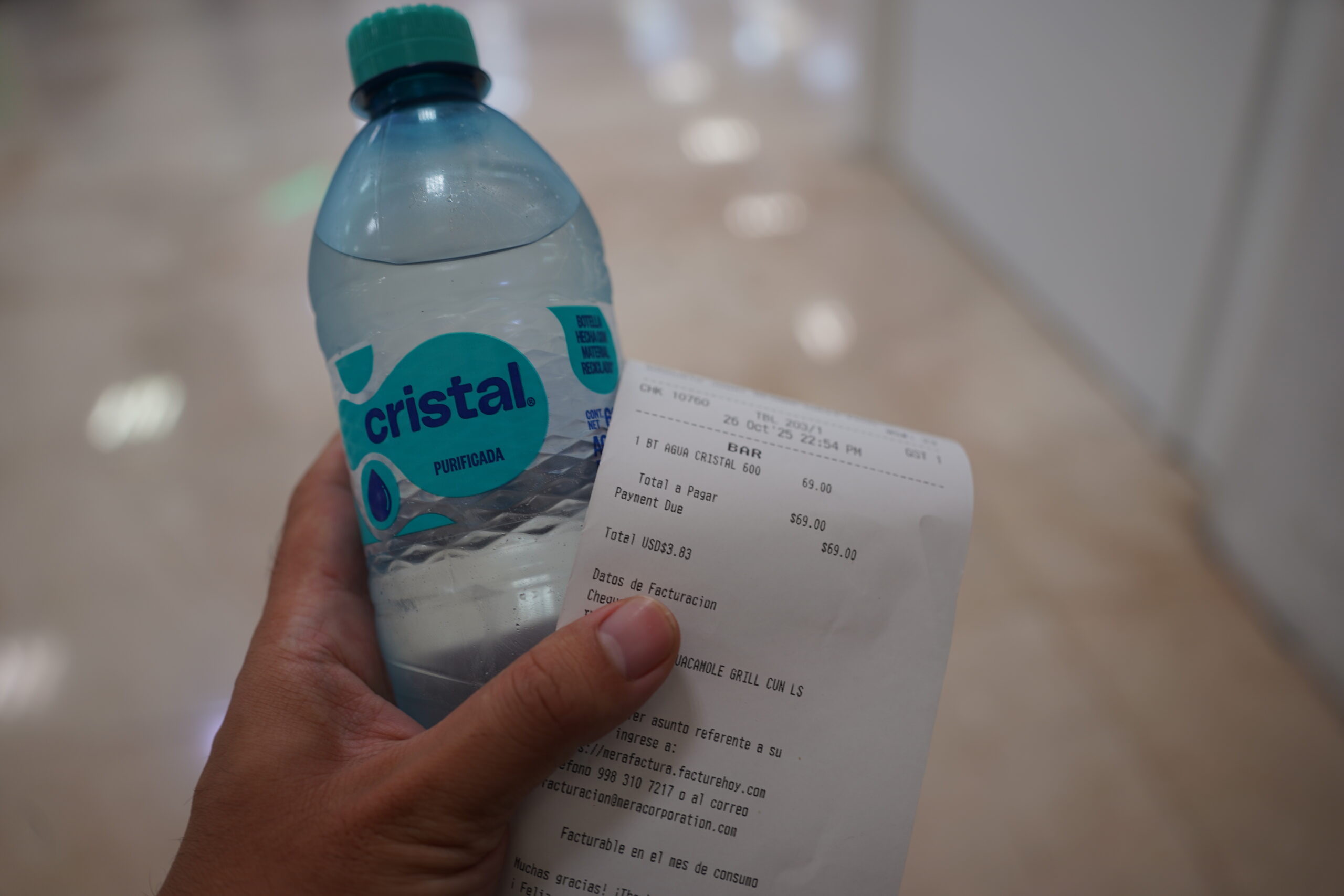 驚くべき大事件はこの後起こった。Orbestはフライトの後半には飲み物の提供がなく脱水気味だったぼくは、何とか水だけは買わなけばならないと感じていた。無料の水もなさそうだったので、夜11時に唯一開いていたGuacamole Grillというレストランへ立ち寄って水を下さいと言うと、何と600mlのペットボトルの水が69ペソだった(560円くらい)ので腰が抜けるほど驚いた!こんなんリスボンの空港よりも高いやん(2ユーロ代だった)!え、メキシコってこんなに物価高いの?!それともここが空港だから?それでもボッタクリもえぇとこやろ!こんな高い水聞いたことないわ!マジで世界一高い水では?????しかし命には代えられないので涙を飲んで560円の水600mlを購入した(心は死んでいた)。