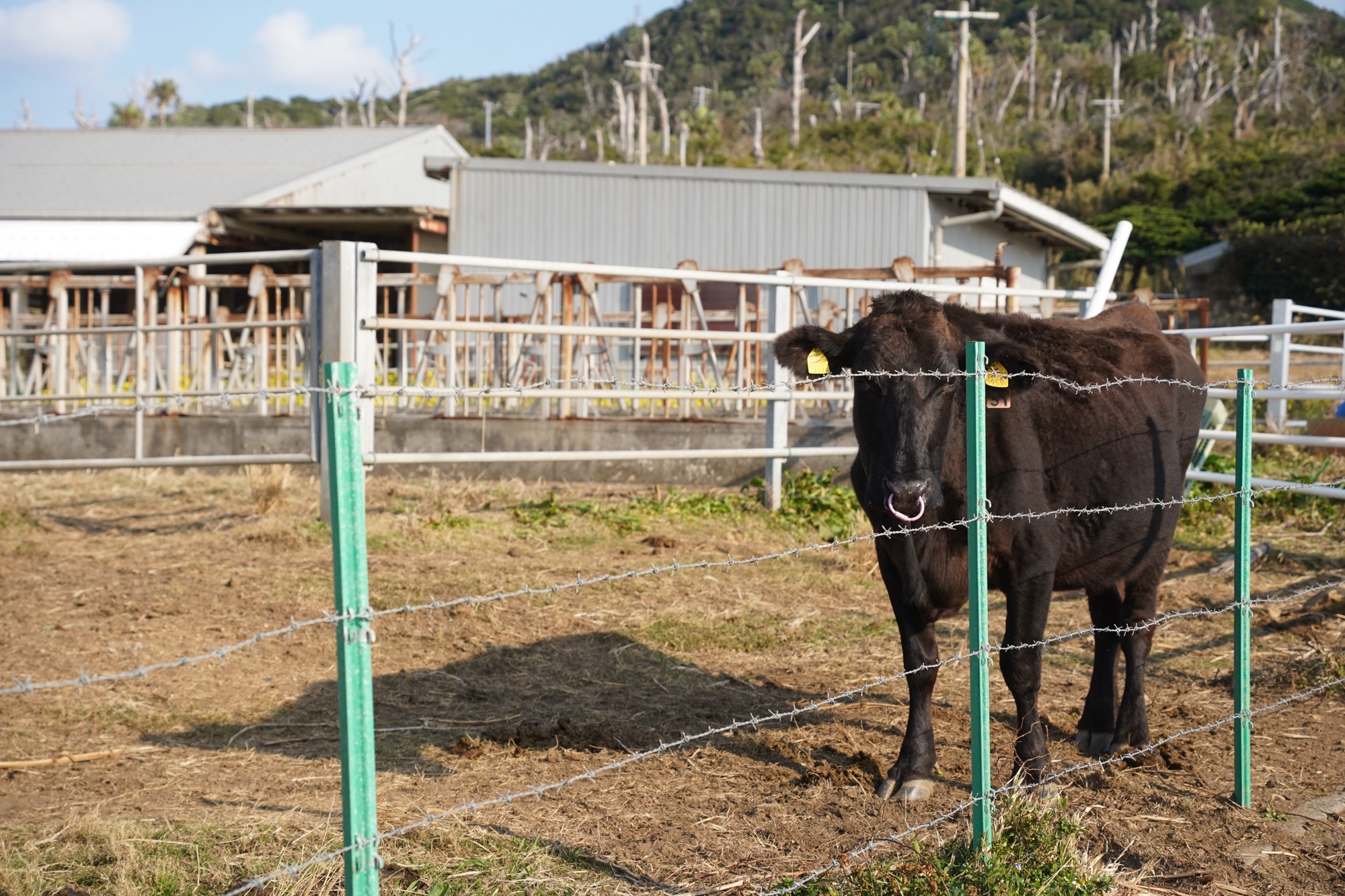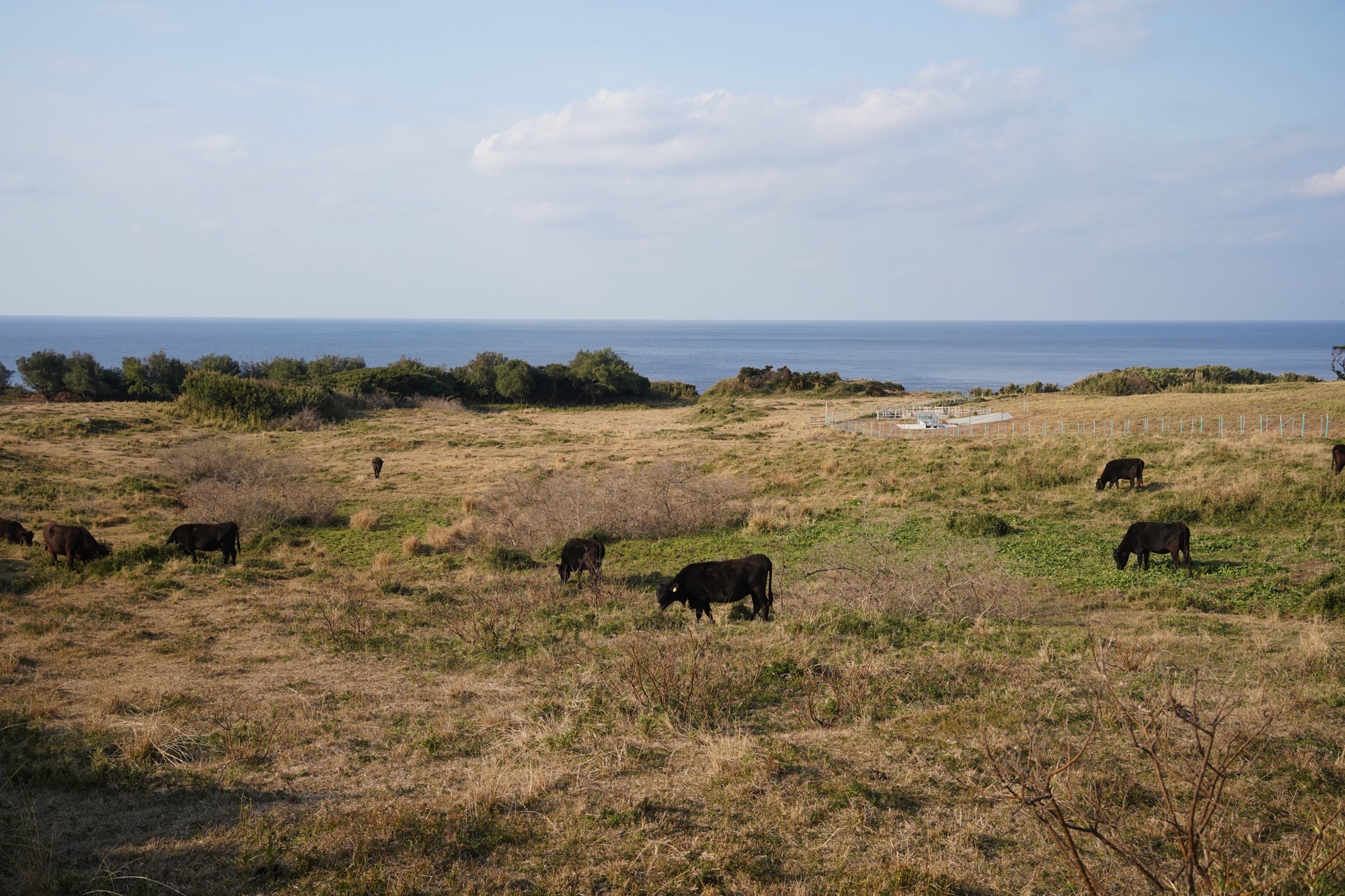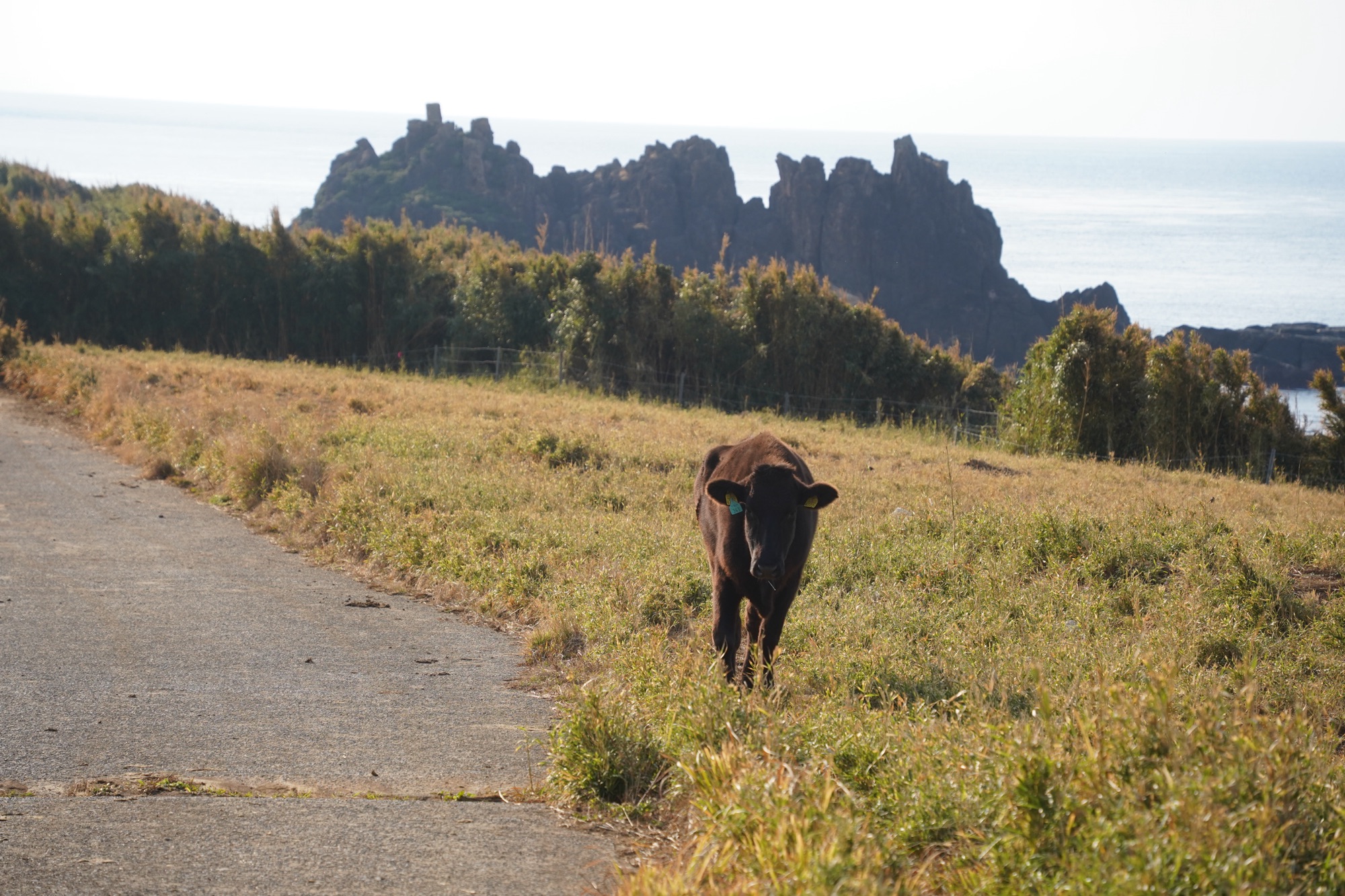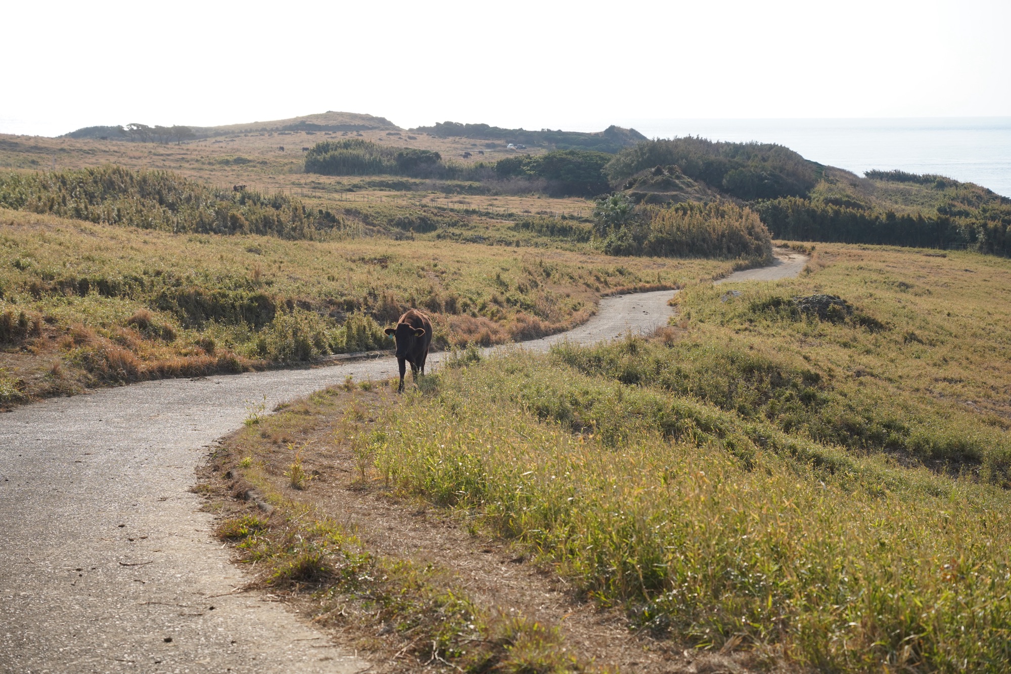 帰りは往路とは別の道を辿ろうと「大原牧場」の道を歩いた。歩いていると飼われている牛が後ろから付いて来たりして、雄大な島の大自然の中へと入り込んでいることを実感させられた。牧場+牛+海の組み合わせの風景が珍しくて新鮮だった。
