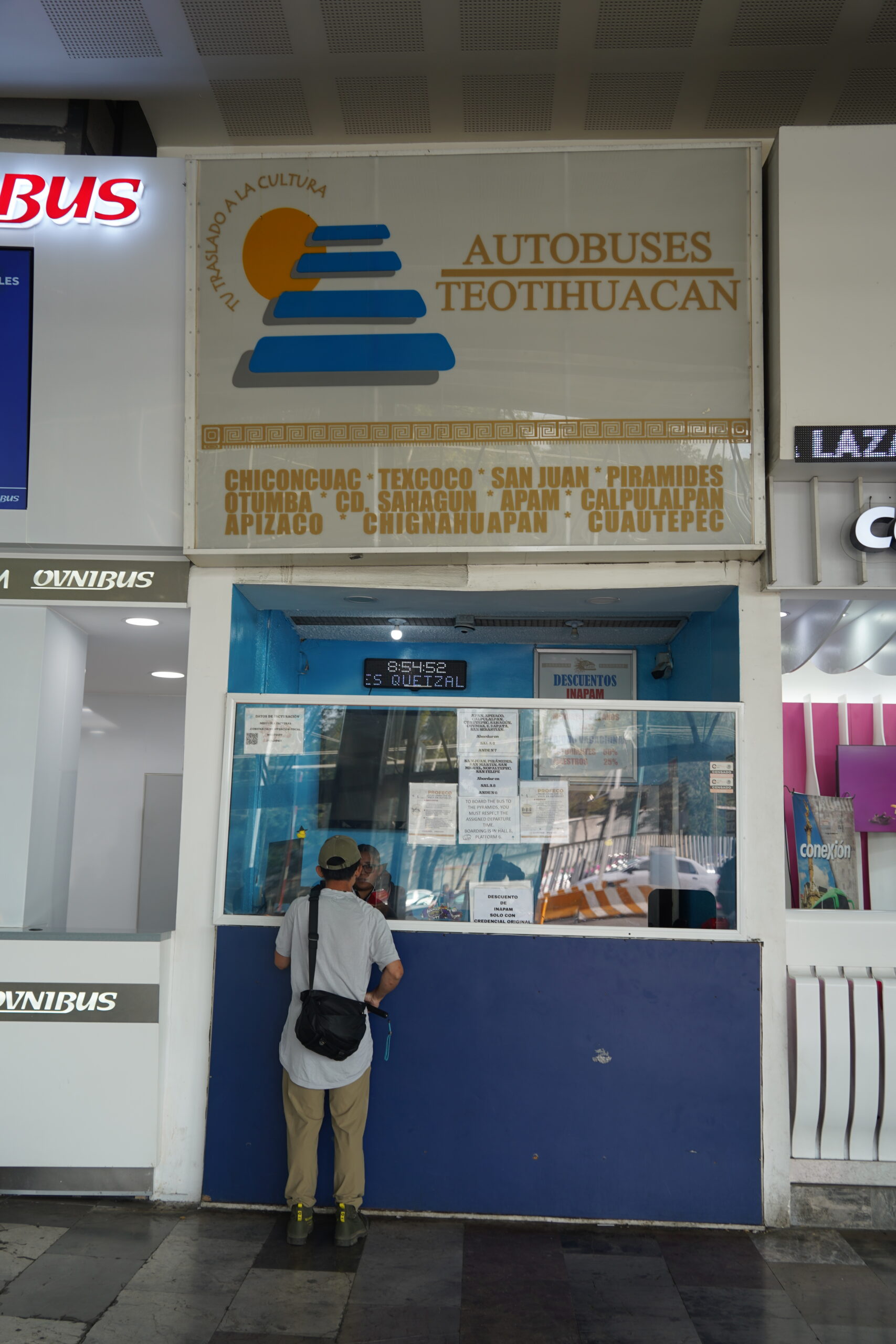 北バスターミナルはかなり広大だったが、入って左へ左へ進んでいくと「AUTOBUSES TEOTIHUACAN」というわかりやすい名前のカウンターが!TEOTIHUACANはこれから行くテオティワカンのこと、AUTOBUSとはスペイン語でバスのことだ。ここで往復バスチケットを購入。合計で150ペソだった。