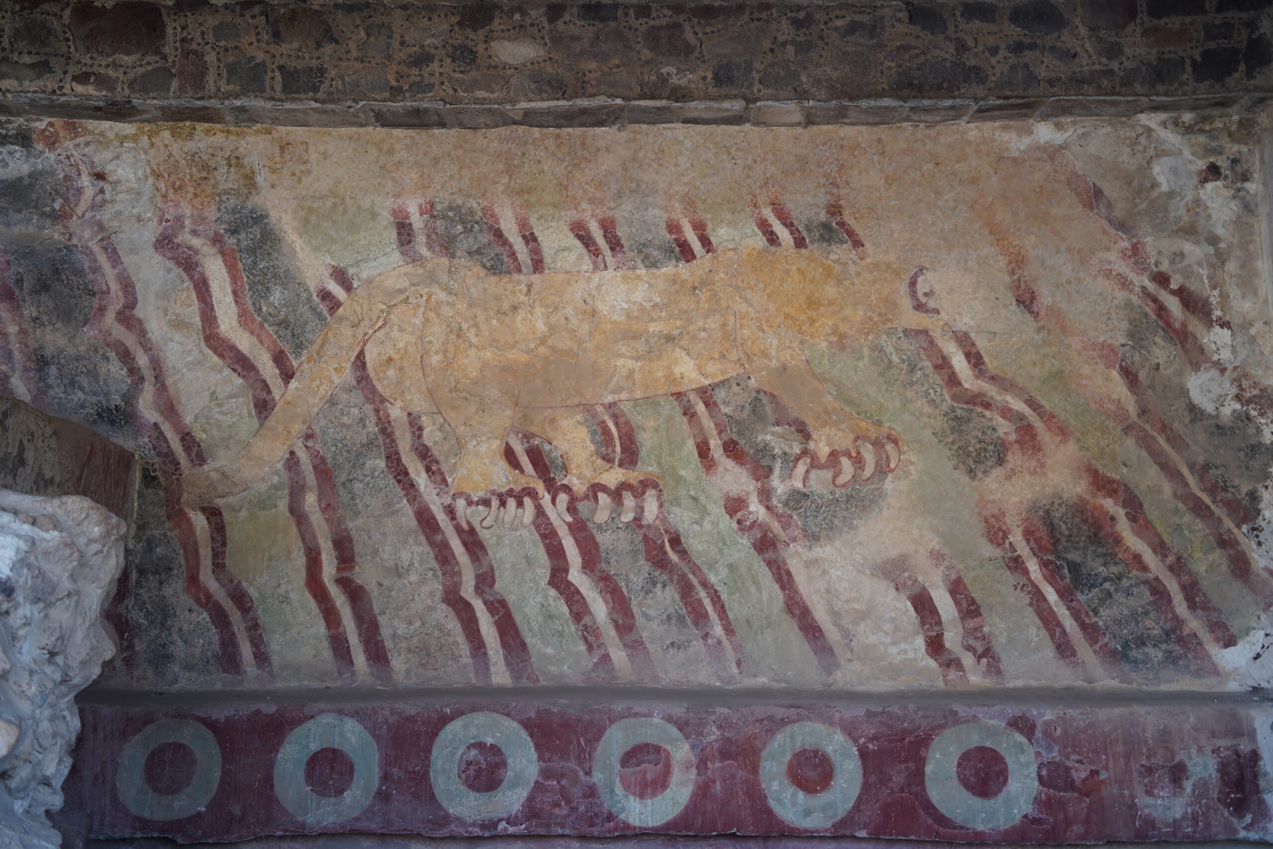 テオティワカンには色鮮やかなジャガーの壁画が残っている。ジャガーは古代メキシコでは最強の動物として、統治力や支配権を誇示するために描かれたという。昨日訪れた国立人類学博物館でも生贄の臓器を入れるジャガーの巨大像があったり、ジャガーの脚のお皿があったり、ジャガーと人間が融合した不思議な像があったりして、いかに古代メキシコにおいてジャガーが重要であったかを思い知らされた。