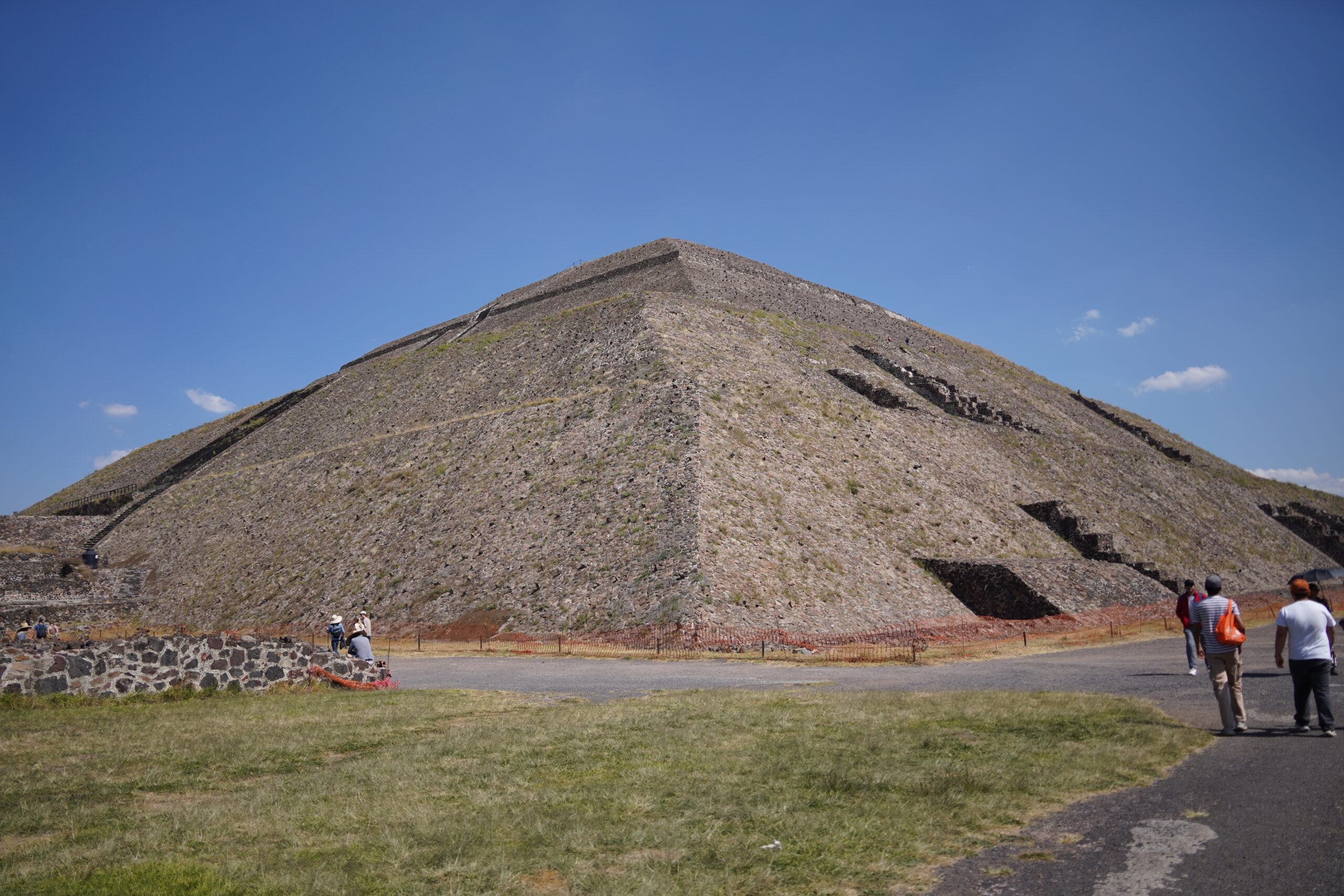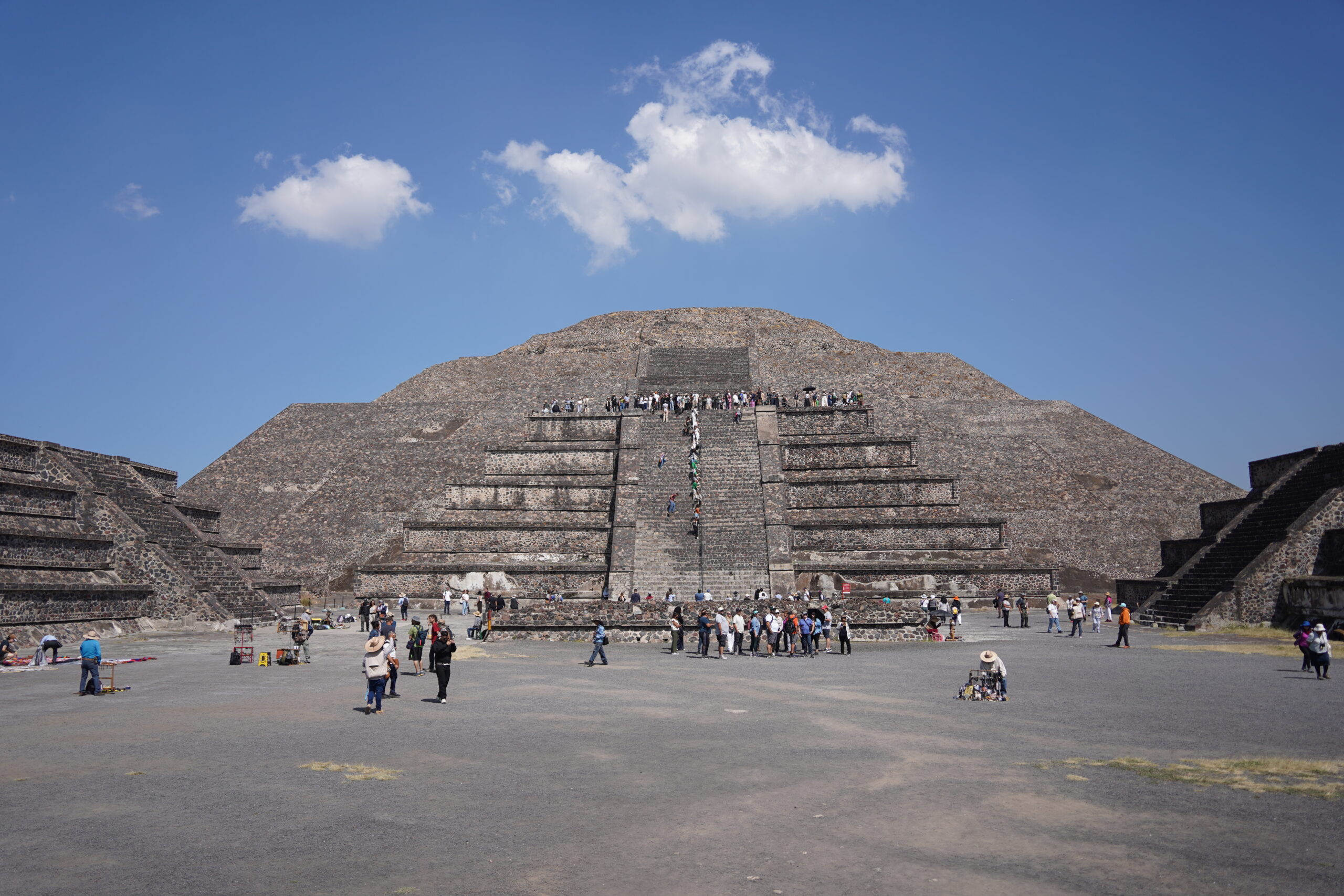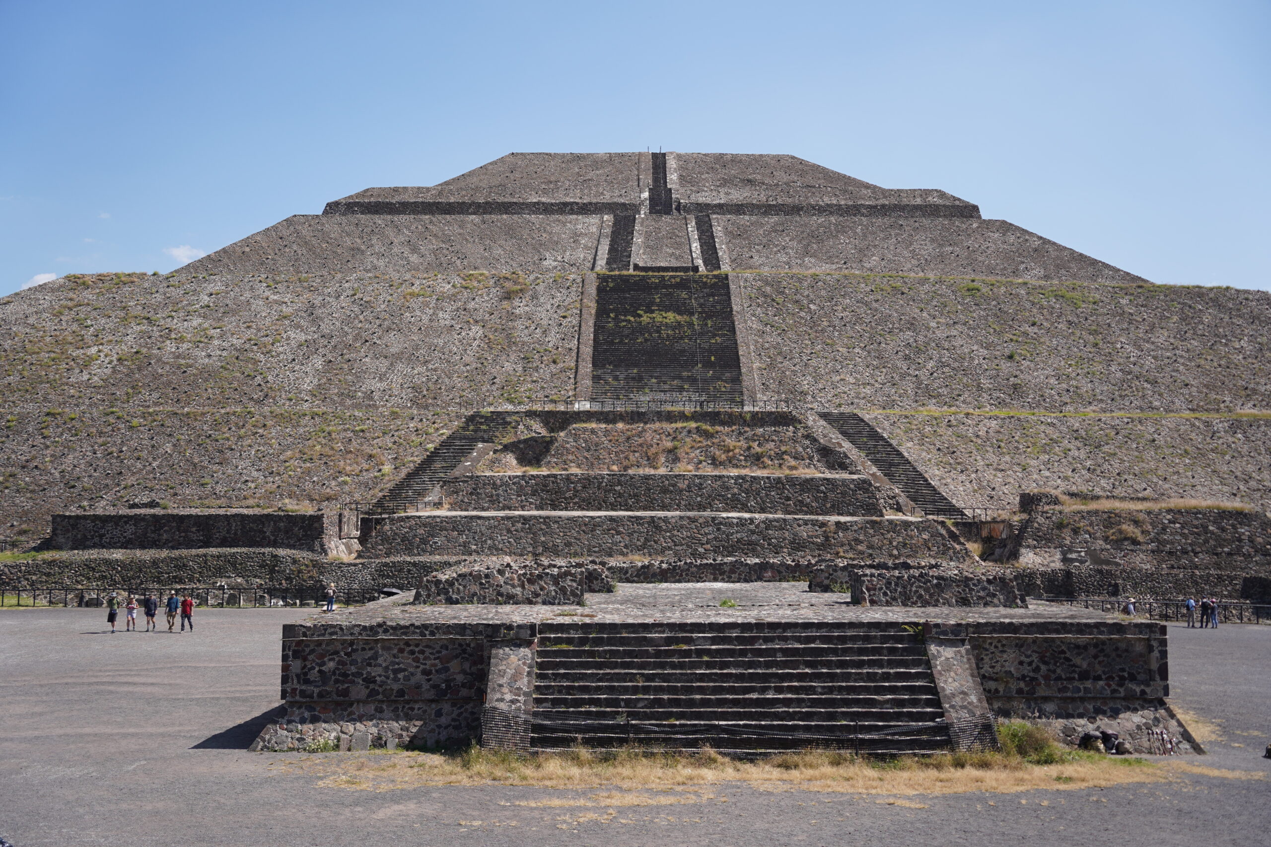 入り口から入ってまず最初に目の前に堂々と聳え立つのはテオティワカン内で最大、世界でも3番目に大きな「太陽のピラミッド」。紀元前から建築が開始された「太陽のピラミッド」は一辺の長さ225m、高さ65mとかなり巨大で、何と内部にはもうひとつのピラミッドが隠されているのだという。テオティワカンが滅びて放置されていたピラミッドを見て、後からやって来たアステカ人たちがこれこそ神が建てたものに違いないと信じ、アステカ神話を繁栄させて「太陽のピラミッド」「月のピラミッド」と名付けた。以前は「太陽のピラミッド」の248段ある階段を頂上まで登れたらしいが、残念ながら2025年現在は進入禁止となっていた。