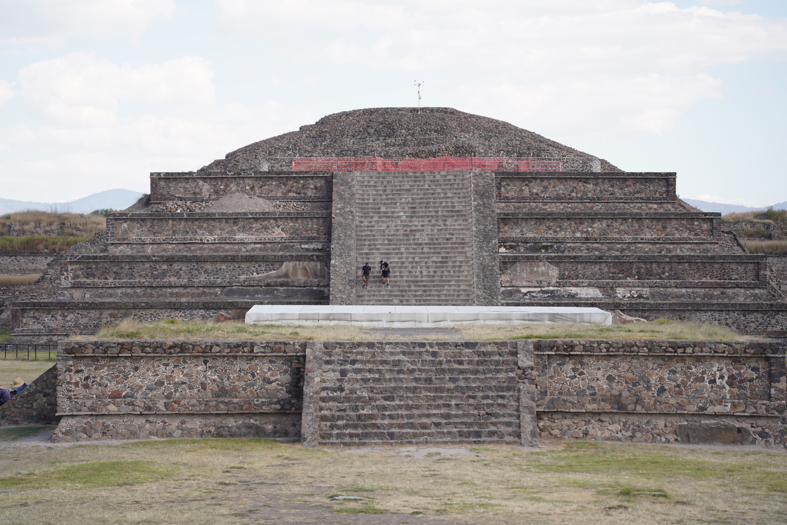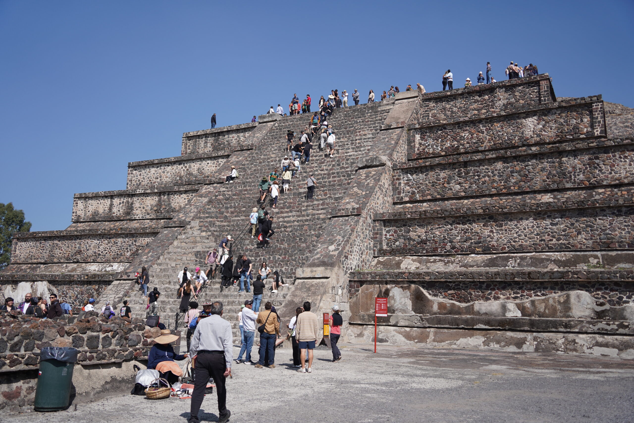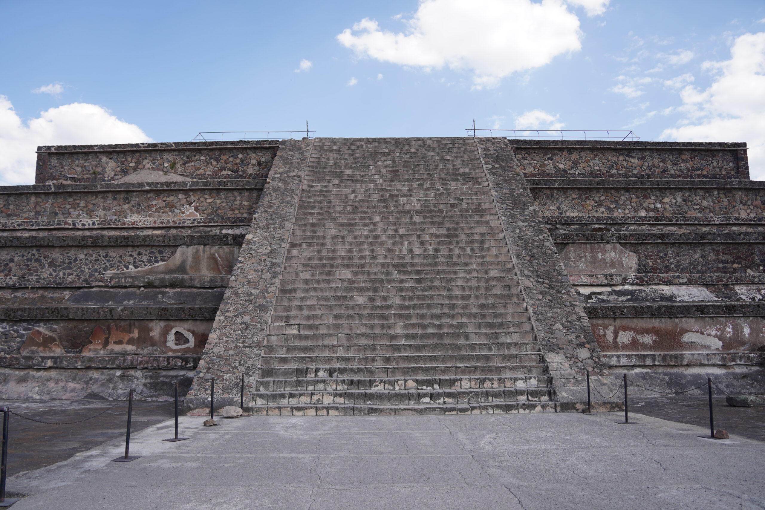 入り口から入ってまず最初に目の前に堂々と聳え立つのはテオティワカン内で最大、世界でも3番目に大きな「太陽のピラミッド」。紀元前から建築が開始された「太陽のピラミッド」は一辺の長さ225m、高さ65mとかなり巨大で、何と内部にはもうひとつのピラミッドが隠されているのだという。テオティワカンが滅びて放置されていたピラミッドを見て、後からやって来たアステカ人たちがこれこそ神が建てたものに違いないと信じ、アステカ神話を繁栄させて「太陽のピラミッド」「月のピラミッド」と名付けた。以前は「太陽のピラミッド」の248段ある階段を頂上まで登れたらしいが、残念ながら2025年現在は進入禁止となっていた。