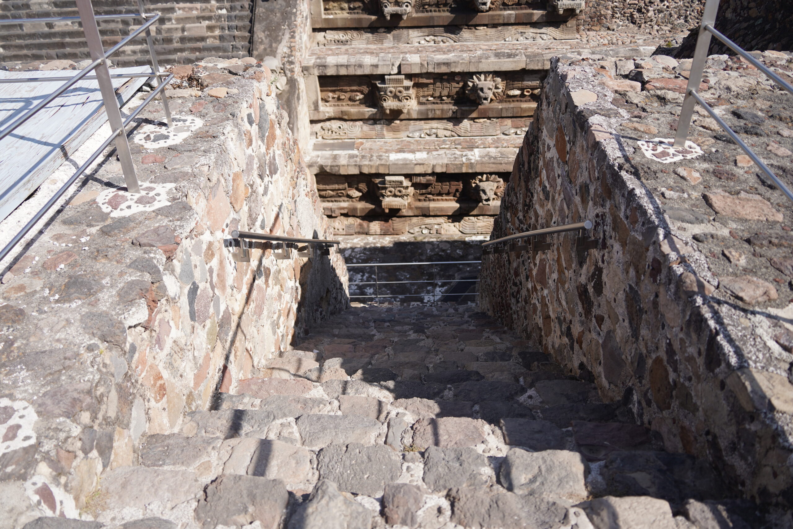 まずは普通のピラミッドのようなものが見えて来て、まぁ普通だな、これまでの「太陽のピラミッド」や「月のピラミッド」とどうせ同じようなものだなとやや落胆しつつも、せっかくわざわざここまで来たのだからと目の前にあるピラミッドの階段を登って行くと、何とその後ろにはまるで隠されたように下りの階段が続いていていた。この先には一体何があるのだろうと階段を下っていくと、古代の神秘的で荘厳な世界が目の前に繰り広げられていた!
