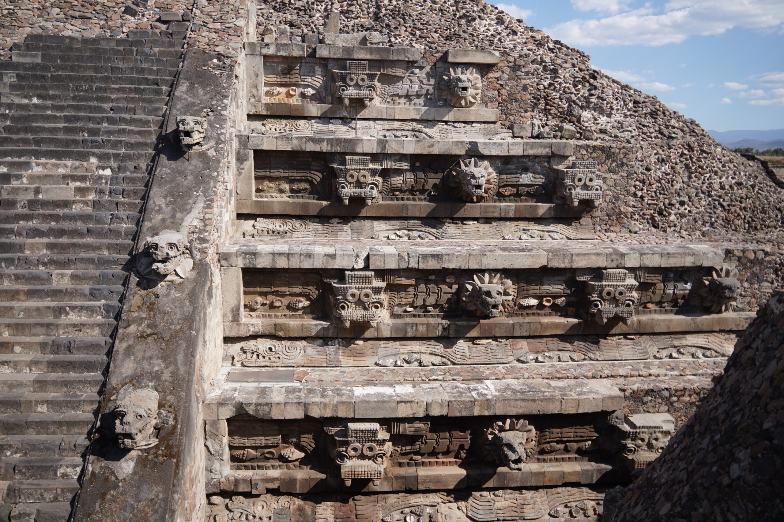 すごーい!昨日の国立人類学博物館で見た展示の本物はこれだったのか!「ケツァルコアトルのピラミッド」には2つの顔が交互に取り付けられていて龍のように見えるのはケツァルコアトル、その隣にあるロボットのような顔はトラロックという神様だ。ケツァルコアトルの原型は水や農耕の蛇神だったが、テオティワカン文明期(紀元前2世紀〜6,7世紀)には羽が生えた龍のような架空の姿となり生命、光、豊穣、文明、知識の神など様々な役割が付け加えられた。トラロックは雨と雷の神様だということから、2つの根源的な意味合いは似通っているといると言うことができる。