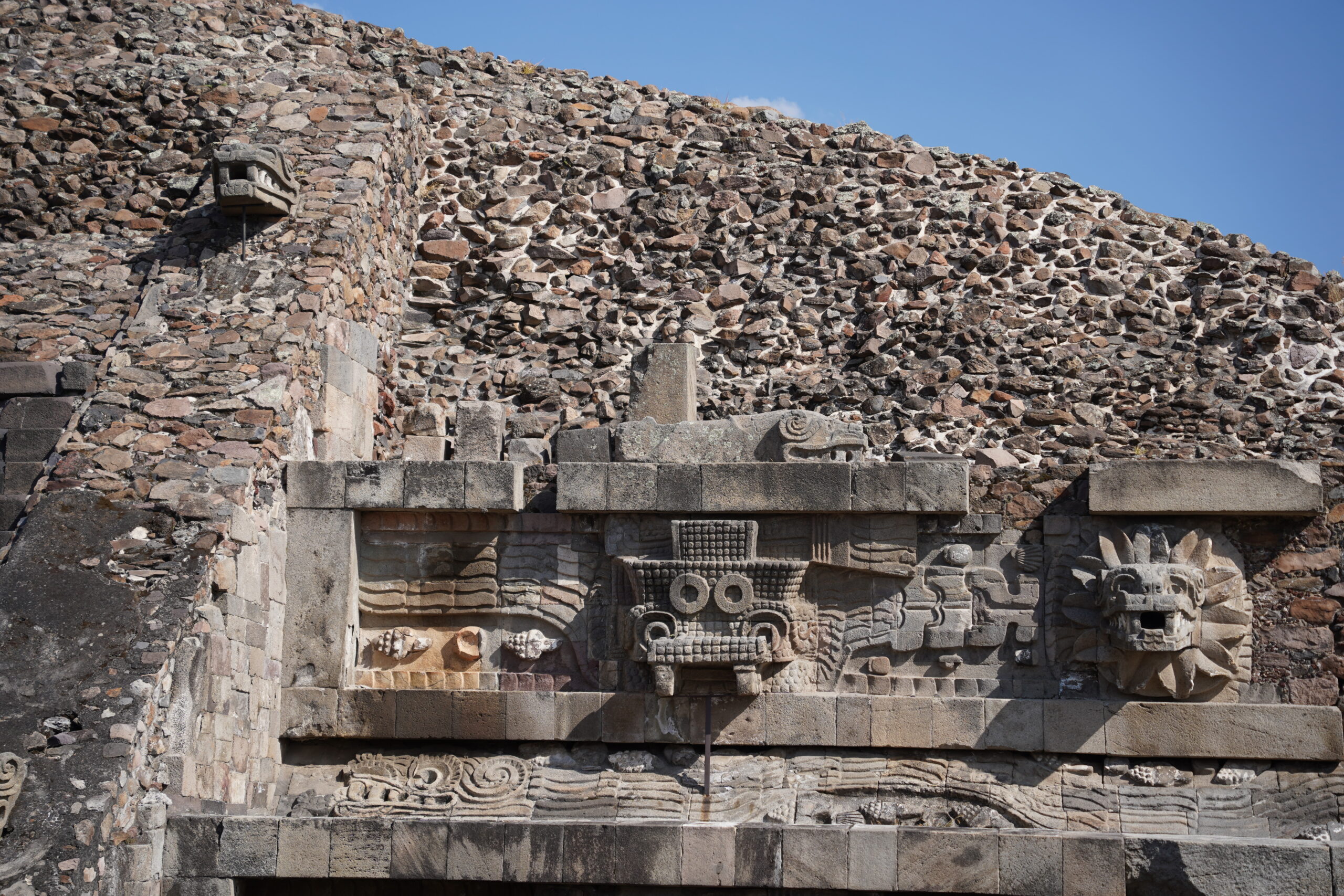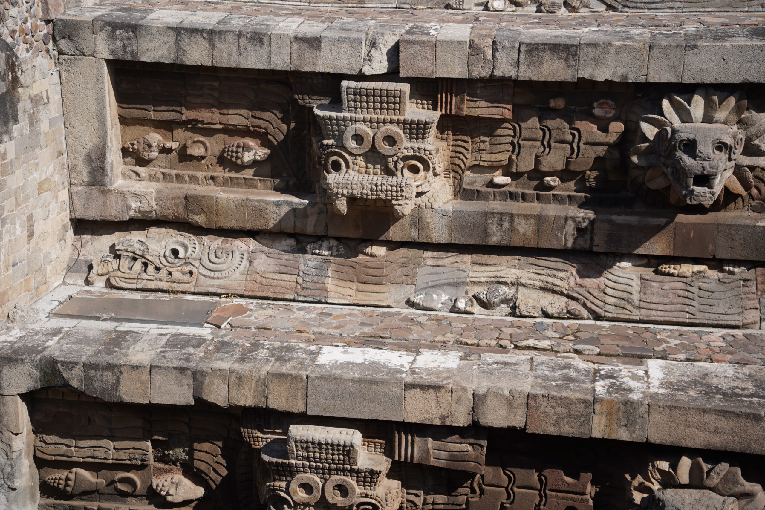 ケツァルコアトルやトラロックの顔像の下には、まるで蛇のような龍のような彫刻が横たわっており、これもおそらくケツァルコアトル的な性格を持つ神様(もしくは同一)だろうと予測できる。