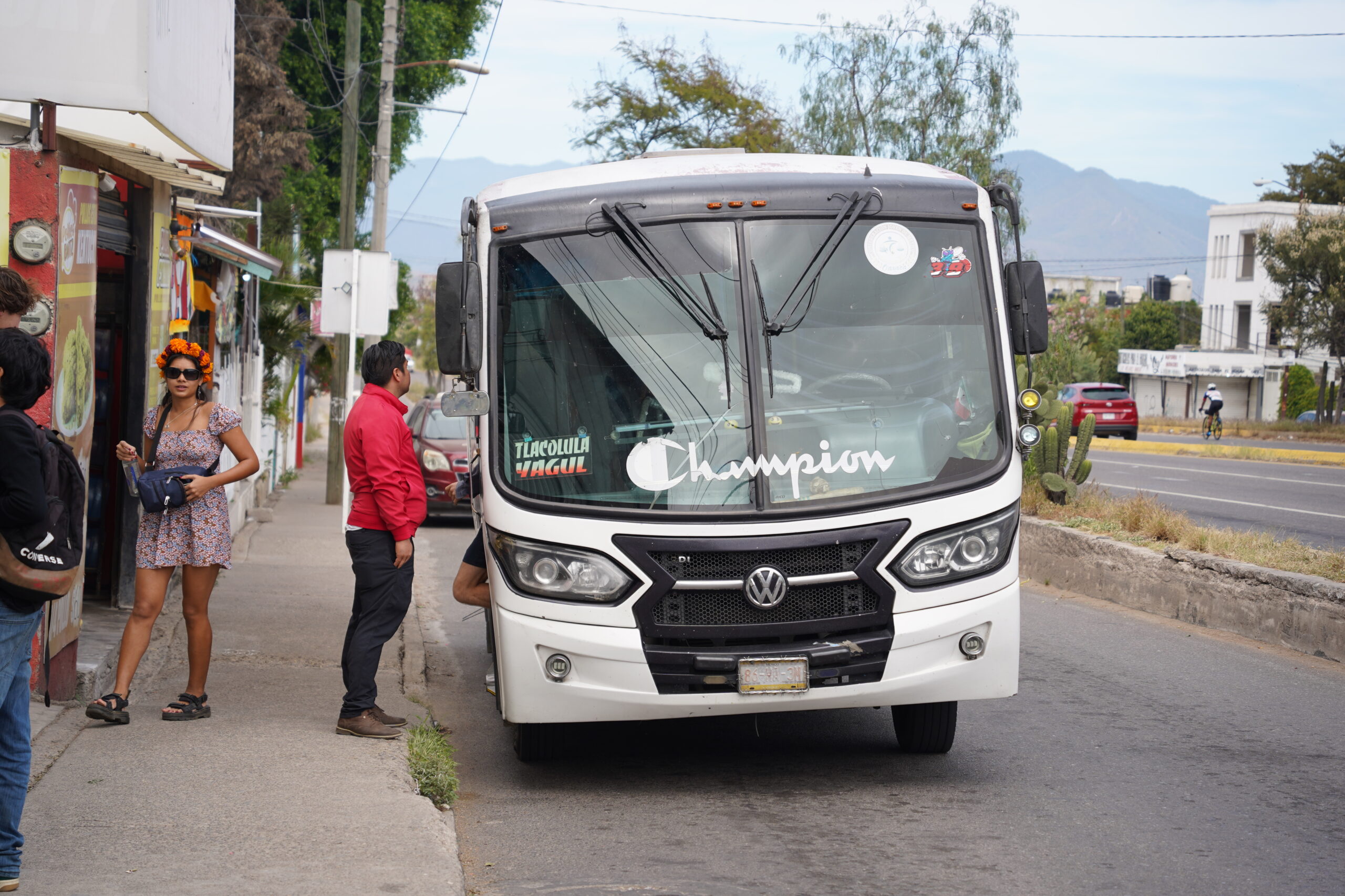 このバス停で待っていればTLACOLULA=トラコルーラという看板が掲げられたローカルバスがやって来るので、それに乗り込もう。