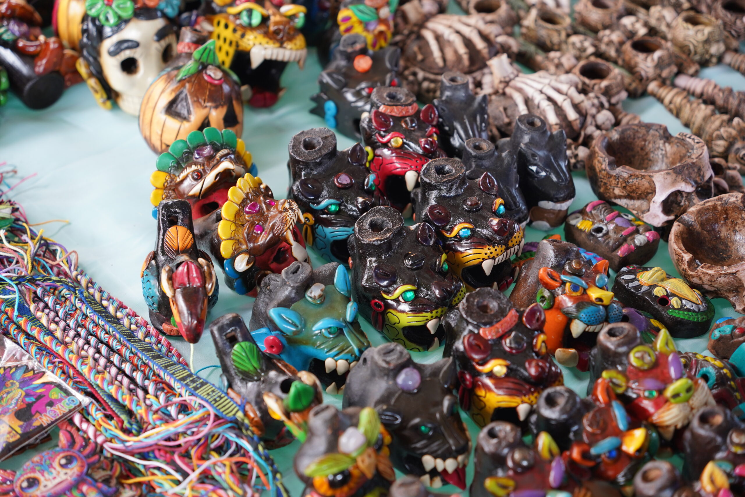 カラフルなドクロの置物や、けたたましい音が鳴り響く動物の笛なんかは、メキシコのどこにでもある定番のお土産品だ。