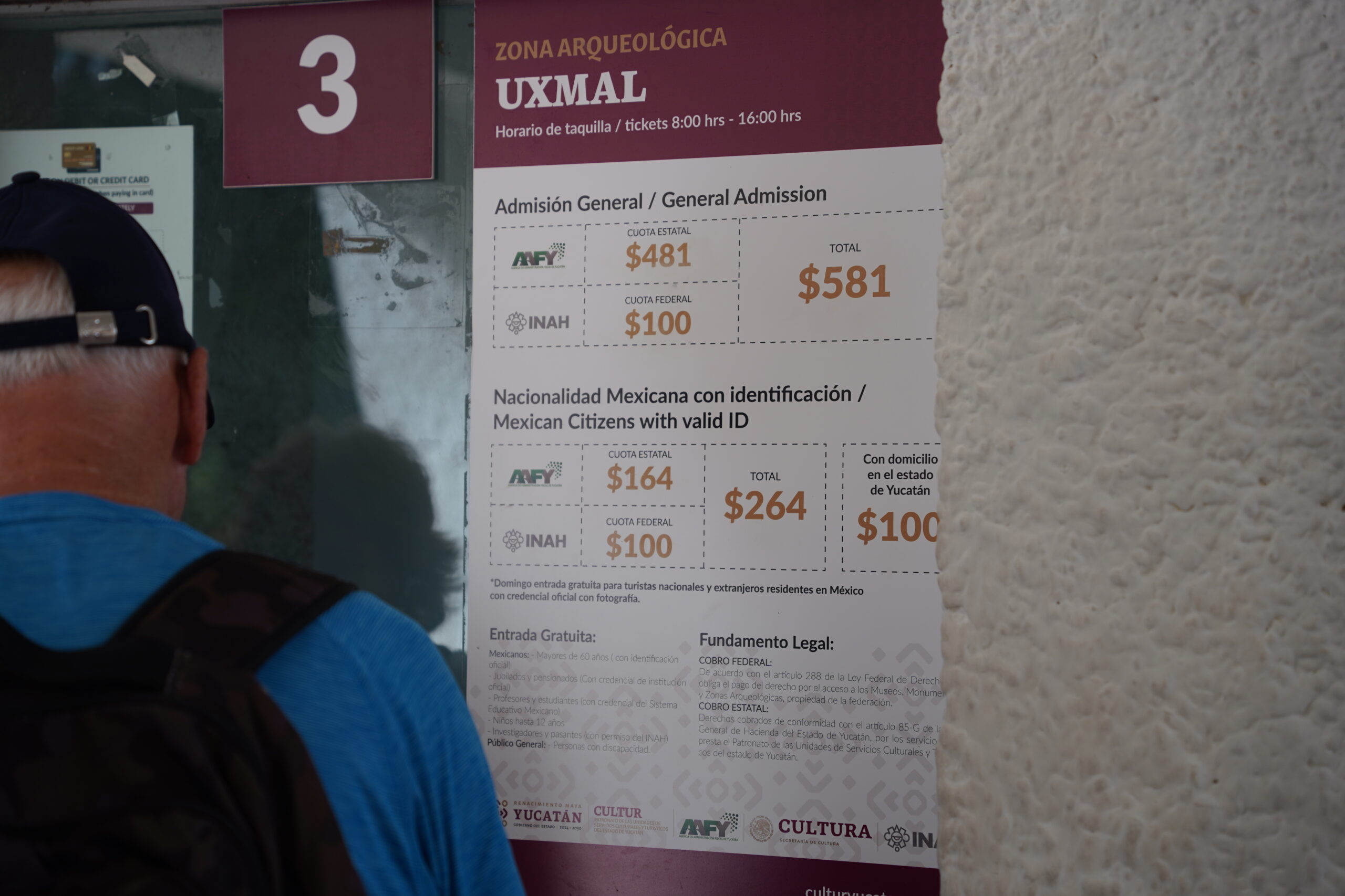 ウシュマルの入場料は合計で581ペソ(5000円くらい)だった。チチェン・イッツァほどではないが物価から考えるとやっぱりかなり高額!メキシコはどこでもクレジットカードが使えるイメージだが、ウシュマルでは税金分の100ペソは現金でしか支払えないので注意。
