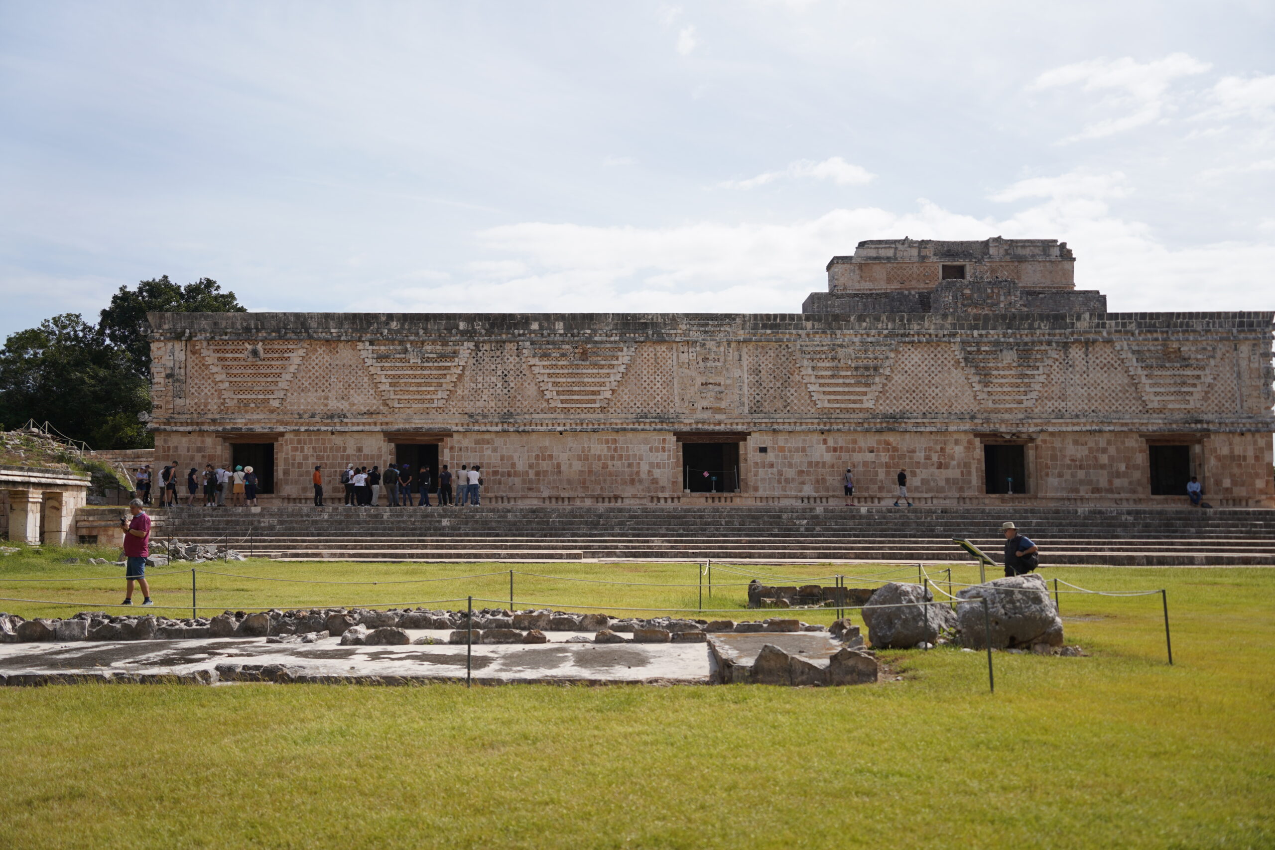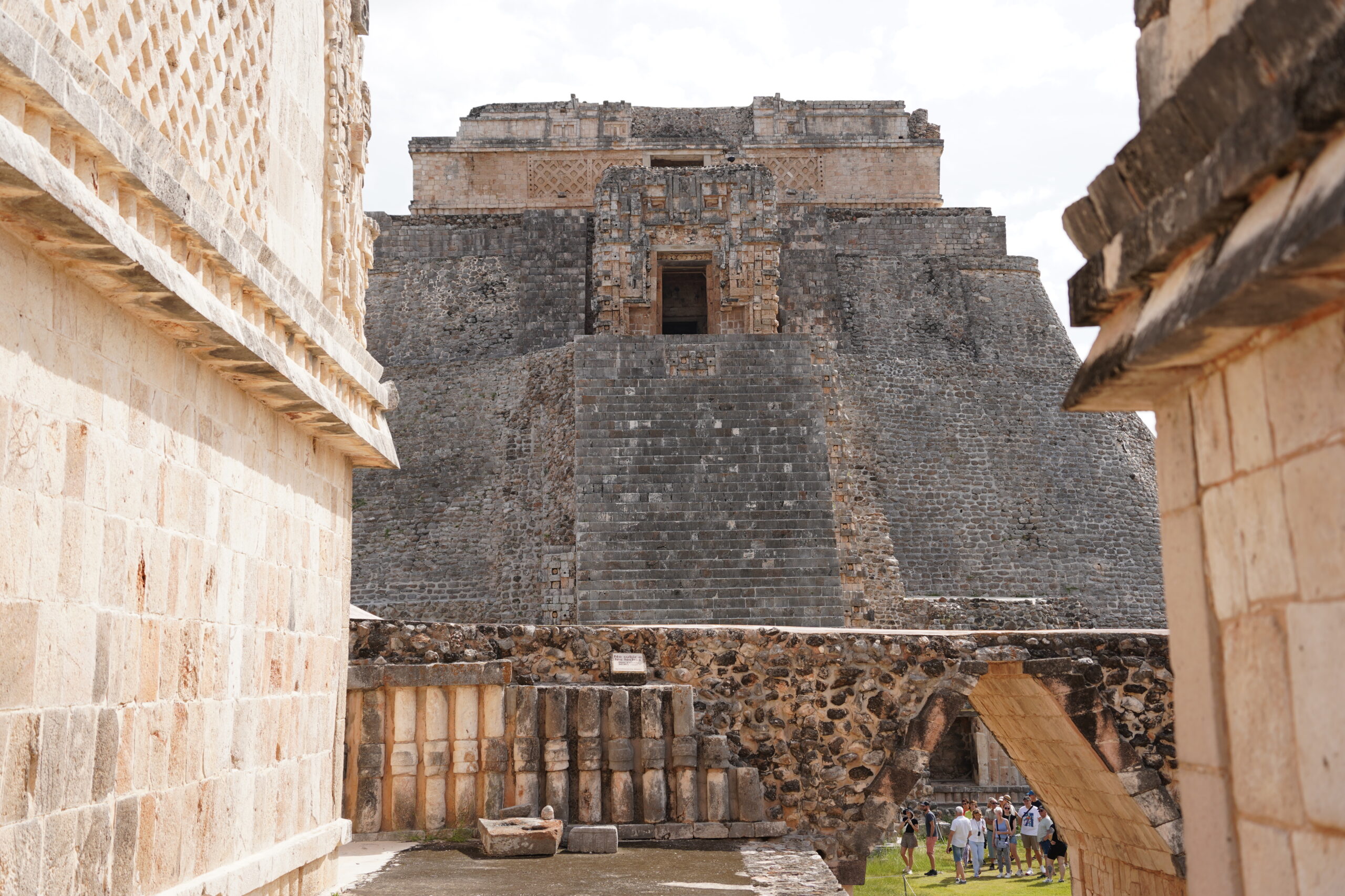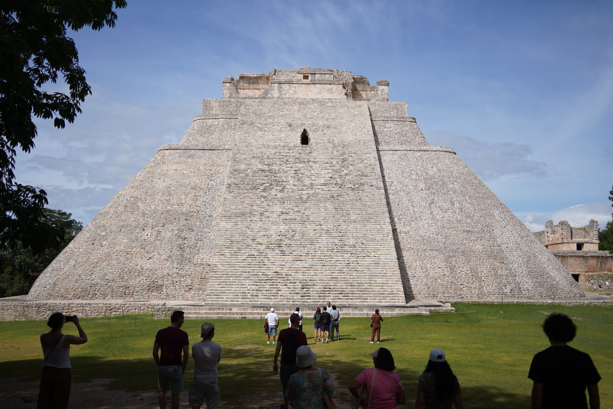 ウシュマルに入ってまず目の前に聳え立っているのが、ウシュマル最大の建造物である「魔法使いのピラミッド」だ。高さ35mの巨大なマヤ建造物で、後期古典期である6世紀から10世紀の間に5つの段階を経て建設され、それぞれ異なる建築様式を反映している。この13層のピラミッドは象徴的な意味で大地と天空、そして人間と神々を繋いでおり、内部に隠された4つの神殿及び頂上の神殿は様々な宗教儀式や時を数える儀礼、そして人身供犠を行う場所として指定された。