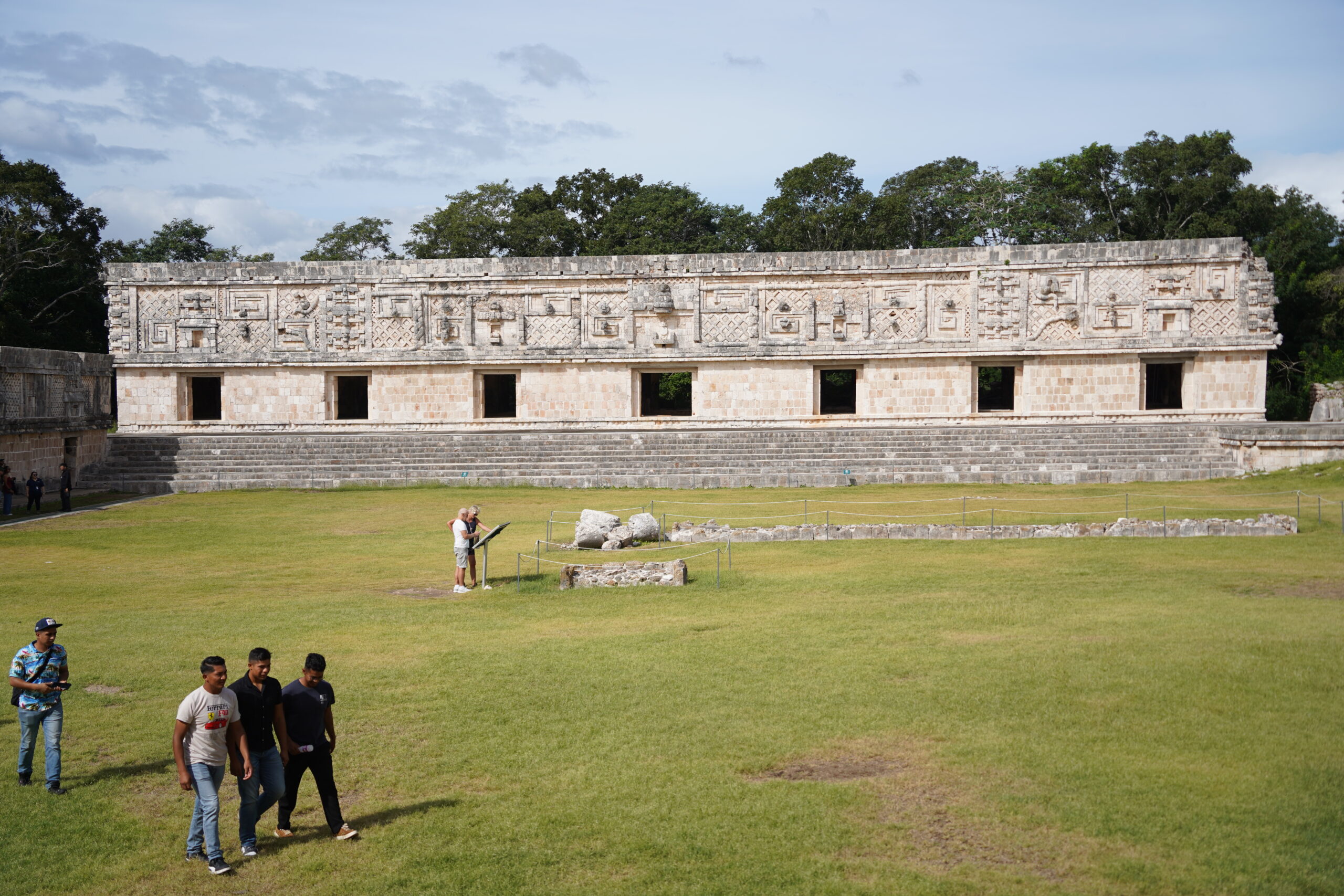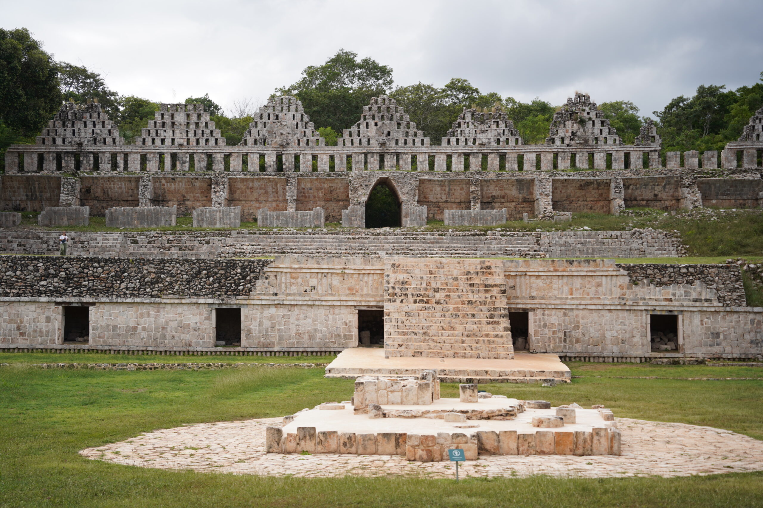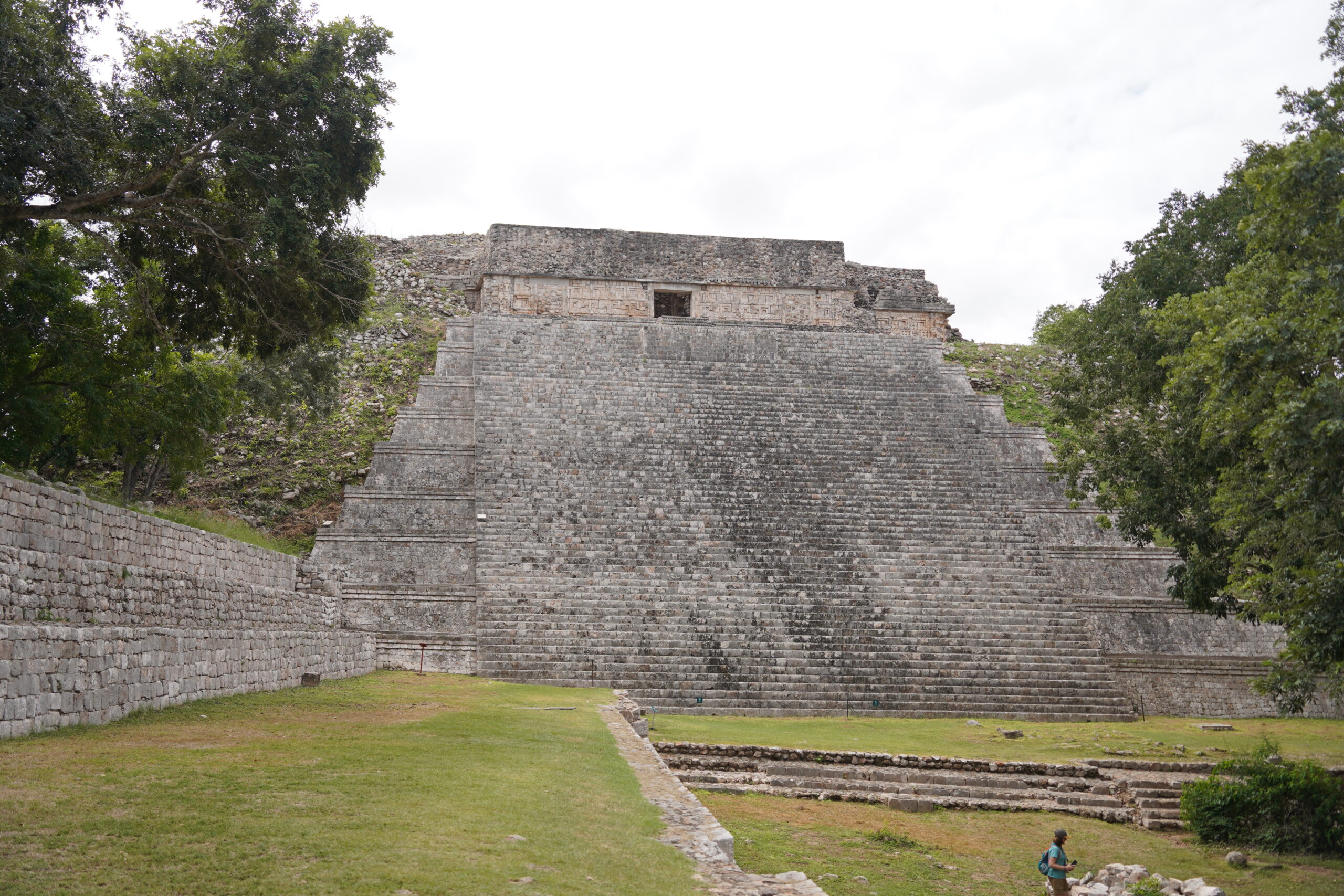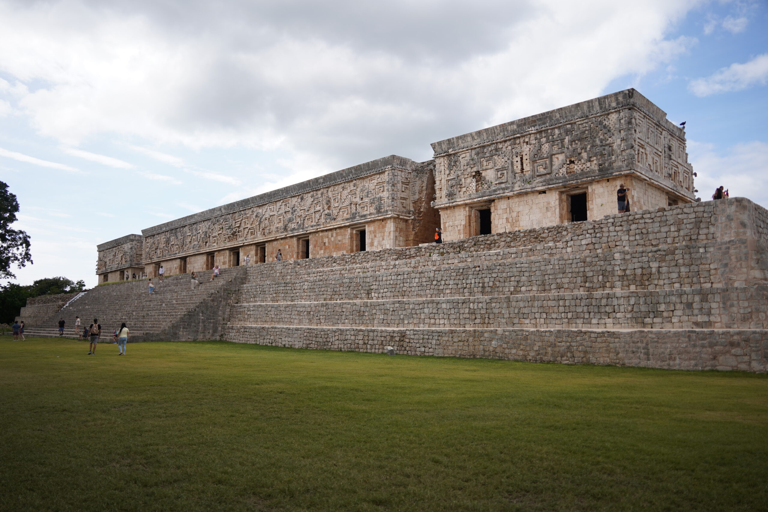 ウシュマルに入ってまず目の前に聳え立っているのが、ウシュマル最大の建造物である「魔法使いのピラミッド」だ。高さ35mの巨大なマヤ建造物で、後期古典期である6世紀から10世紀の間に5つの段階を経て建設され、それぞれ異なる建築様式を反映している。この13層のピラミッドは象徴的な意味で大地と天空、そして人間と神々を繋いでおり、内部に隠された4つの神殿及び頂上の神殿は様々な宗教儀式や時を数える儀礼、そして人身供犠を行う場所として指定された。