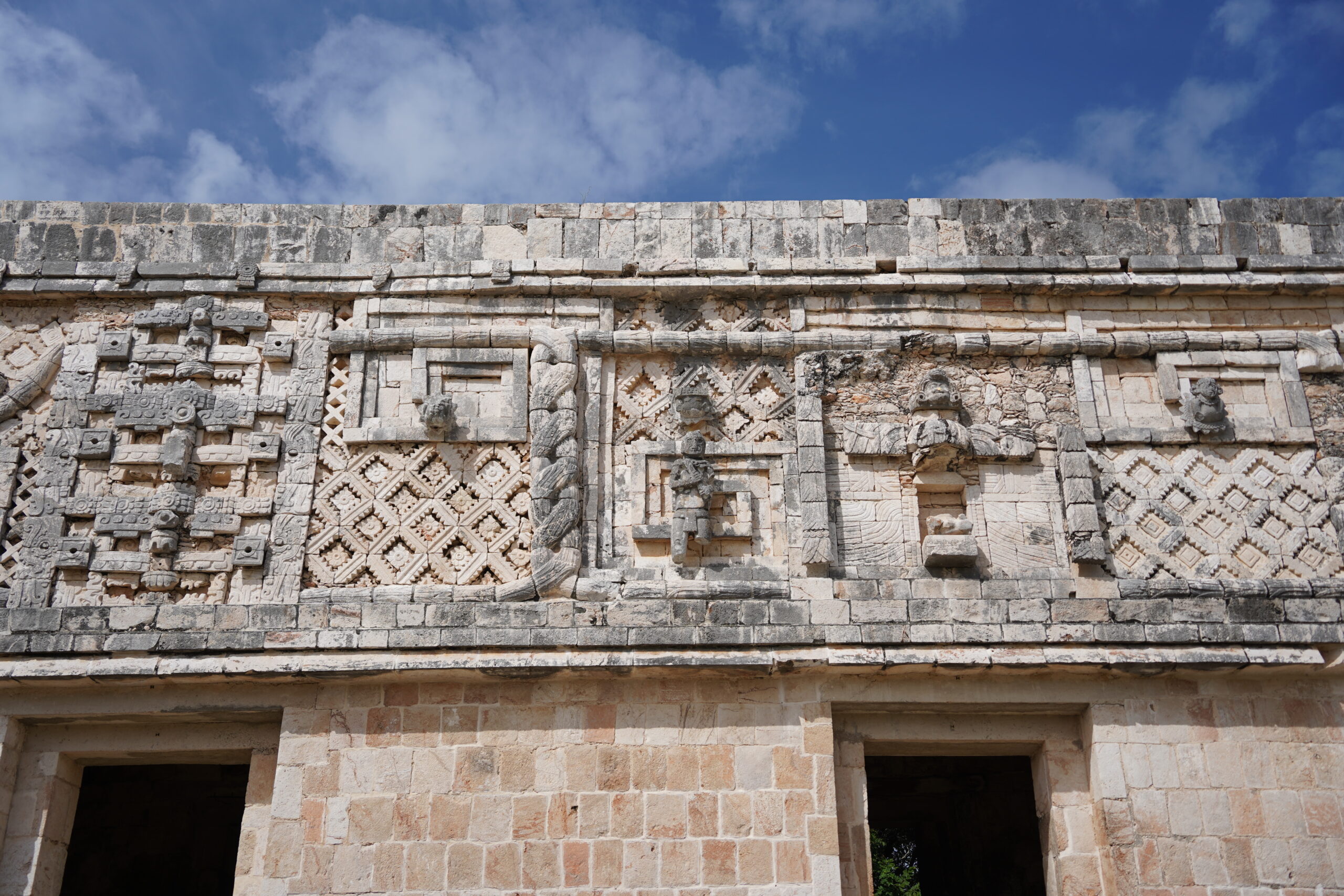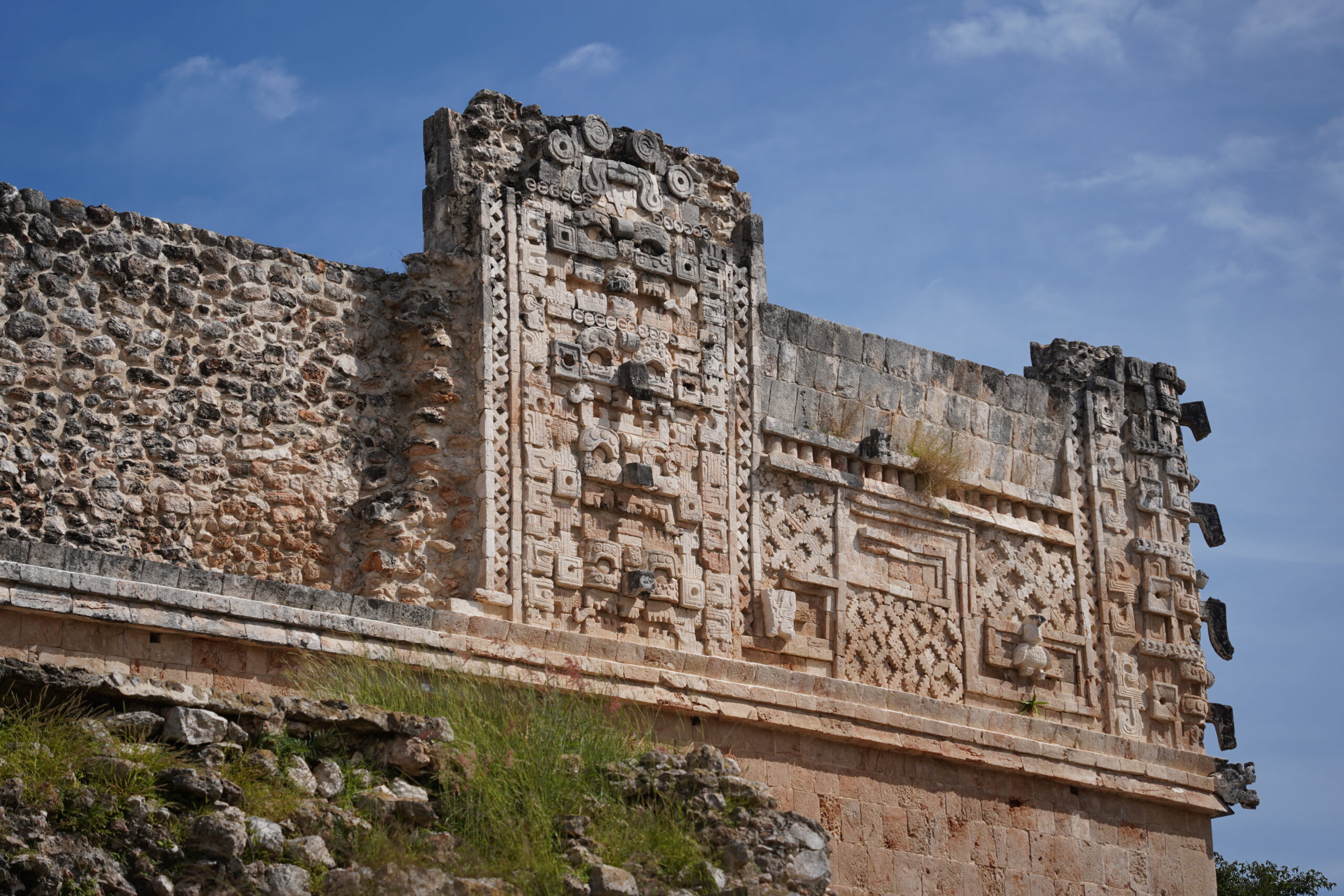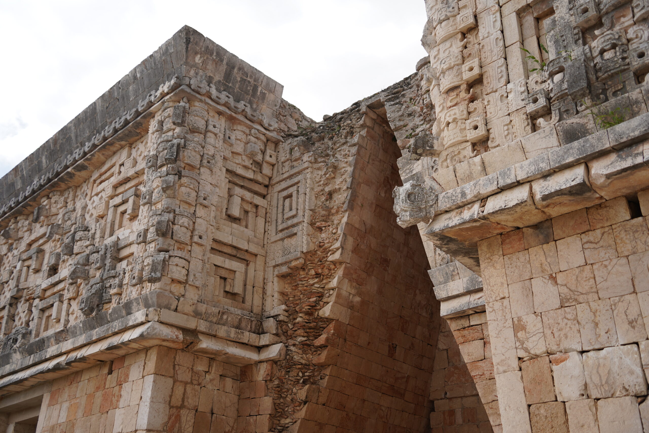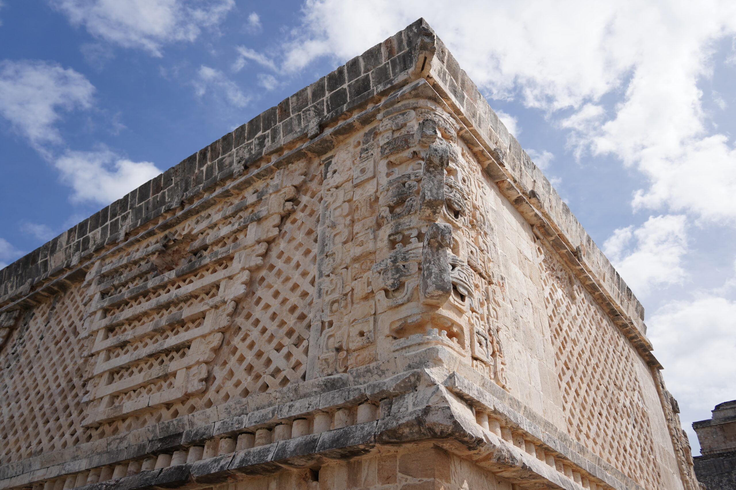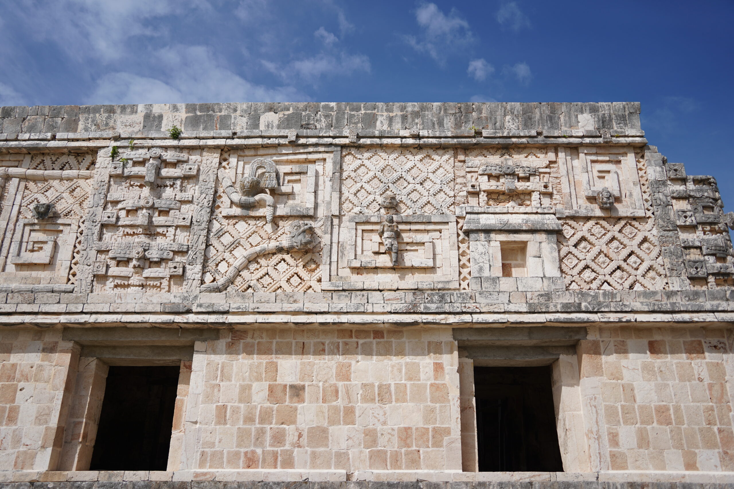 ウシュマルはマヤ古典期後期の西暦700〜1000年頃に繁栄した都市で、装飾が最も洗練されているプウク様式建築の最高傑作として知られる。プウクとはマヤ語でユカタン半島中央の丘陵地帯を指し、プウク様式建築では建物の壁一面の複雑な幾何学模様や雨の神様チャク像などが特徴的だ。ウシュマルには川もセノーテ(泉)もないので水の確保が困難であり、その結果として雨の神様チャクが厚く信仰されるようになったと言われる。10世紀頃になるとウシュマルはメキシコ中央高原からやって来たシウ人に占拠され、それ以降はククルカン(チチェン・イッツァでよく見られる羽毛の生えた蛇の神)も崇拝の対象になった。