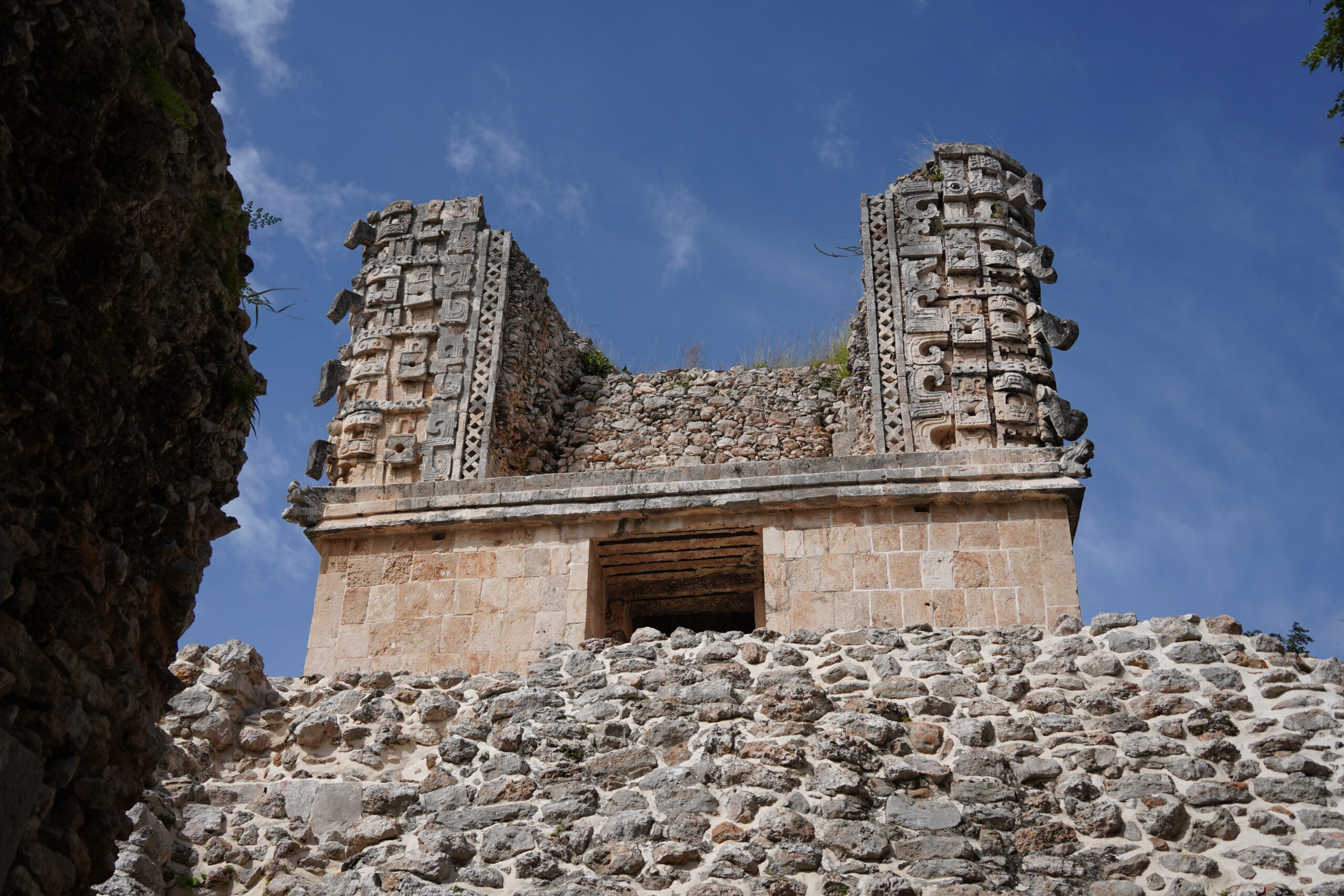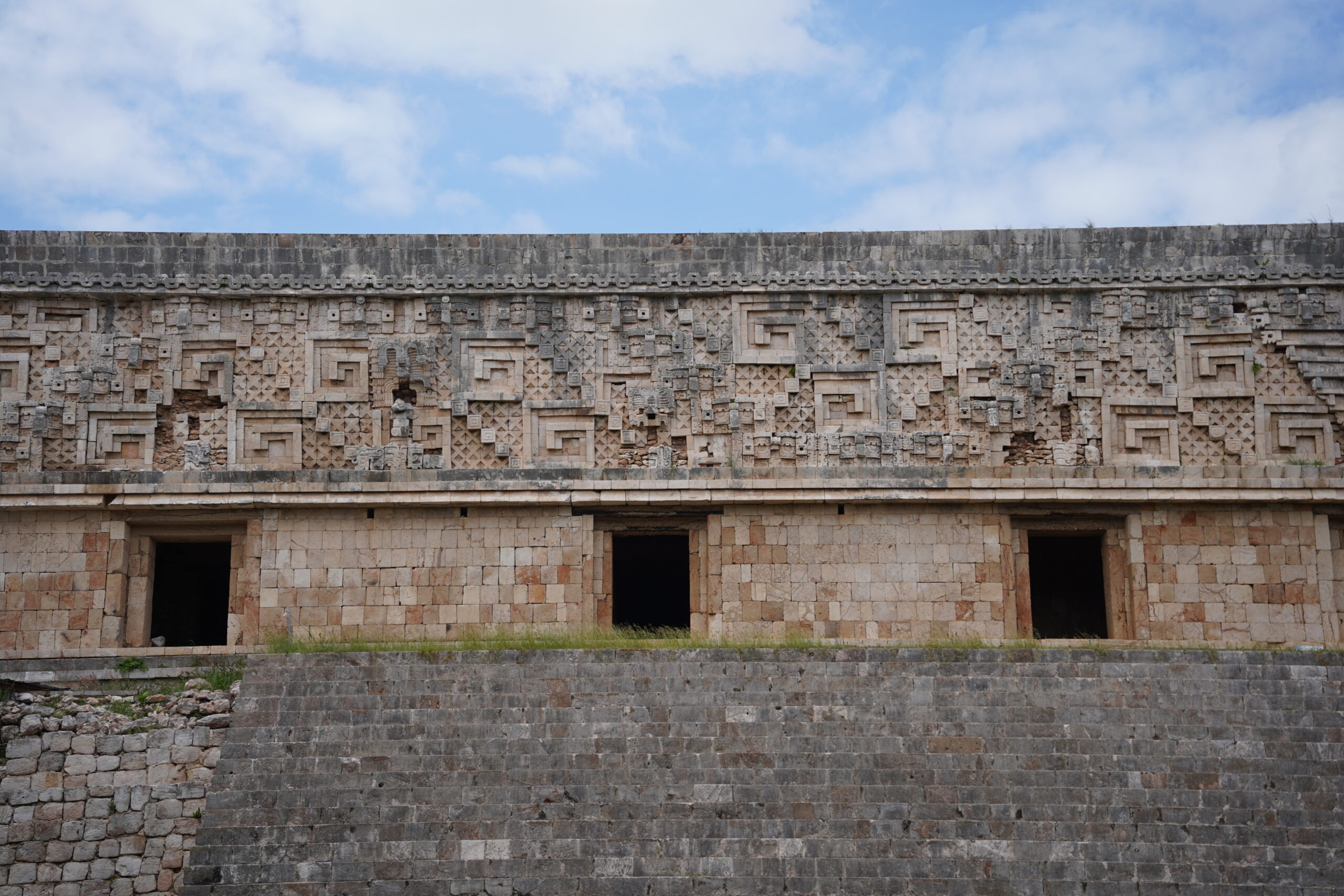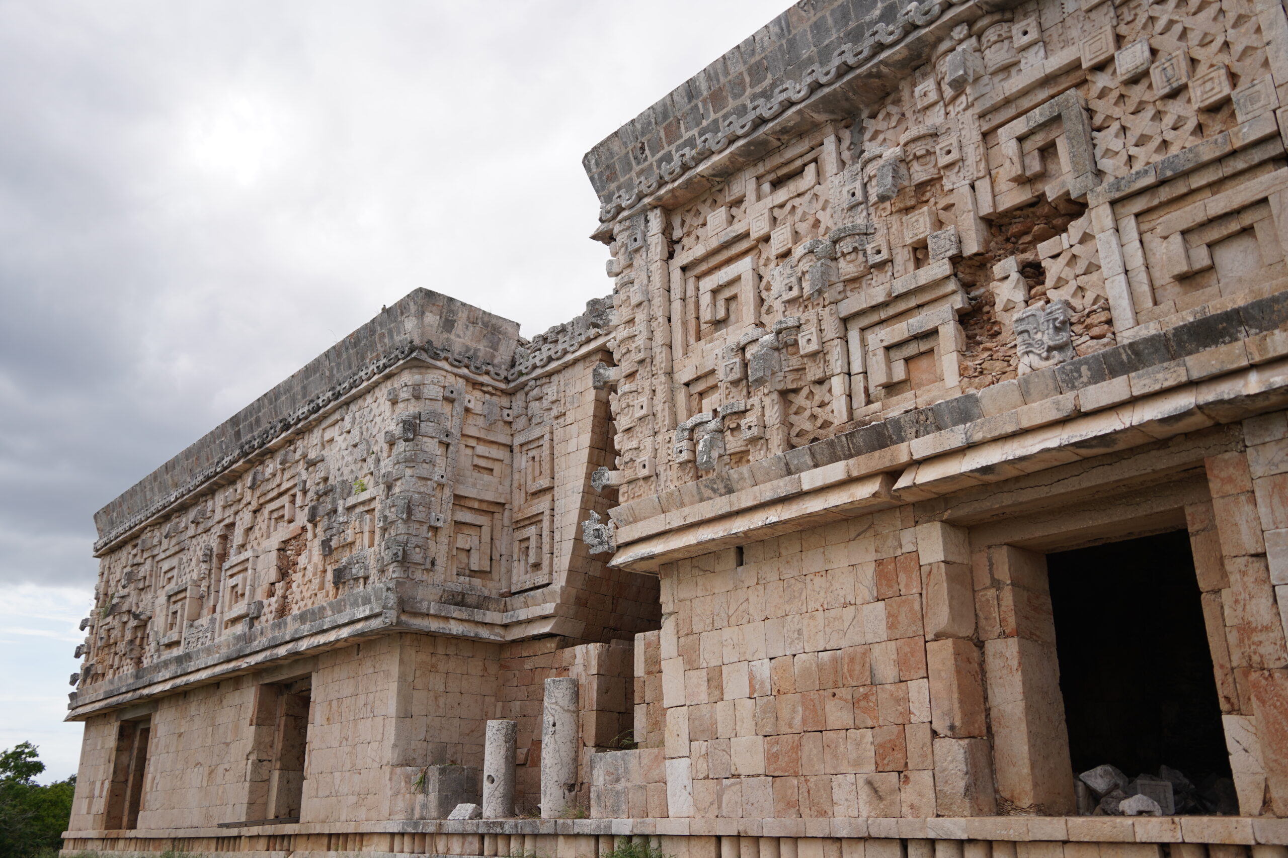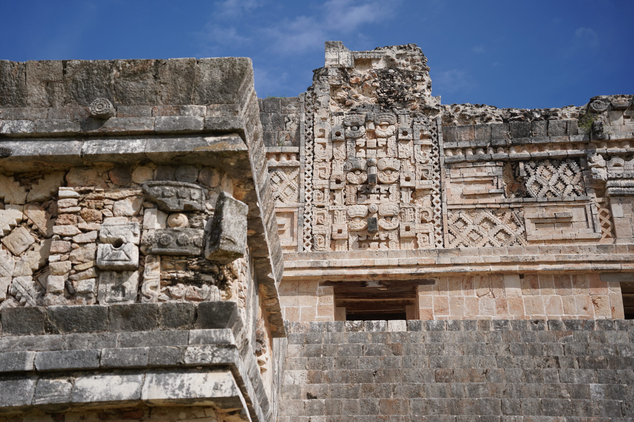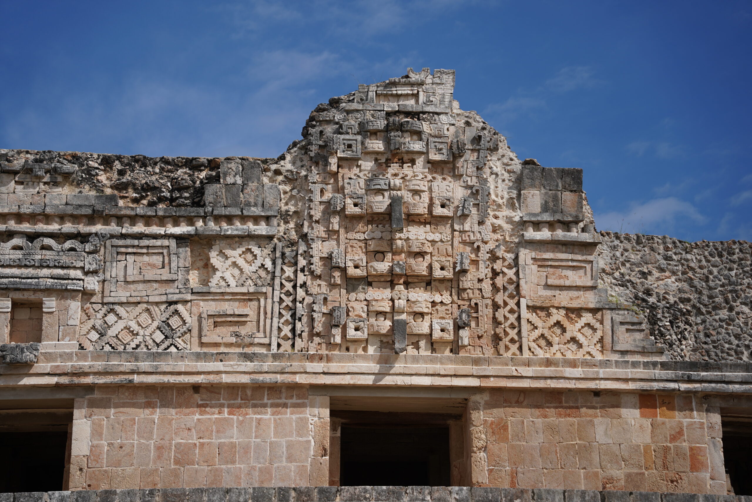 ウシュマルはマヤ古典期後期の西暦700〜1000年頃に繁栄した都市で、装飾が最も洗練されているプウク様式建築の最高傑作として知られる。プウクとはマヤ語でユカタン半島中央の丘陵地帯を指し、プウク様式建築では建物の壁一面の複雑な幾何学模様や雨の神様チャク像などが特徴的だ。ウシュマルには川もセノーテ(泉)もないので水の確保が困難であり、その結果として雨の神様チャクが厚く信仰されるようになったと言われる。10世紀頃になるとウシュマルはメキシコ中央高原からやって来たシウ人に占拠され、それ以降はククルカン(チチェン・イッツァでよく見られる羽毛の生えた蛇の神)も崇拝の対象になった。