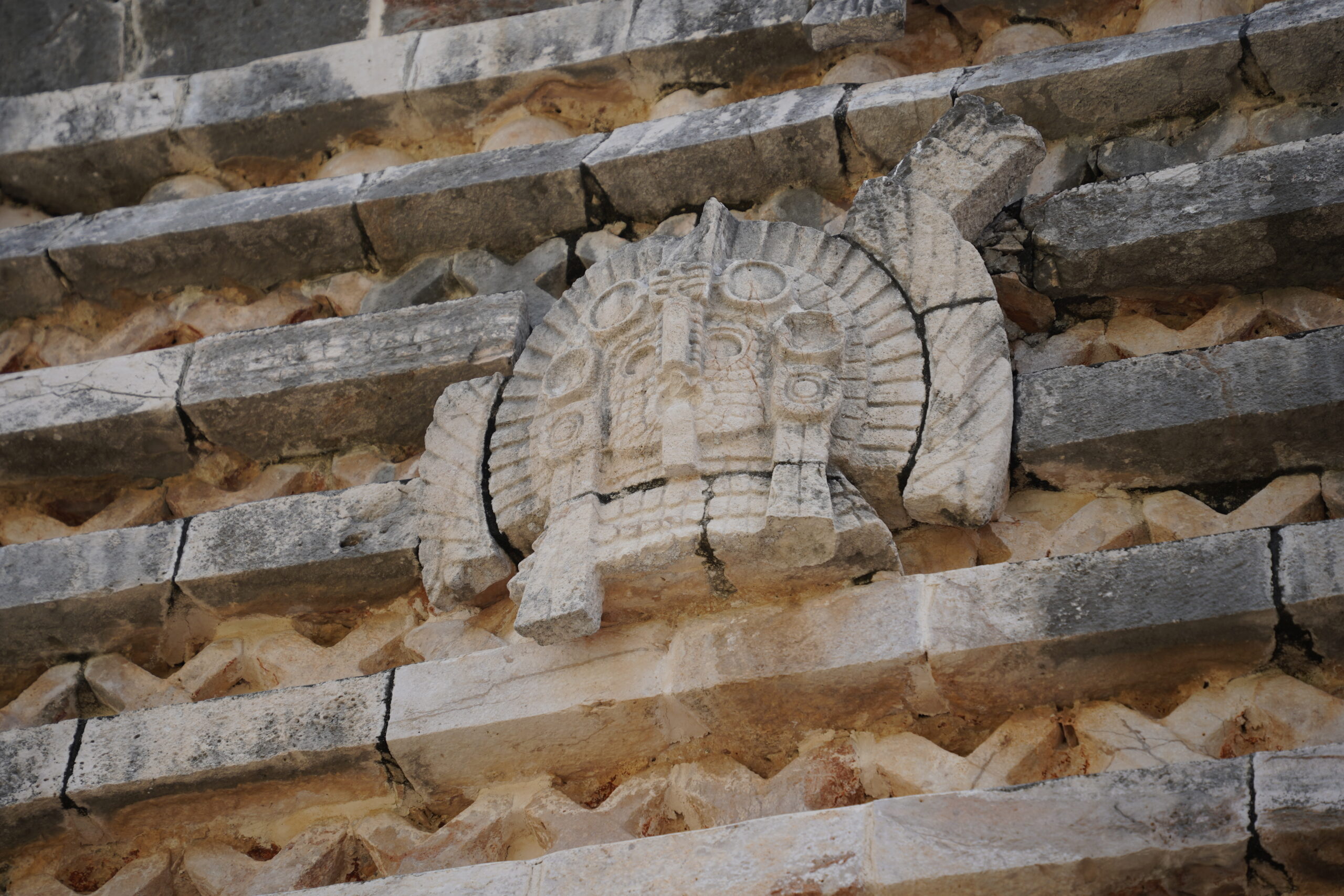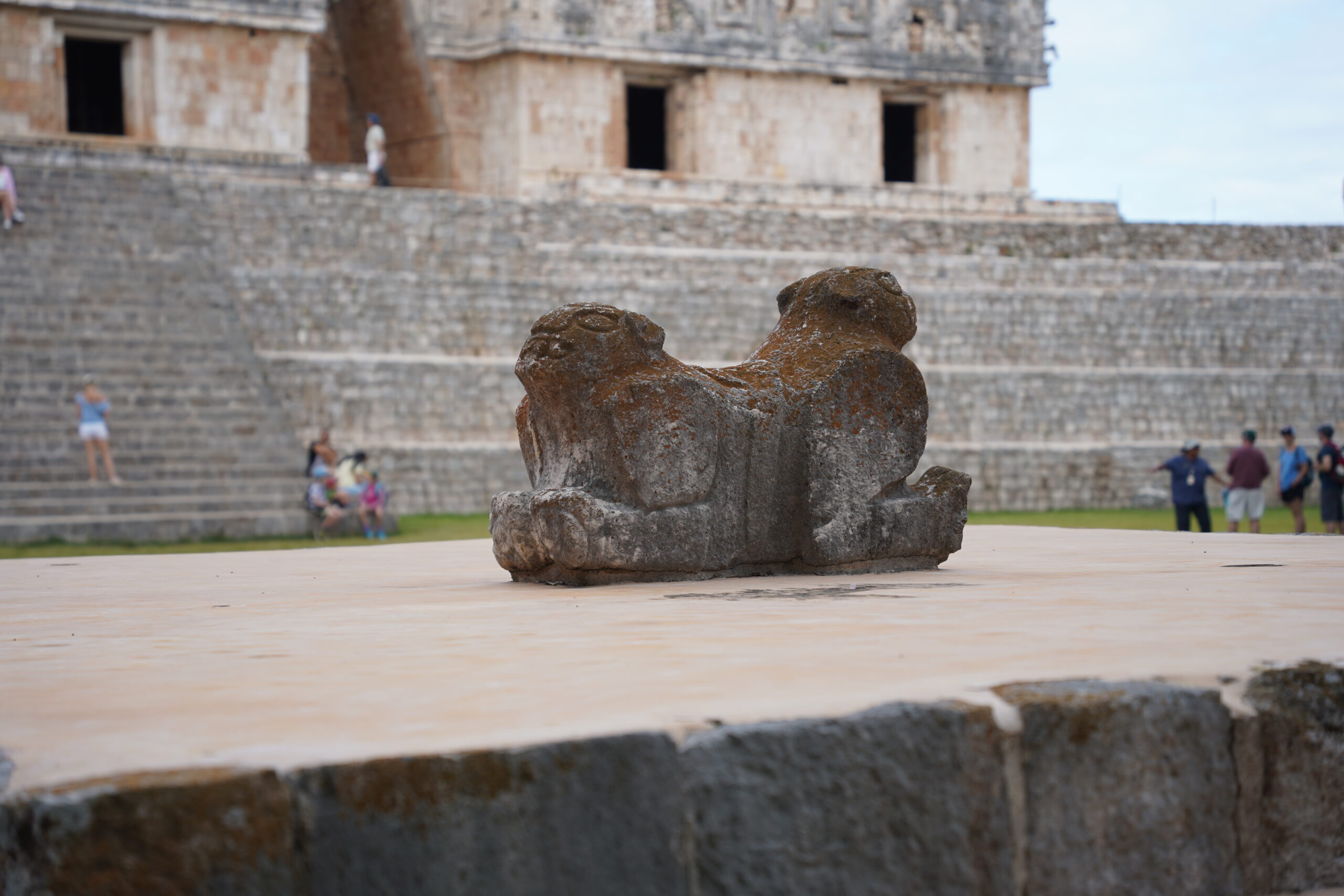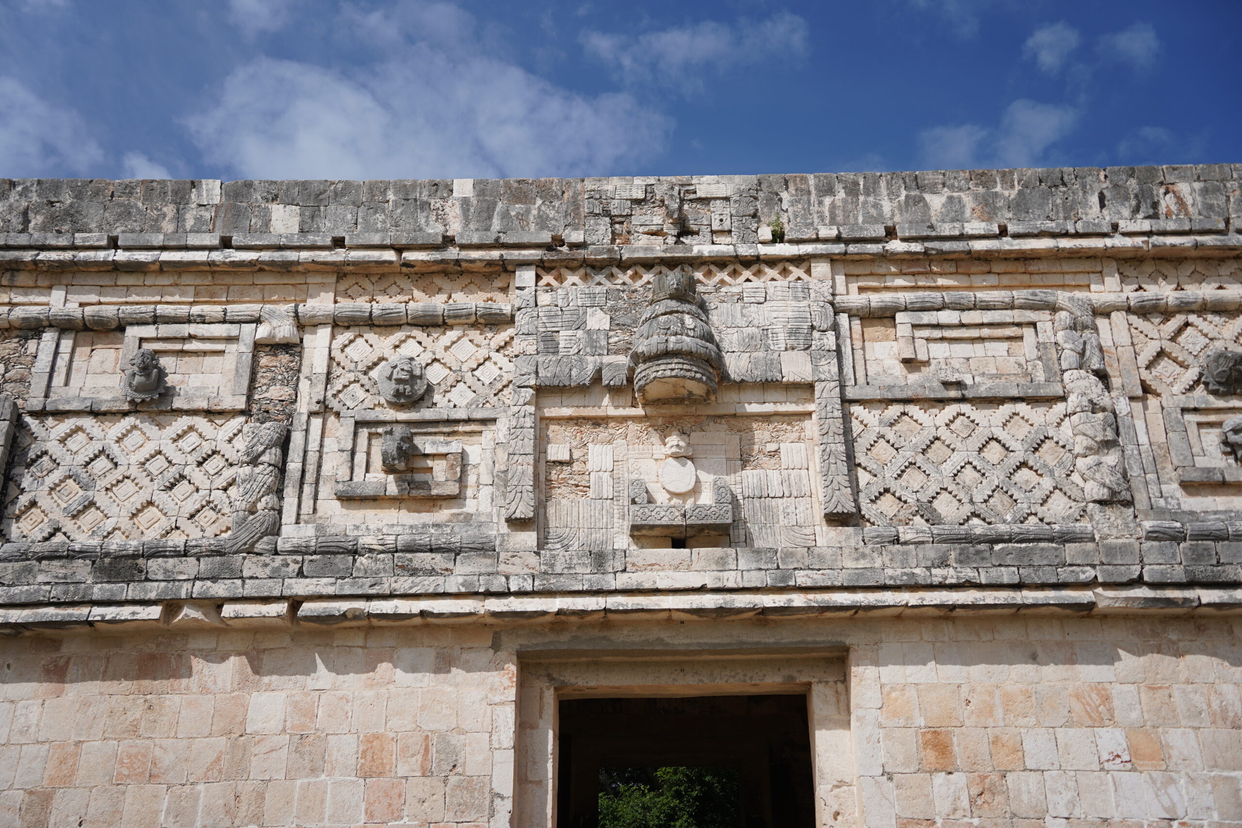 「総督の宮殿」の近くにある、他では見たこともないような珍しいスタイルの「亀の家」。その名の通り本当に亀の像が、上部ファサードの壁面に装飾されていて可愛らしい。マヤ語で「亀」を意味する言葉は、亀の甲羅から発せられる音、つまり自然の太鼓、嵐や雷鳴のような音と結び付けられている。亀は天空の太鼓であり、月とも関連がある。亀は雨や水の崇拝と、亀の甲羅で象徴される大地との関連から重要な存在だったそうだ。