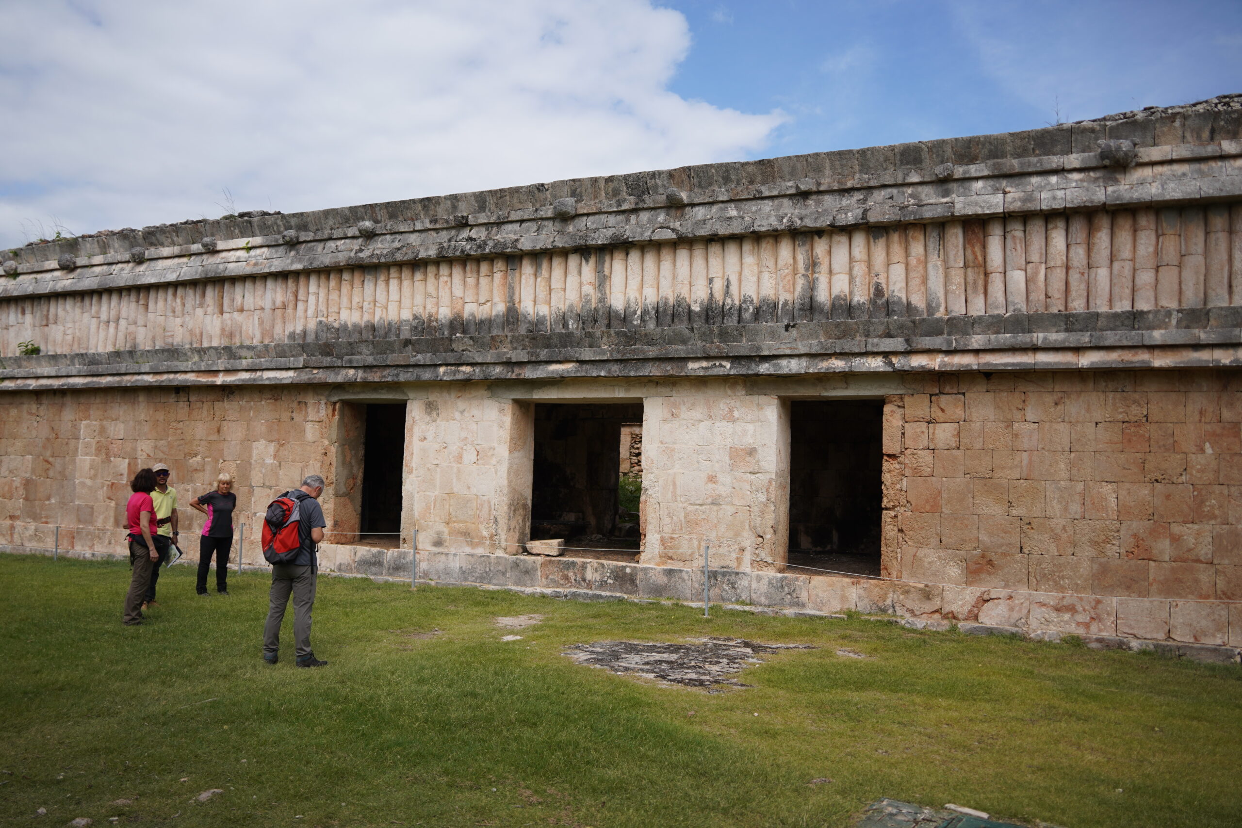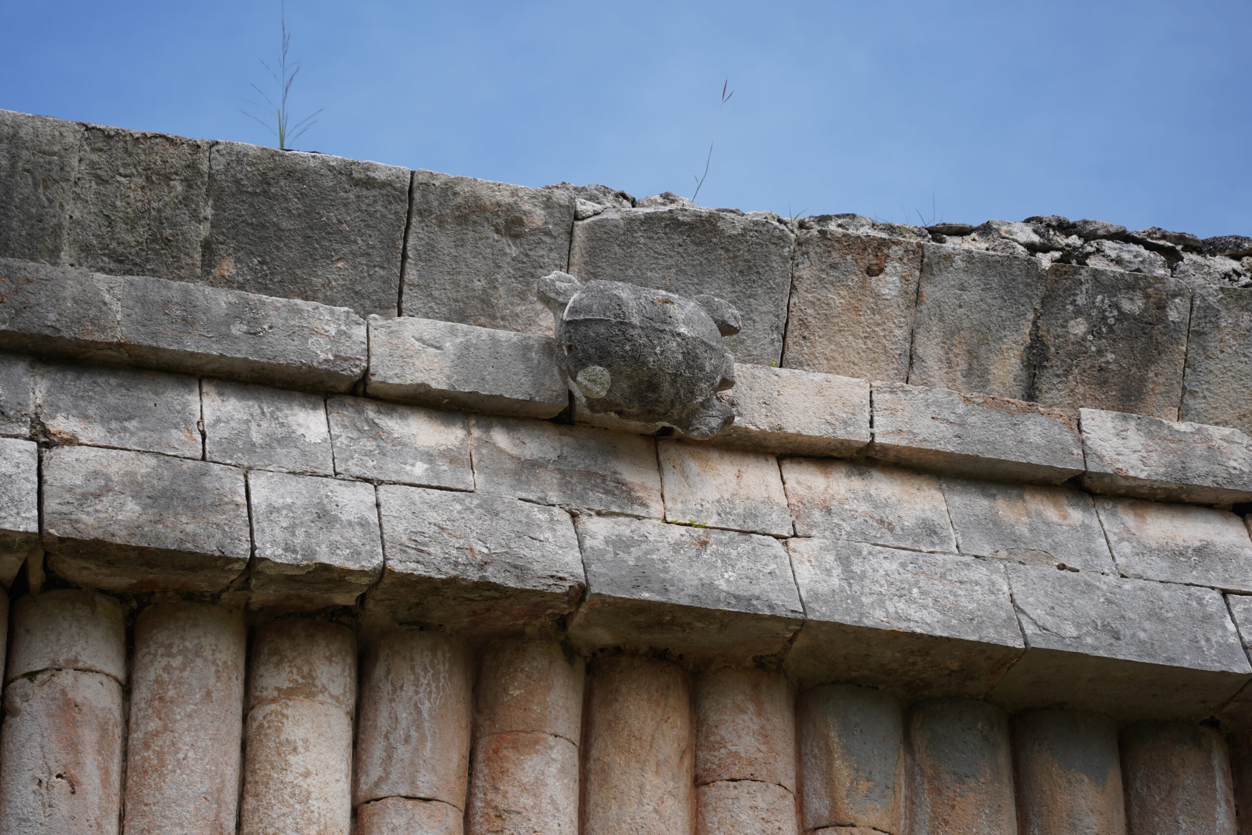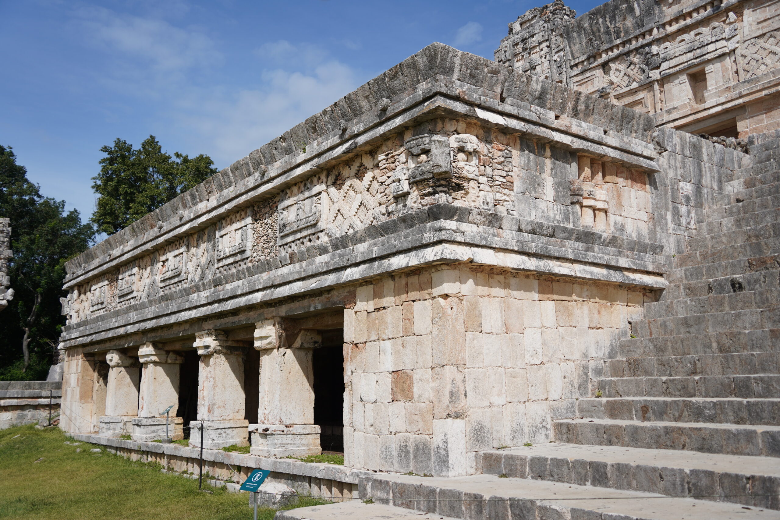 「総督の宮殿」の近くにある、他では見たこともないような珍しいスタイルの「亀の家」。その名の通り本当に亀の像が、上部ファサードの壁面に装飾されていて可愛らしい。マヤ語で「亀」を意味する言葉は、亀の甲羅から発せられる音、つまり自然の太鼓、嵐や雷鳴のような音と結び付けられている。亀は天空の太鼓であり、月とも関連がある。亀は雨や水の崇拝と、亀の甲羅で象徴される大地との関連から重要な存在だったそうだ。