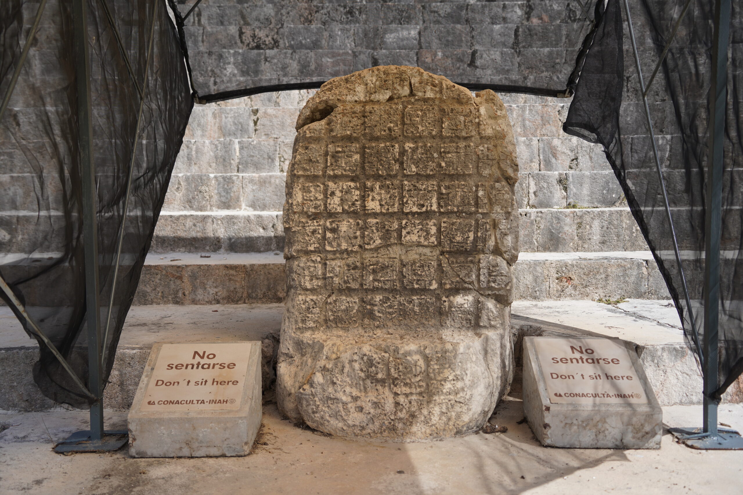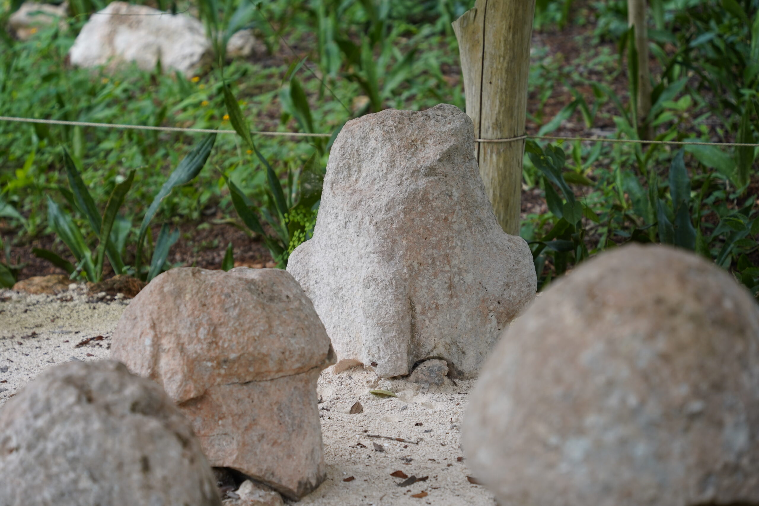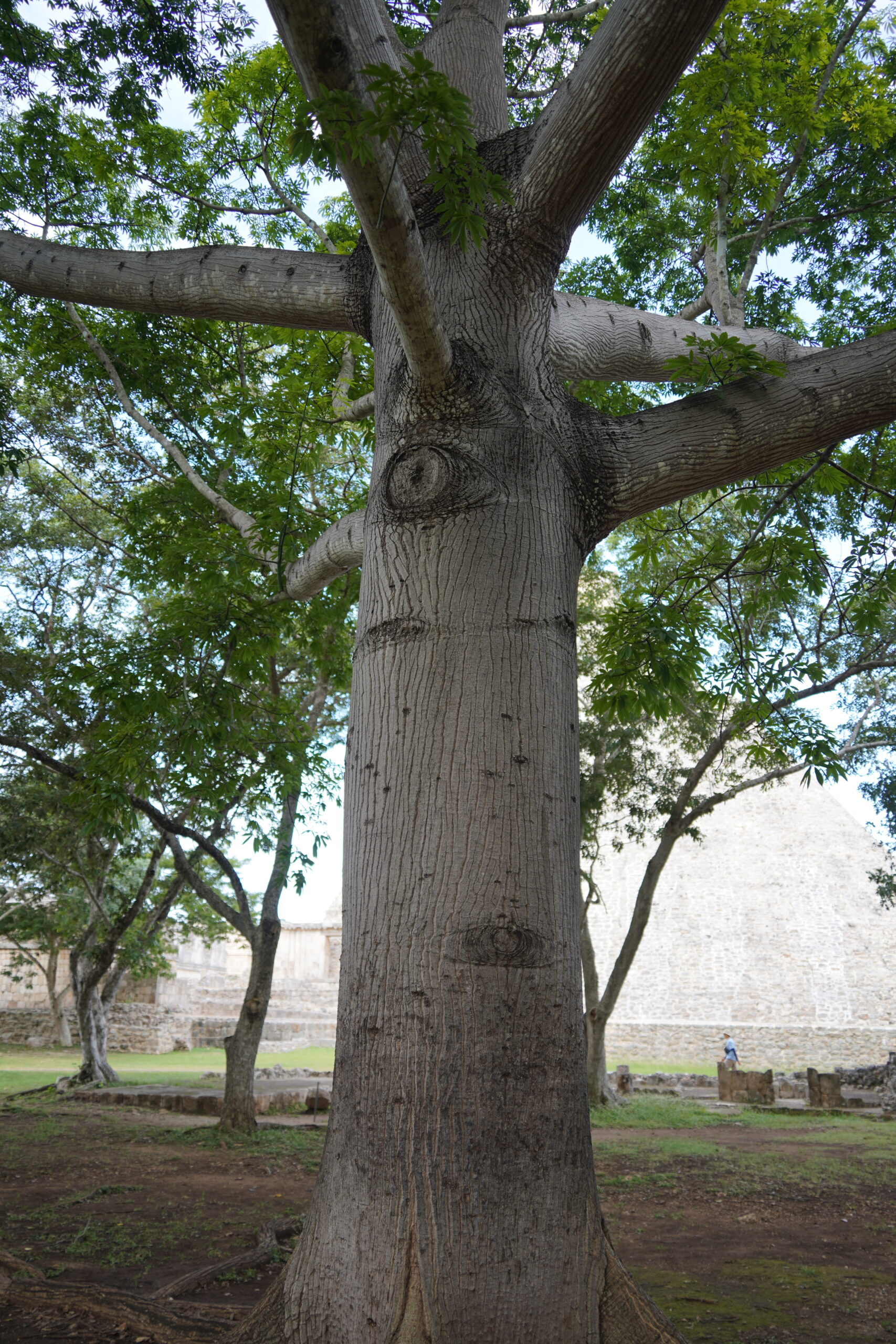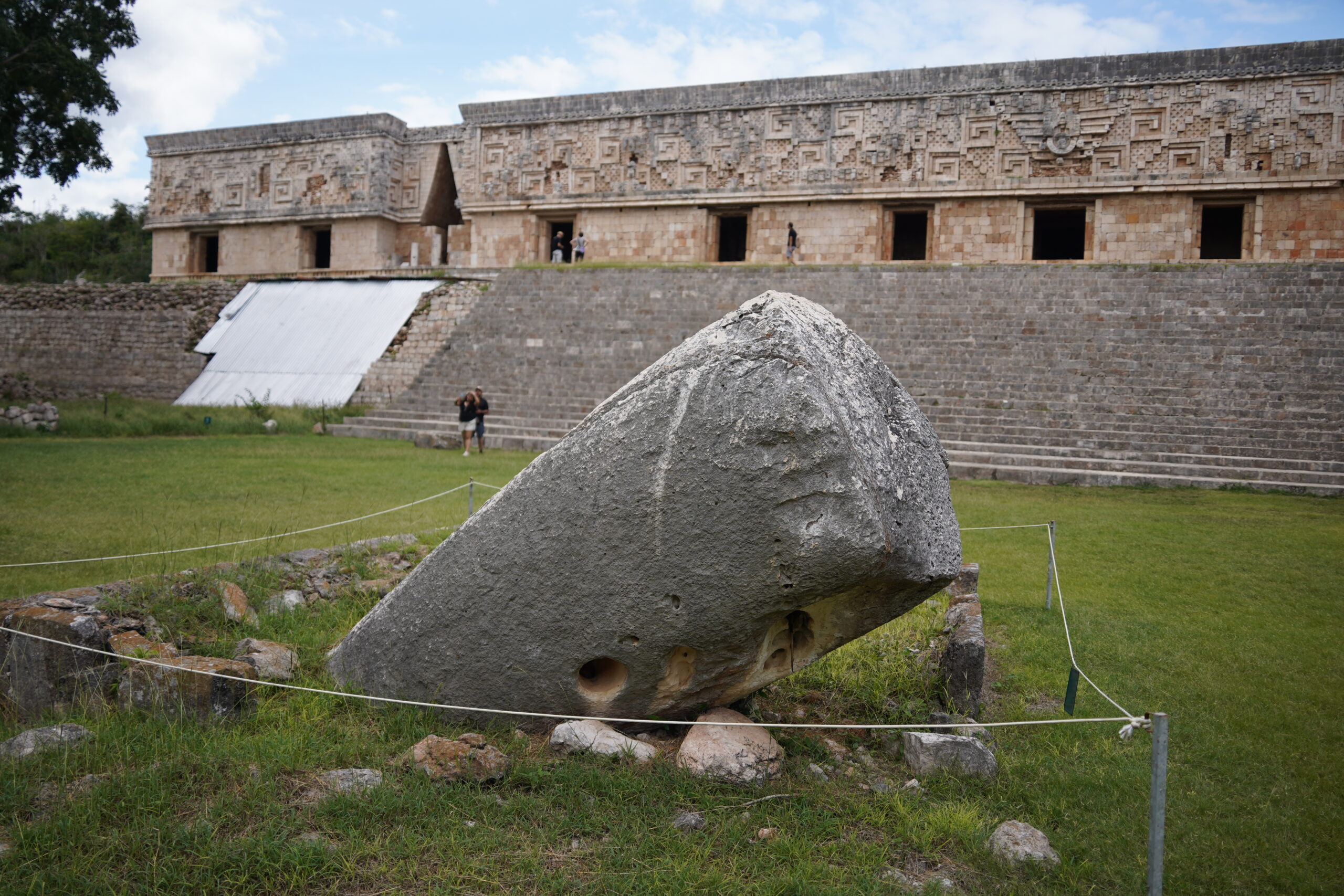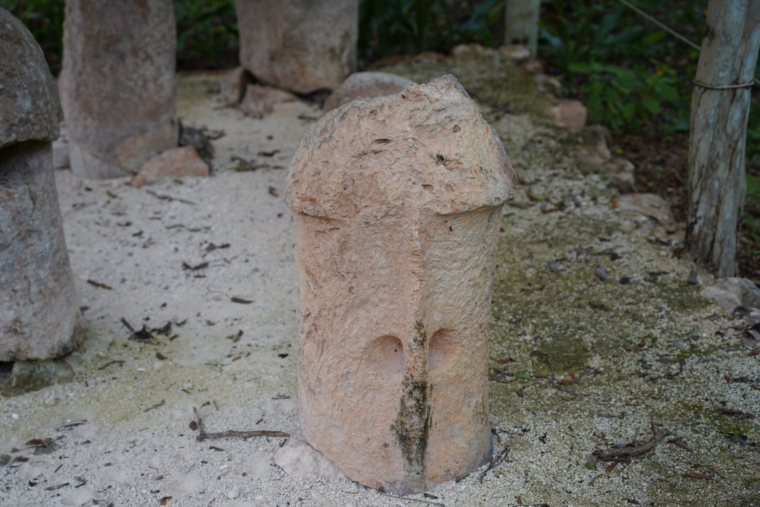 「魔法使いのピラミッド」の階段の下には、巨大な石棒が設置されている。「魔法使いのピラミッド」はこれまでメキシコで見てきた角ばった形状の古代ピラミッドとは異なる、丸みを帯びた特別に美しい形をしており、そのフォルムは女性らしいとも言われる。魔女の伝説、卵の伝説、楕円形の子宮的な形状から女性的なピラミッドであると認識されており、その対比として男性的な石棒=男根が置かれていたという説があるという。