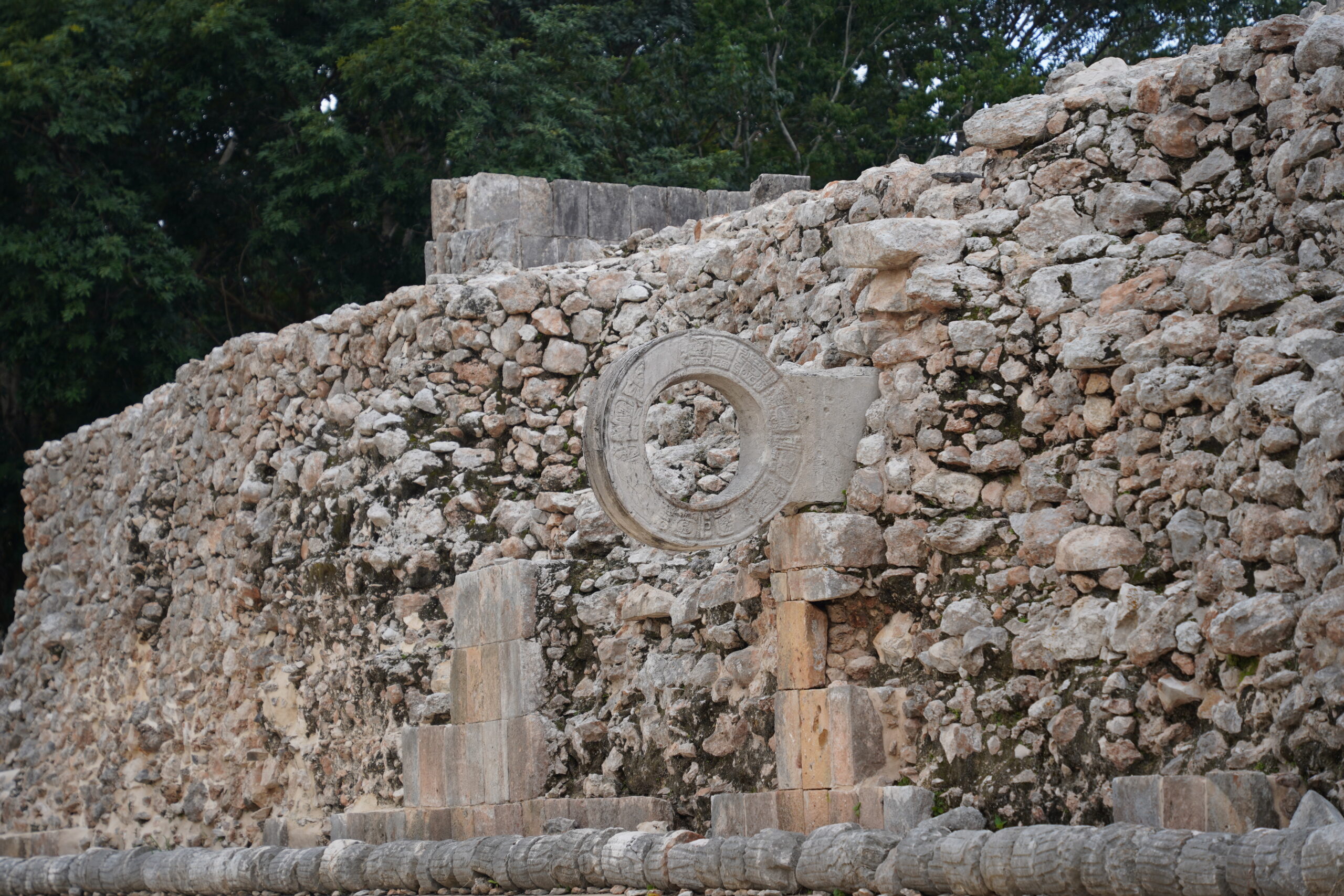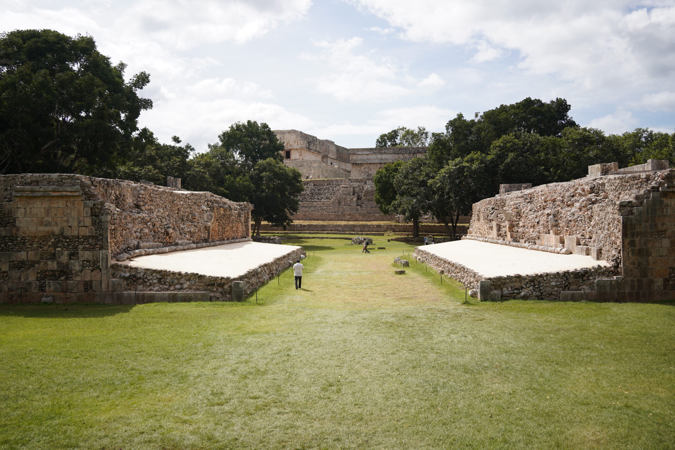 西暦800年から1000年頃に建てられたこの球技場は、南北に平行に建つ2つの建物で構成され長さ34メートル、幅10メートルの中庭を区切っている。この競技は特殊な防護服を着用した参加者が硬いゴム球を打ち合うことで行われ、目的はボールを動かし続け、できれば石の輪を通過させることだった。球技は占いと社会的地位を得るための儀式的な行為であり、ウシュマルでは支配者と結び付けられると同時に、捕虜の屈辱とも結び付けられている。メキシコのどこの古代遺跡へ行っても似たような球技場が見られたことから、広大な古代メキシコにおける不思議な共通点が見出された思いだった。