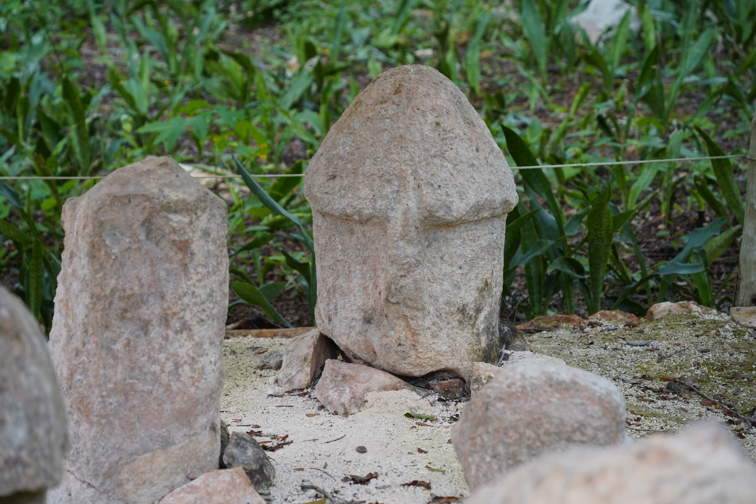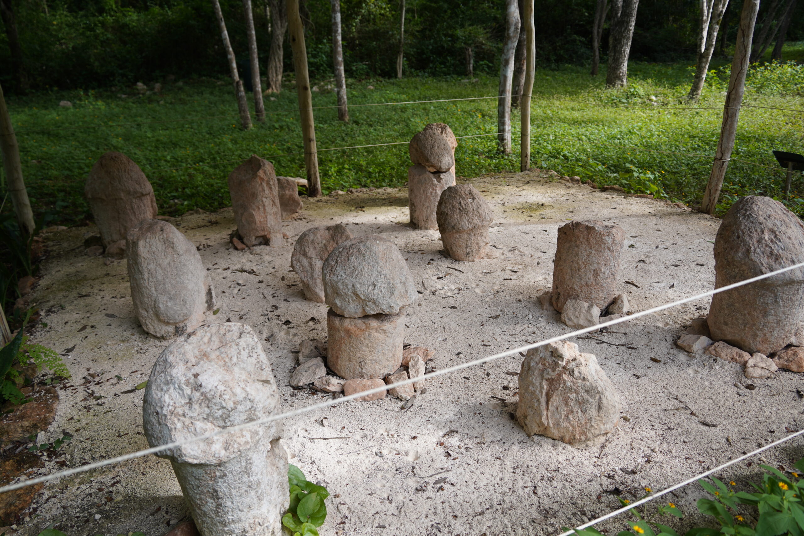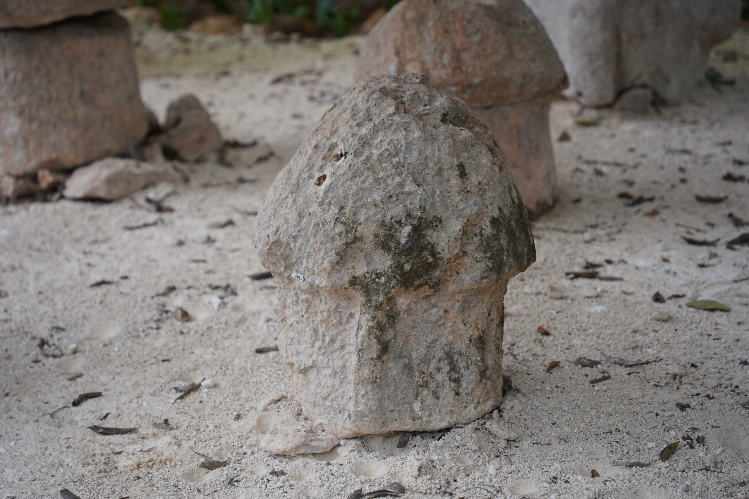 ま、ま、まさかの大地に並べられた無数の男根像!えーまさかこんなメキシコの森の中で出会ってしまうなんて!確かにさっきまでウシュマルには男根崇拝の気配がそこはかとなくしていたが、それはピラミッドの前の石棒とか宮殿の前の柱とか、全ての観光客が訪れる場所にあったのに、こんな風に誰も来ないような森の中の隠された場所でひとりきりで巡り会ってしまうなんて、何だか男根像に呼ばれた気さえしてしまった。